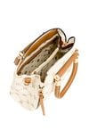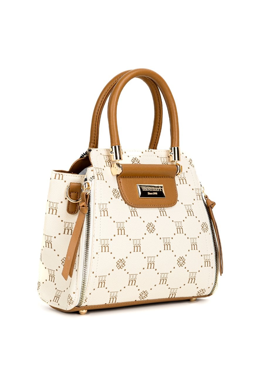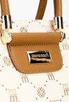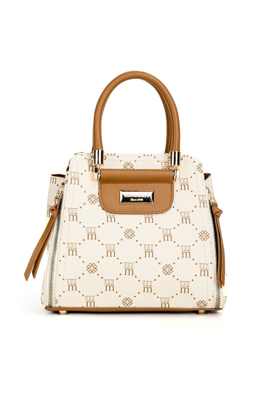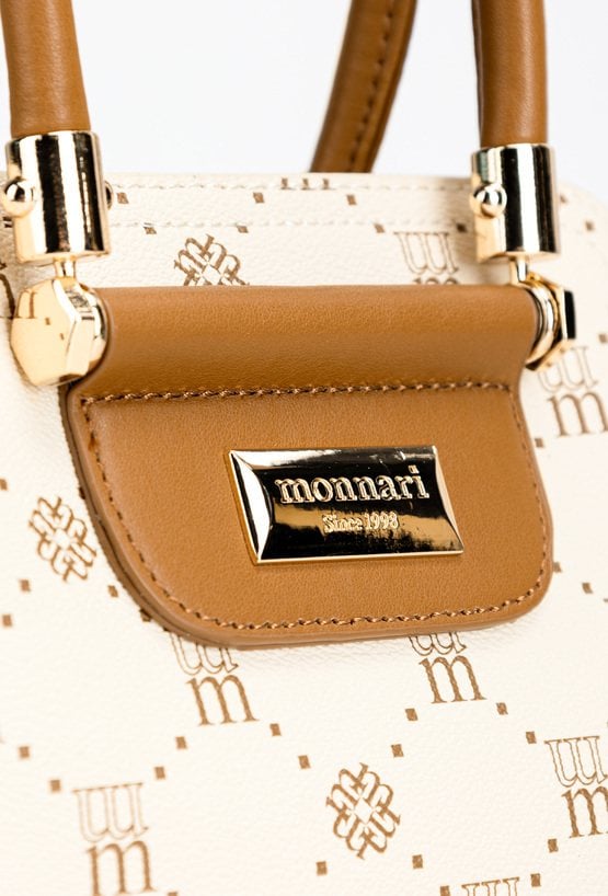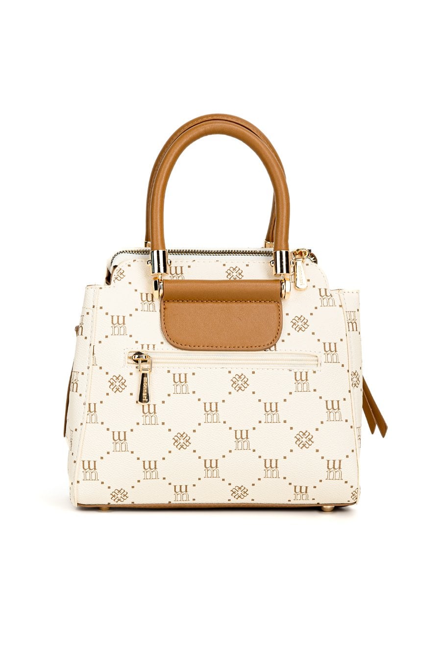 Mały kuferek damski z logowanym wzorem to elegancki i praktyczny dodatek na co dzień. Torba jest jednokomorowa, ma jasną, logowaną podszewkę oraz dodatkowe kieszonki na drobiazgi, które ułatwiają organizację. Torba zawieszona na małych, okrągłych rączkach, w zestawie ma odpinany, regulowany pasek. Torbę należy przechowywać w dołączonym woreczku. Wymiary: 23 cm x 21,5 cm x 11 cm.