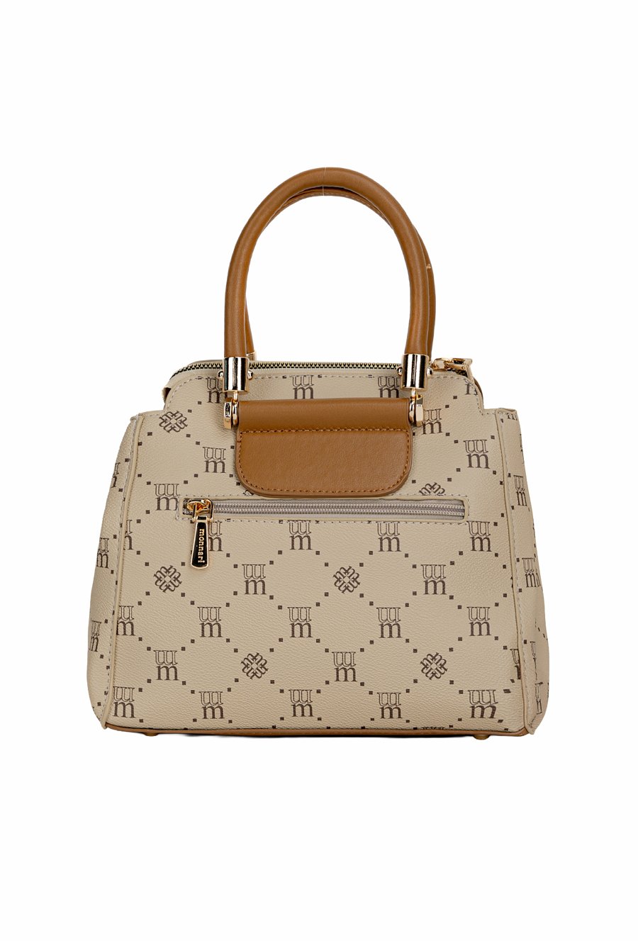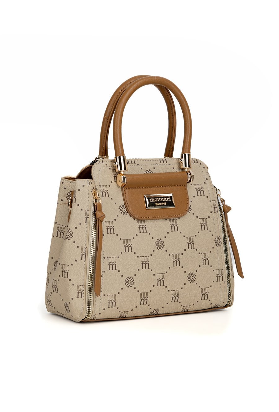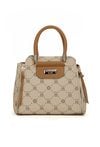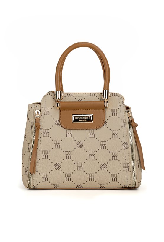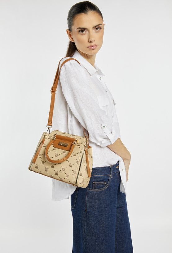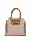 Mały kuferek damski z logowanym wzorem to elegancki i praktyczny dodatek na co dzień. Torba jest jednokomorowa, ma jasną, logowaną podszewkę oraz dodatkowe kieszonki na drobiazgi, które ułatwiają organizację. Torba zawieszona na małych, okrągłych rączkach, w zestawie ma odpinany, regulowany pasek. Torbę należy przechowywać w dołączonym woreczku. Wymiary: 23 cm x 21,5 cm x 11 cm.