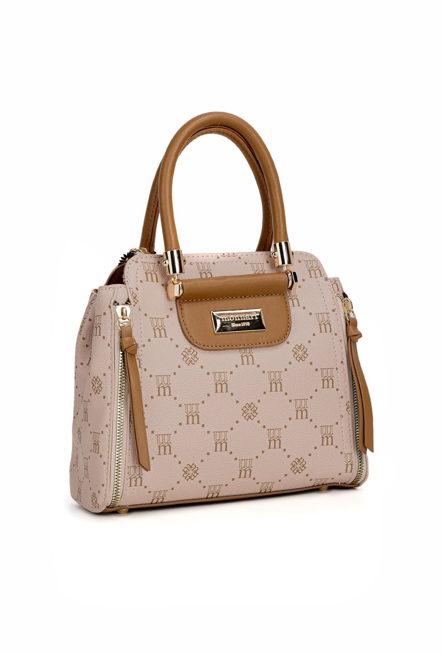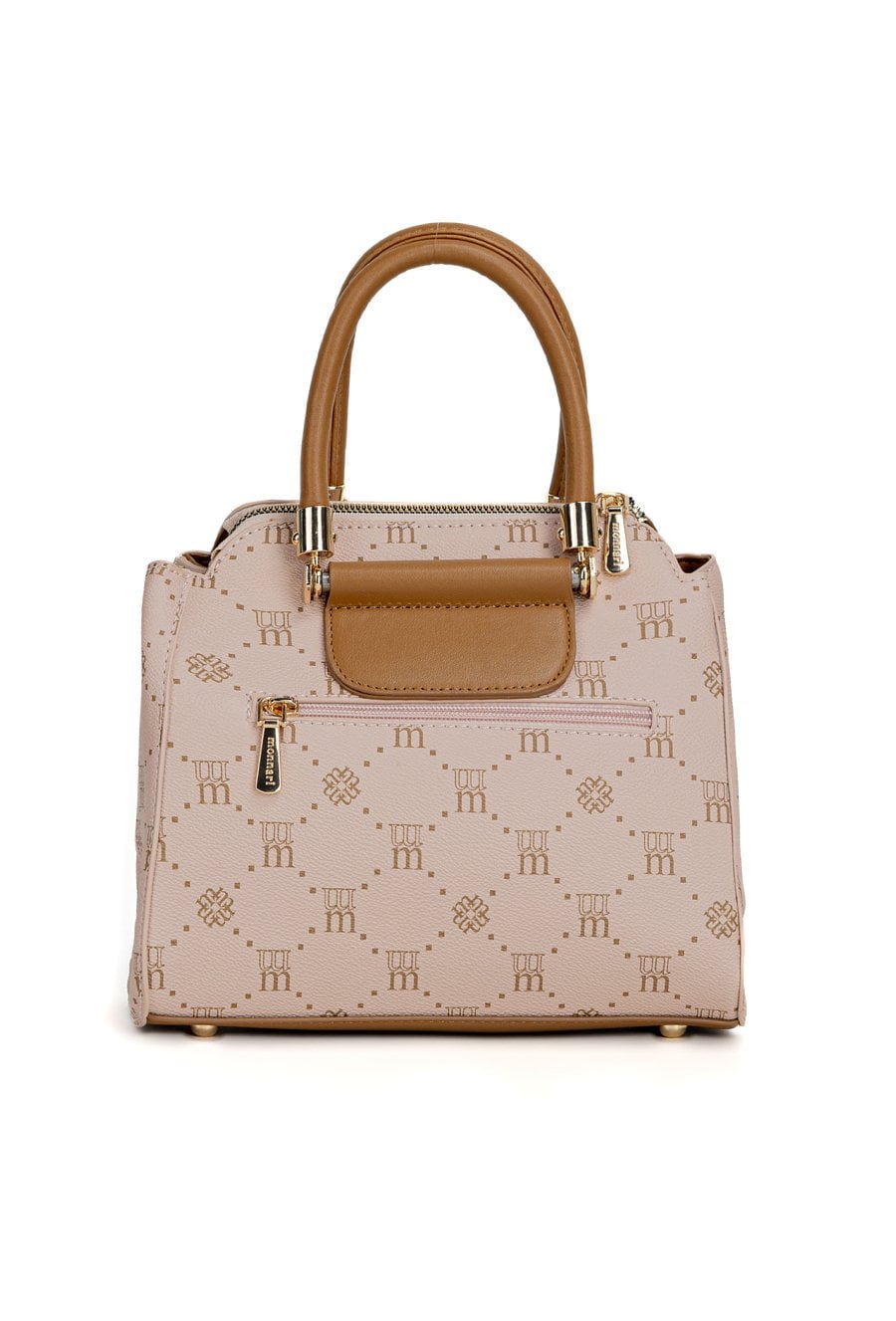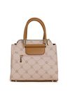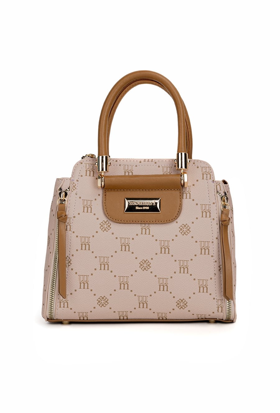 Mały kuferek damski z logowanym wzorem to elegancki i praktyczny dodatek na co dzień. Torba jest jednokomorowa, ma jasną, logowaną podszewkę oraz dodatkowe kieszonki na drobiazgi, które ułatwiają organizację. Torba zawieszona na małych, okrągłych rączkach, w zestawie ma odpinany, regulowany pasek. Torbę należy przechowywać w dołączonym woreczku. Wymiary: 23 cm x 21,5 cm x 11 cm.