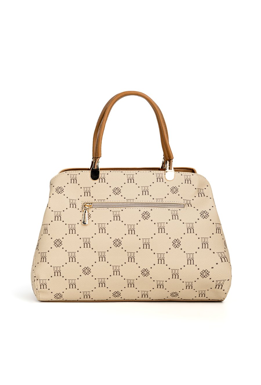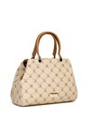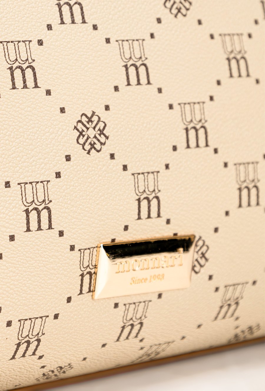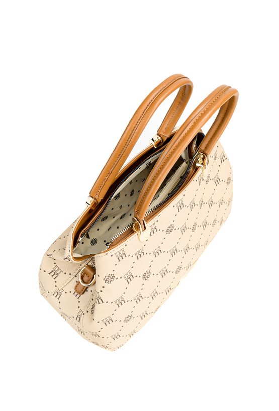 Torba damska z logowanym wzorem na całej powierzchni. Torba jest jednokomorowa, ma jasną, logowaną podszewkę oraz dodatkowe kieszonki na drobiazgi, które ułatwiają organizację. Torba zawieszona na wygodnych rączkach, w zestawie ma odpinany, regulowany pasek. Torbę należy przechowywać w dołączonym woreczku. Wymiary: 32 cm x 23 cm x 11 cm.