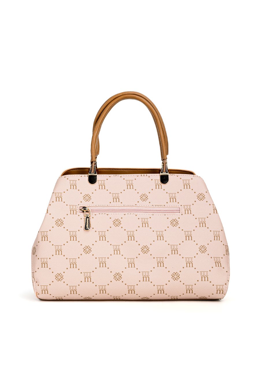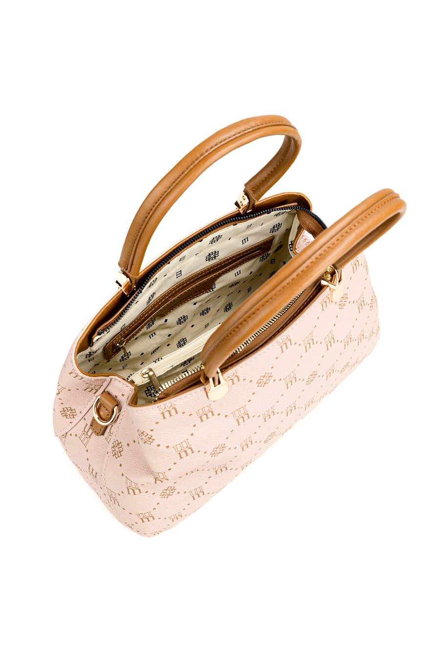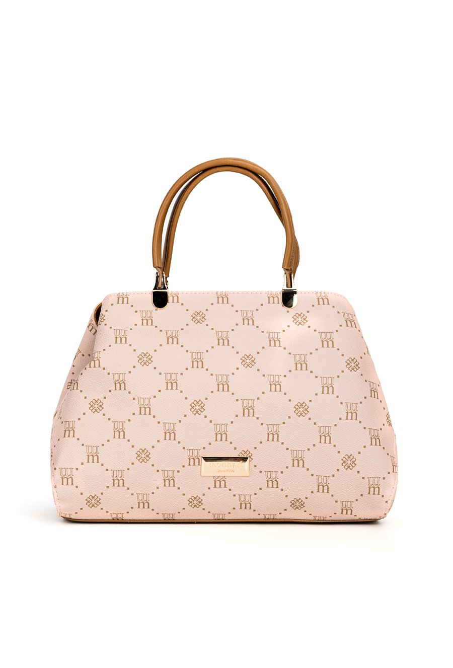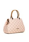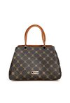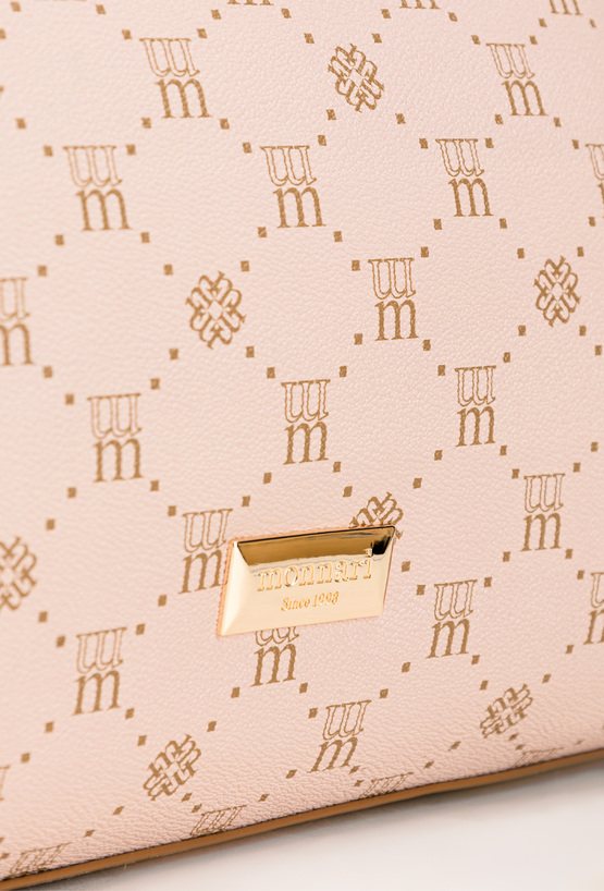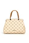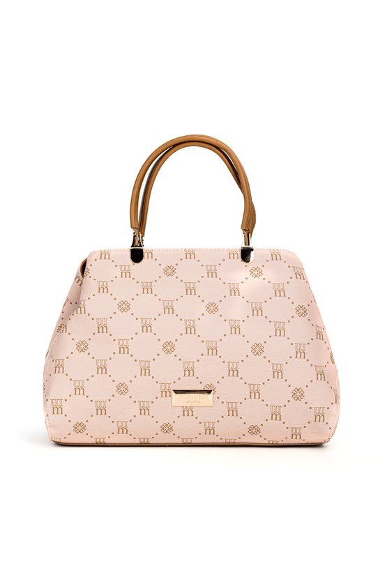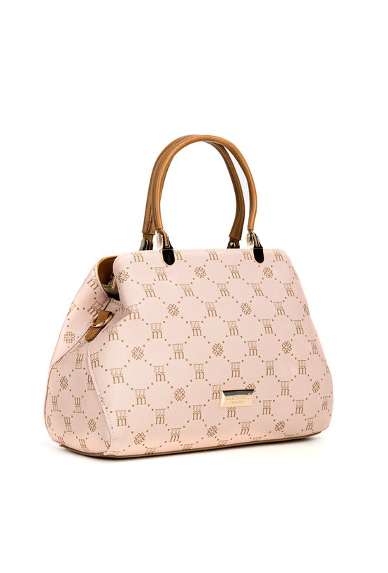 Torba damska z logowanym wzorem na całej powierzchni. Torba jest jednokomorowa, ma jasną, logowaną podszewkę oraz dodatkowe kieszonki na drobiazgi, które ułatwiają organizację. Torba zawieszona na wygodnych rączkach, w zestawie ma odpinany, regulowany pasek. Torbę należy przechowywać w dołączonym woreczku. Wymiary: 32 cm x 23 cm x 11 cm.