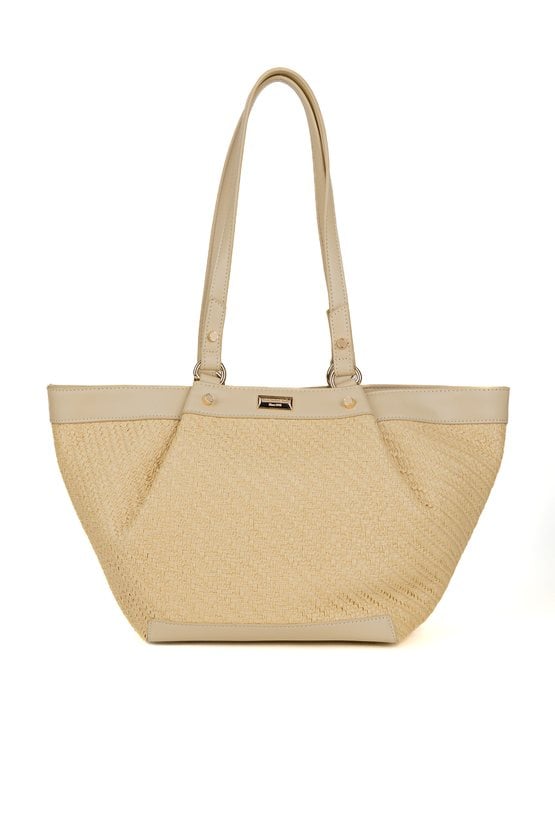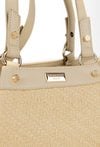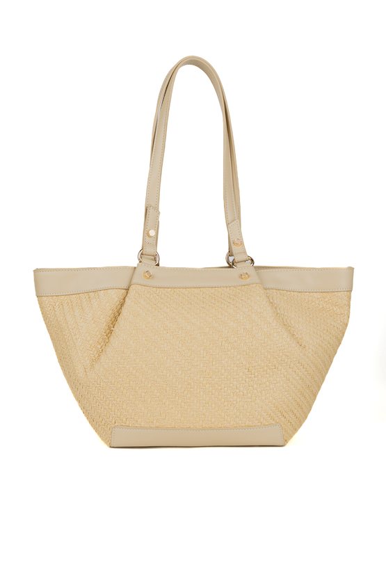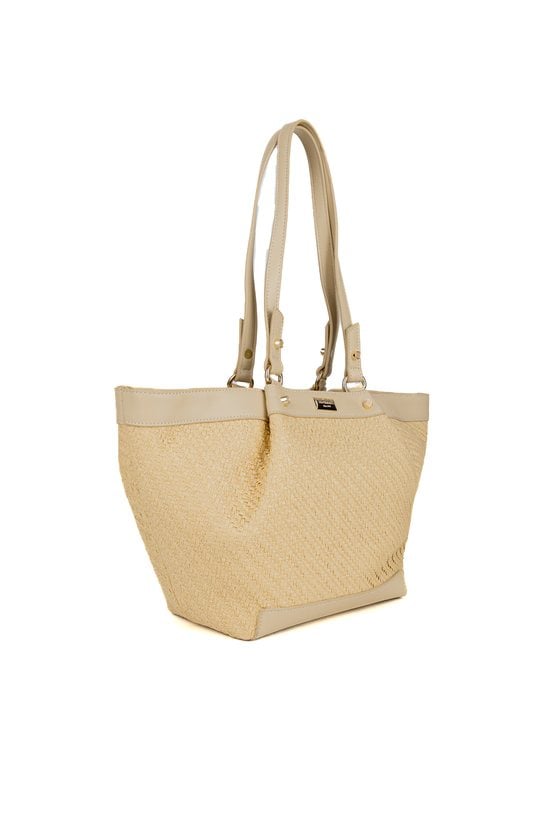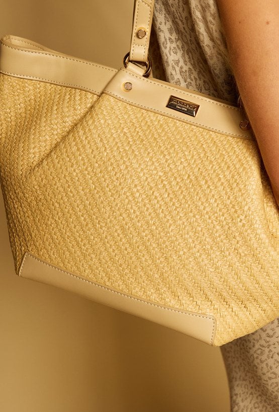 Duży koszyk damski z efektowną plecionką, idealny na letnie stylizacje. Torba jednokomorowa, z jasną, logowaną podszewką oraz dodatkowymi kieszonkami na drobiazgi. Model zapinany na napy i suwak, co gwarantuje wygodę i bezpieczeństwo przechowywania. Torba zawieszona na rączkach. Torbę należy przechowywać w załączonym woreczku. Wymiary: 44 cm x 25 cm x 12 cm.