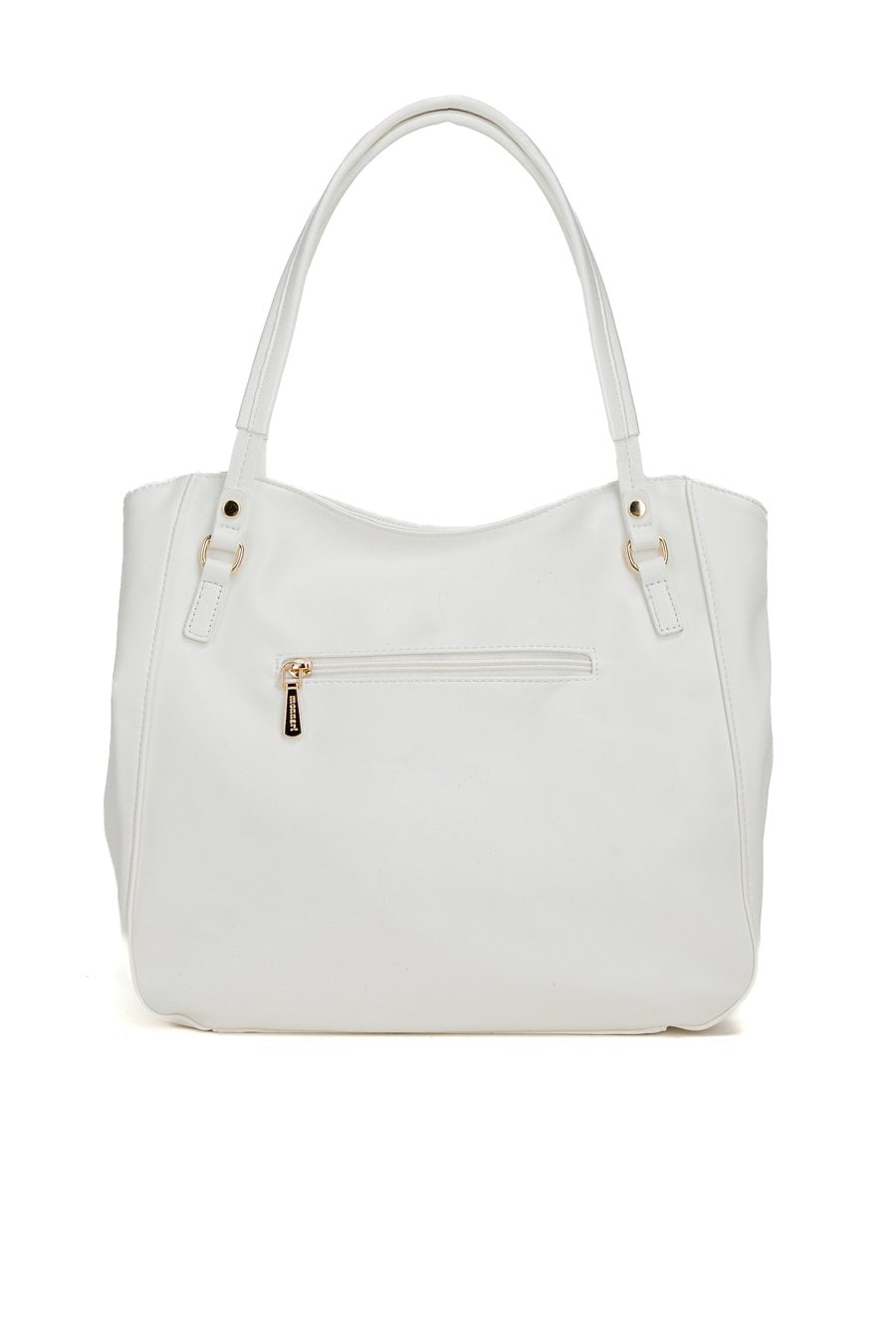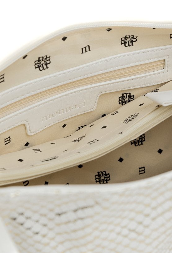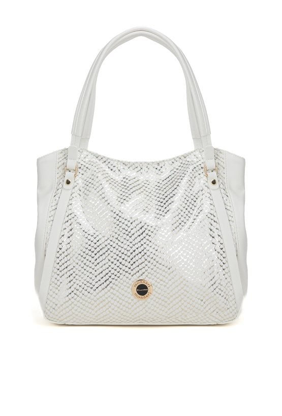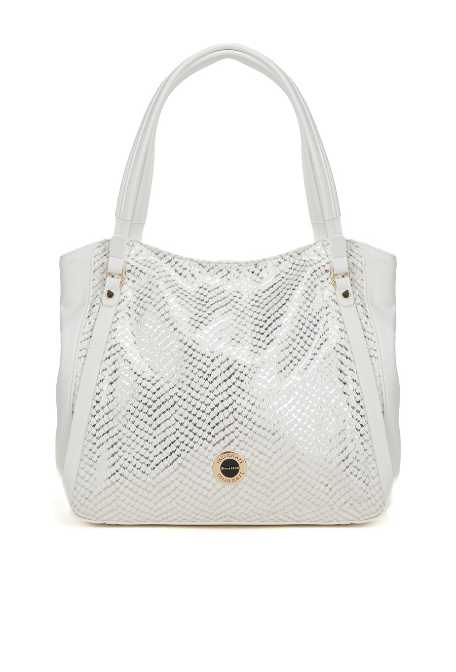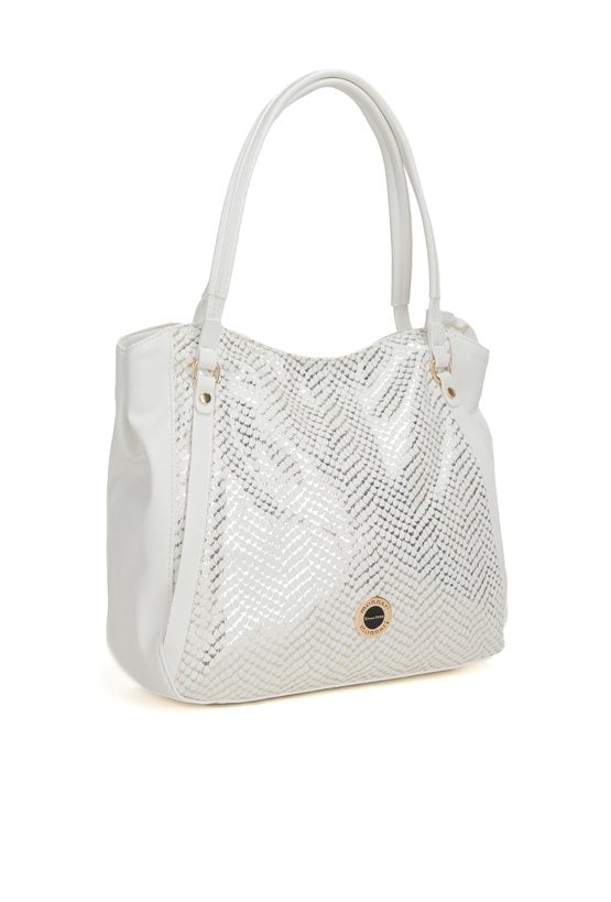 Duży shopper damski o wymiarach 38 cm x 30 cm x 15 cm z efektownym wzorem. Torba jednokomorowa, z jasną, logowaną podszewką oraz dodatkowymi kieszonkami na drobiazgi. Atutem modelu jest praktyczna kieszonka dzieląca wnętrze na dwie komory, co znacznie ułatwia organizację. Torba zawieszona na rączkach, a w zestawie znajduje się pasek z regulacją. Torbę należy przechowywać w załączonym woreczku.