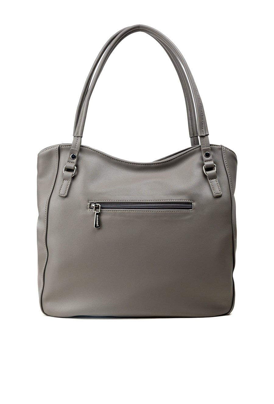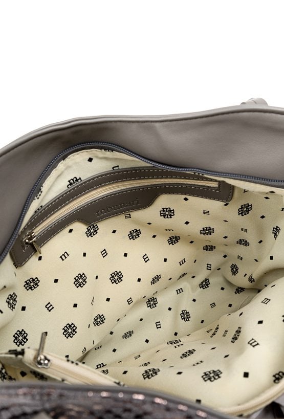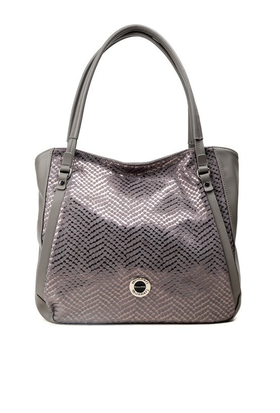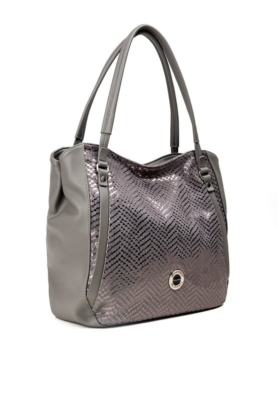 Duży shopper damski o wymiarach 38 cm x 30 cm x 15 cm z efektownym wzorem. Torba jednokomorowa, z jasną, logowaną podszewką oraz dodatkowymi kieszonkami na drobiazgi. Atutem modelu jest praktyczna kieszonka dzieląca wnętrze na dwie komory, co znacznie ułatwia organizację. Torba zawieszona na rączkach, a w zestawie znajduje się pasek z regulacją. Torbę należy przechowywać w załączonym woreczku.