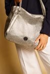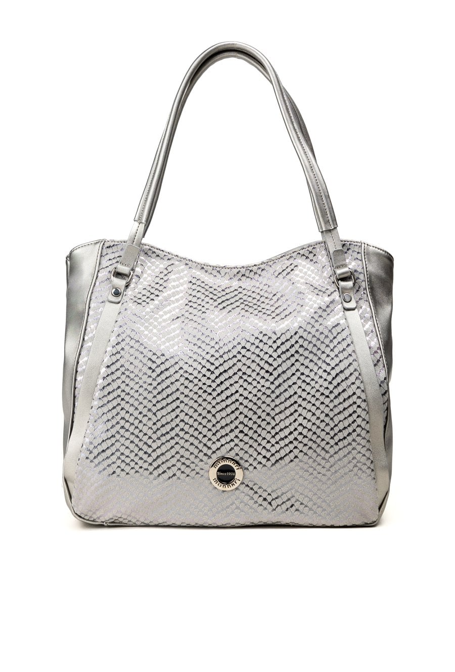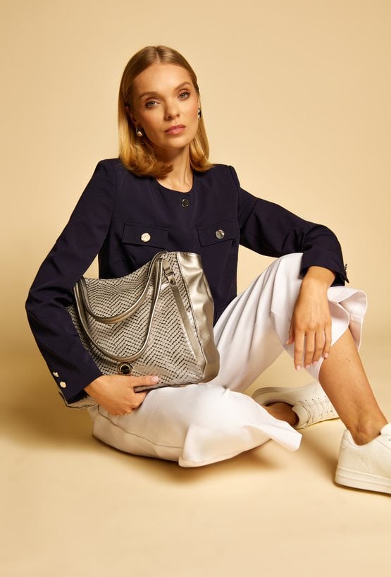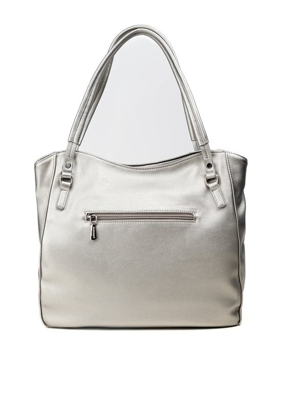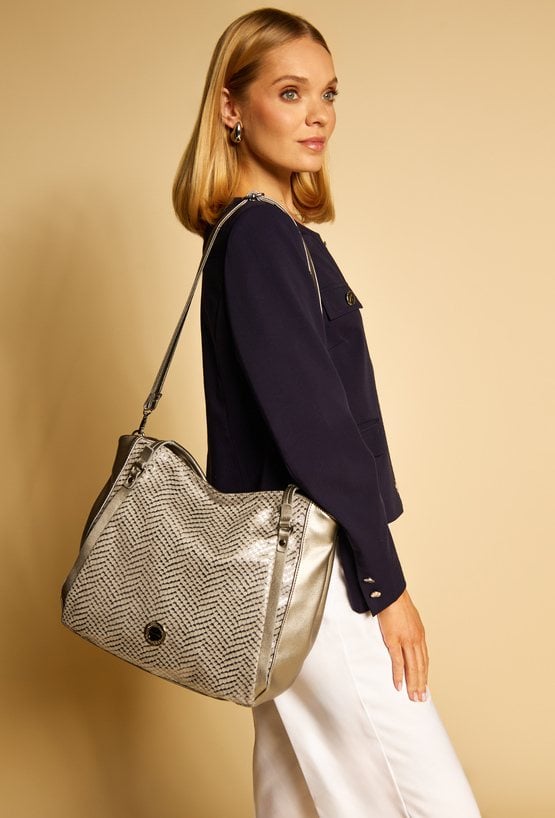 Duży shopper damski o wymiarach 38 cm x 30 cm x 15 cm z efektownym wzorem. Torba jednokomorowa, z jasną, logowaną podszewką oraz dodatkowymi kieszonkami na drobiazgi. Atutem modelu jest praktyczna kieszonka dzieląca wnętrze na dwie komory, co znacznie ułatwia organizację. Torba zawieszona na rączkach, a w zestawie znajduje się pasek z regulacją. Torbę należy przechowywać w załączonym woreczku.