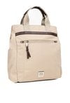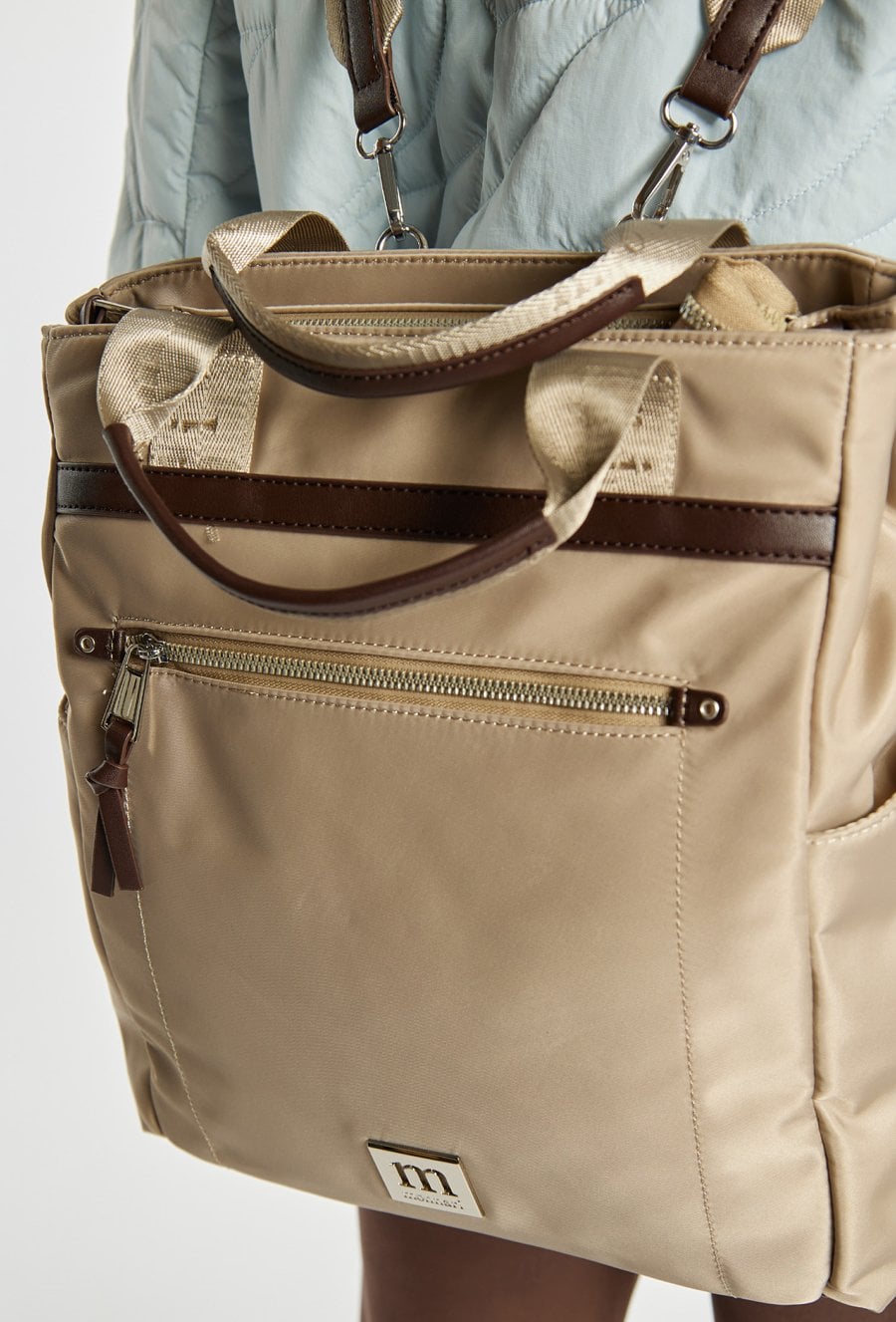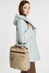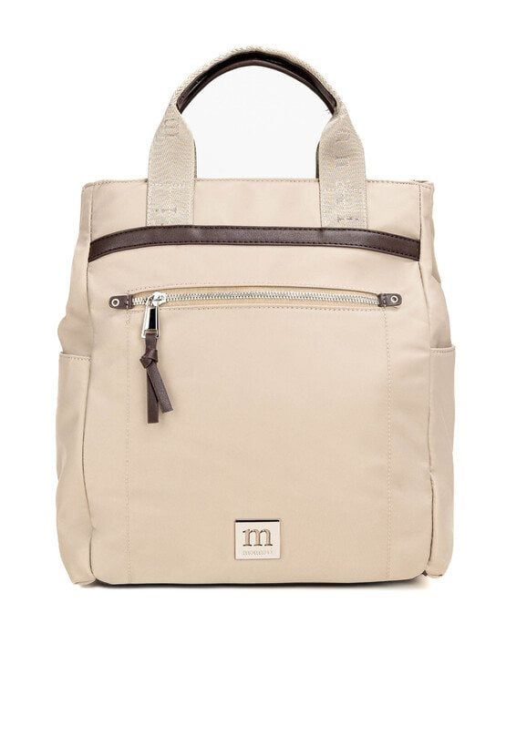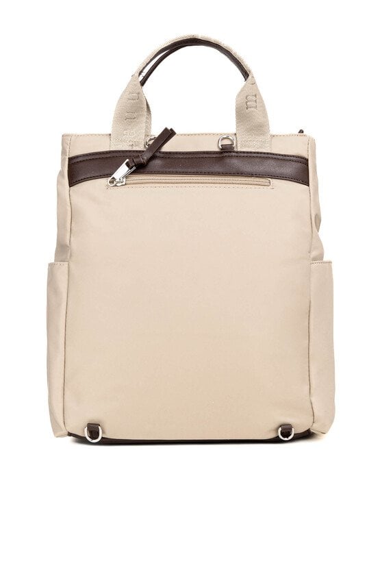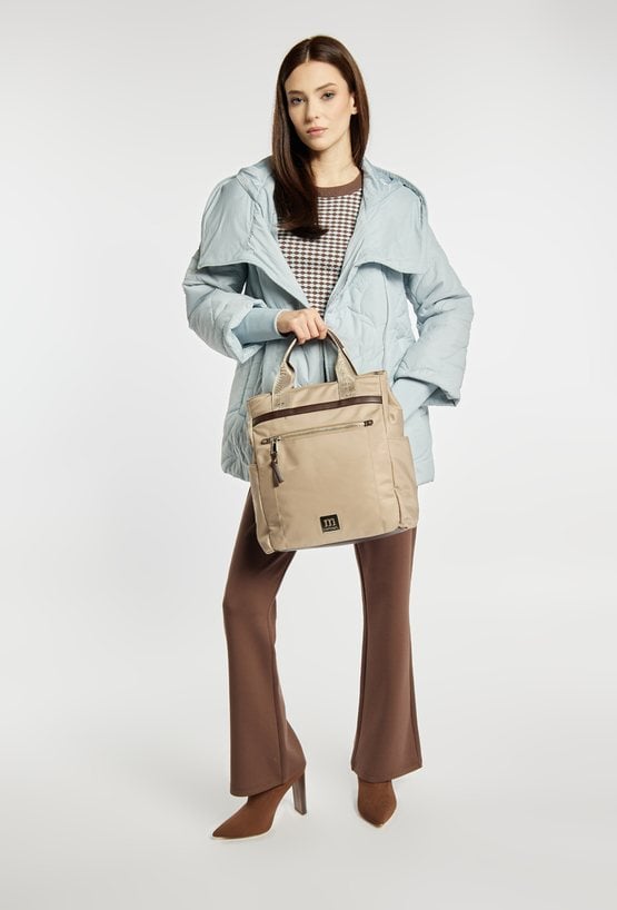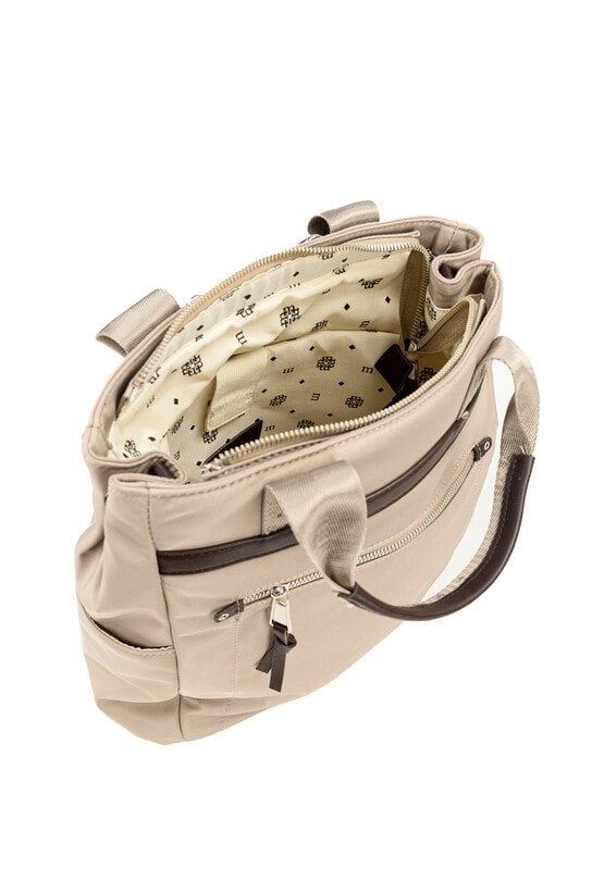 Pojemna torba damska o jednokomorowej konstrukcji i jasnym, logowanym wnętrzu. Zawieszona na rączkach, zapewnia wygodę noszenia w dłoni. Jej atutem jest odpinany pasek, który pozwala nosić torbę przez ramię lub w formie plecaka, w zależności od potrzeb. Torbę należy przechowywać w dołączonym woreczku