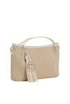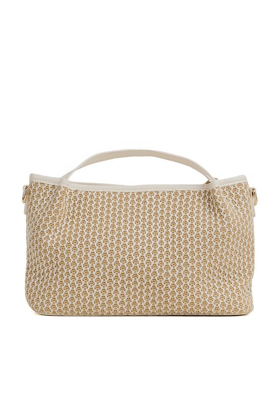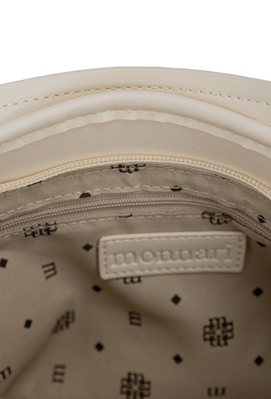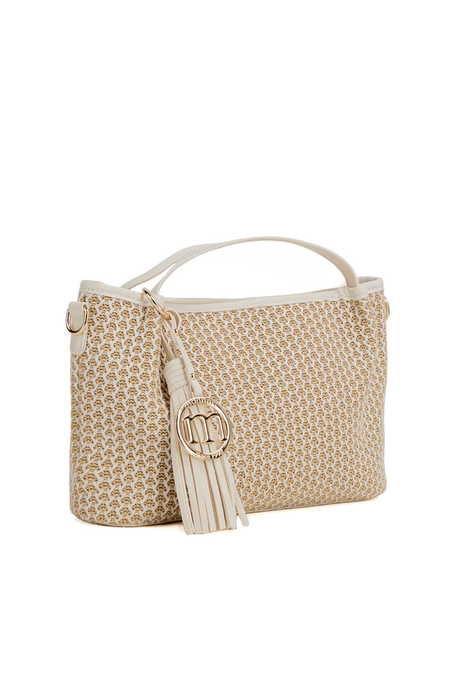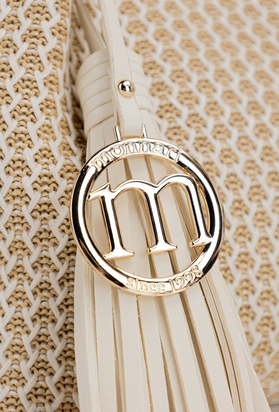 Koszyk damski z plecionką o wymiarach 33 × 18,5 × 8 cm. Jednokomorowy model z jasną, logowaną podszewką oraz dodatkowymi kieszonkami na drobiazgi. Koszyk zawieszony na rączkach, przy jednej z nich znajdują się frędzle oraz logo marki Monnari. Torbę należy przechowywać w dołączonym woreczku.