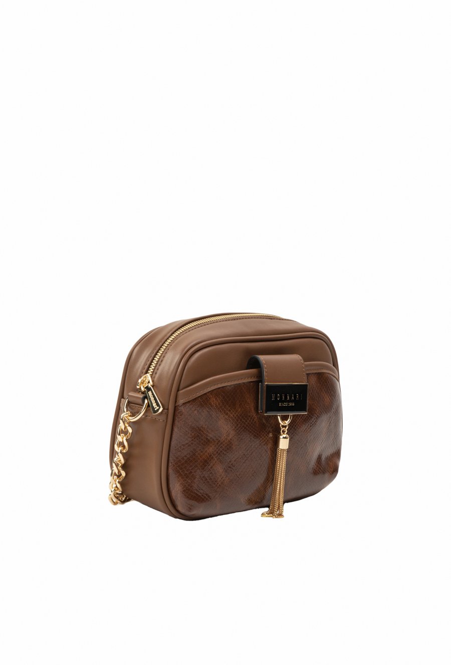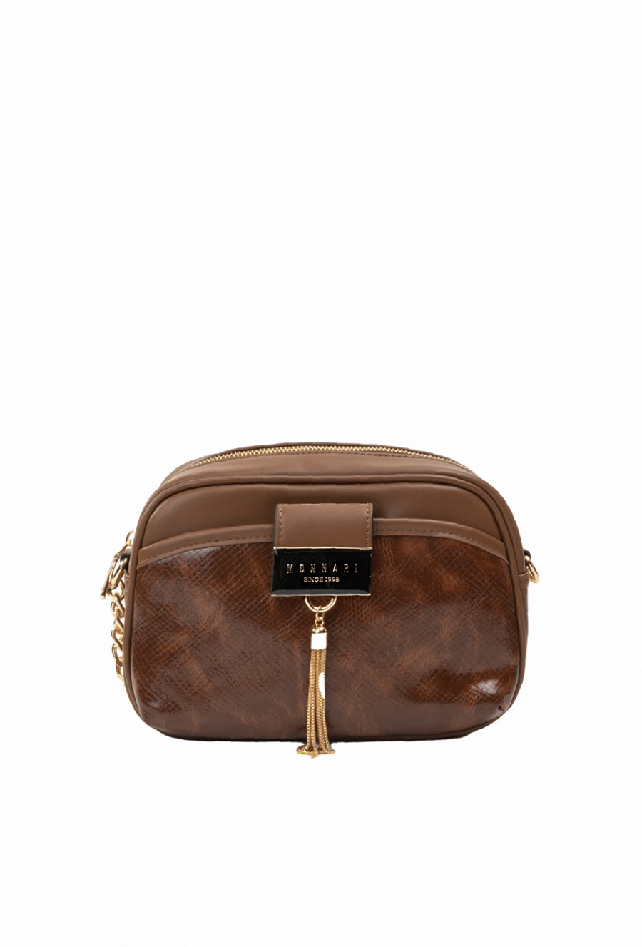 Torba damska crossbody z wzorzystą kieszonką z klapą z logo marki Monnari na przodzie. Torba jednokomorowa z jasną podszewką oraz kieszonkami na drobiazgi, zawieszona na pasku z elementem łańcuszka, zapinana od góry na suwak. Torbę należy przechowywać w załączonym woreczku. Wymiary torby: 25 cm x 16 cm x 7 cm