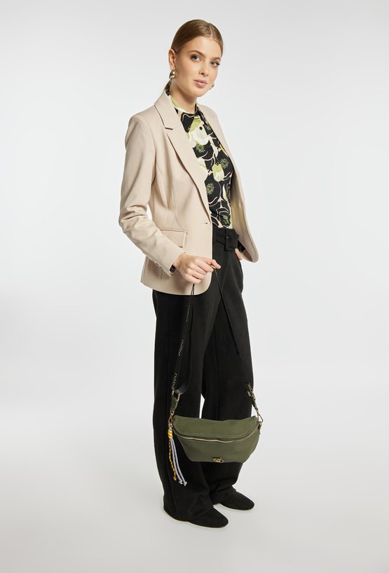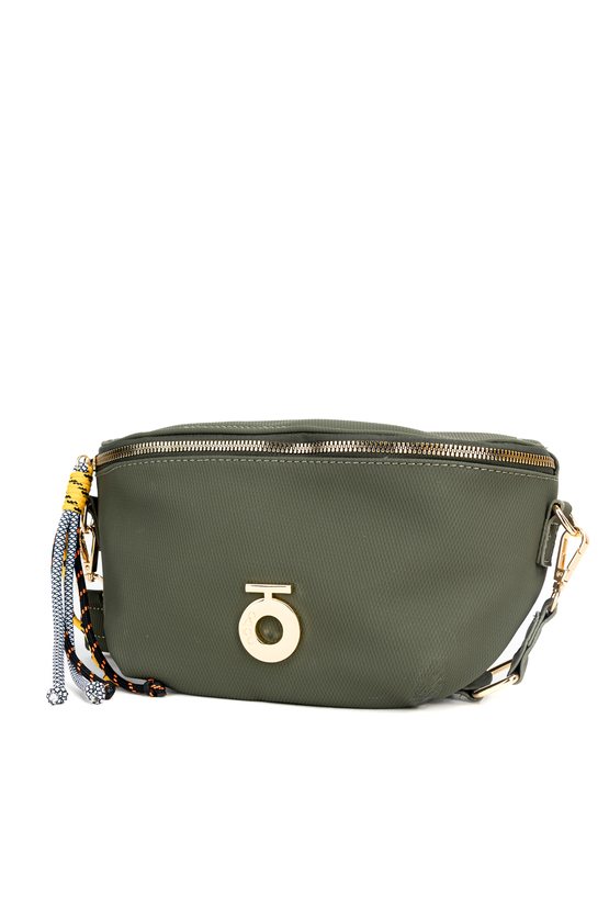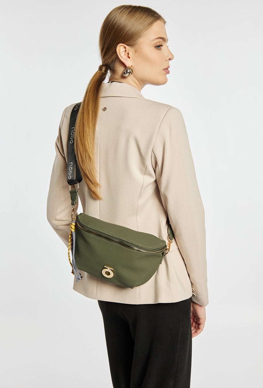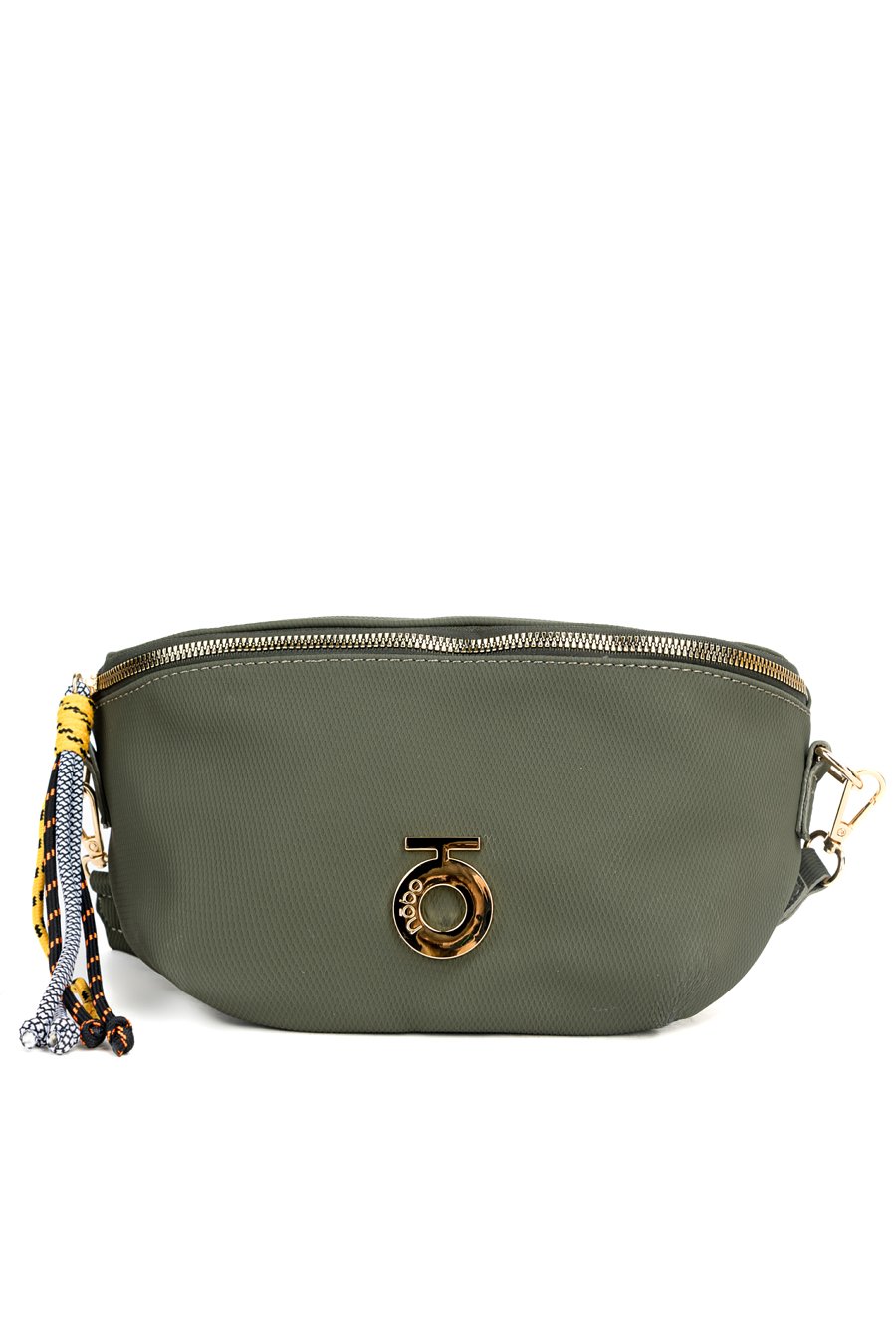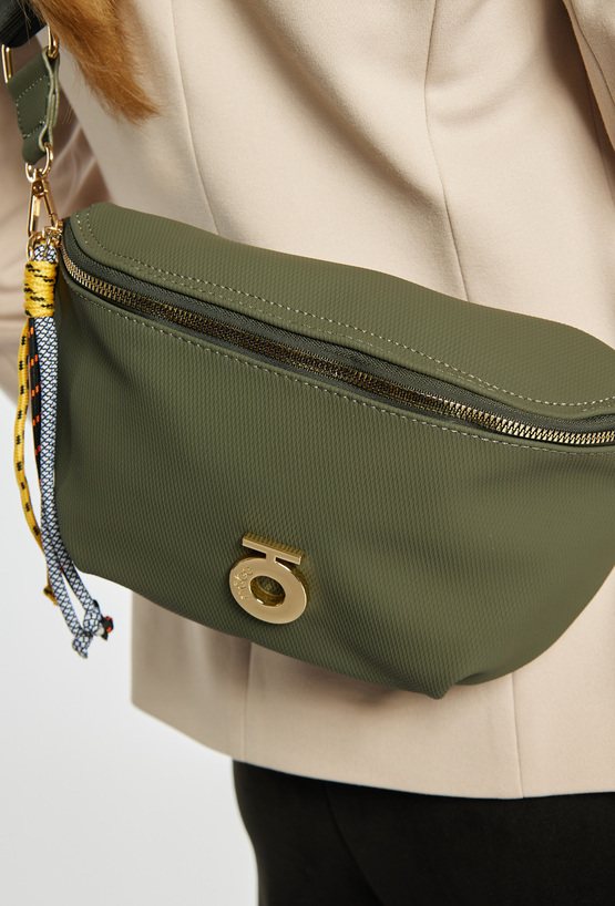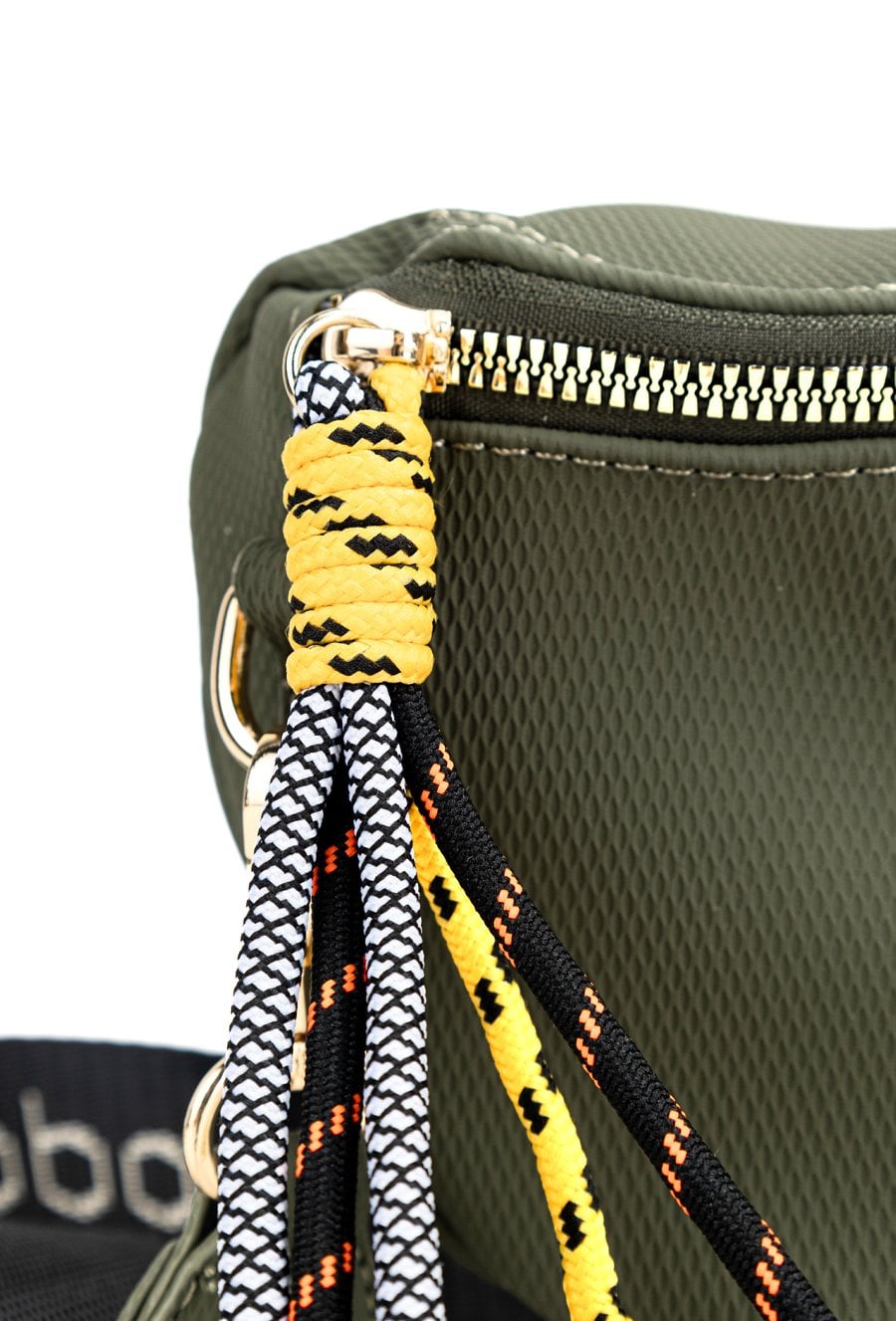 Mała torebka typu nerka z odpinanym, regulowanym paskiem. Torba jednokomorowa, wykończona jasną, logowaną podszewką i wyposażona w dodatkowe kieszonki na drobiazgi. Torba zapinana na suwak, ozdobiona kolorowymi frędzlami, które nadają jej wyrazistego charakteru. Wymiary: 28 × 16,5 × 5 cm.