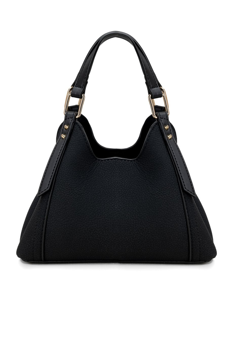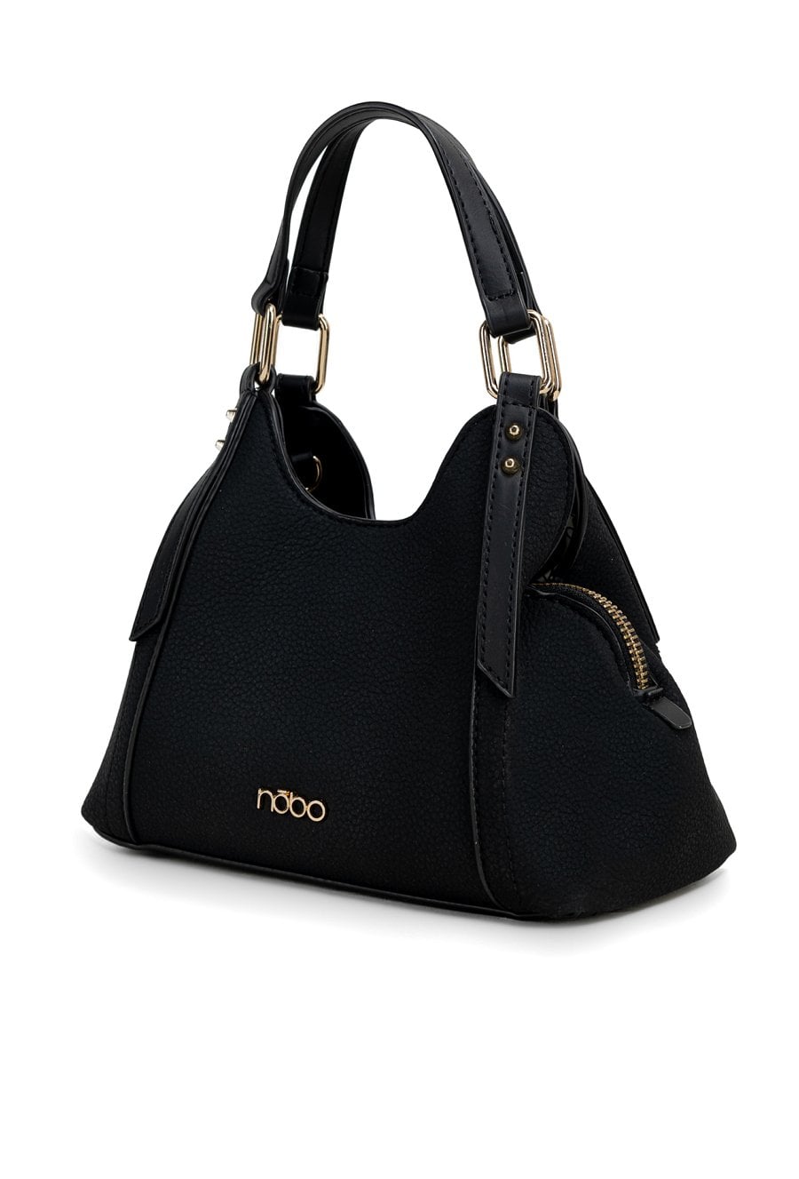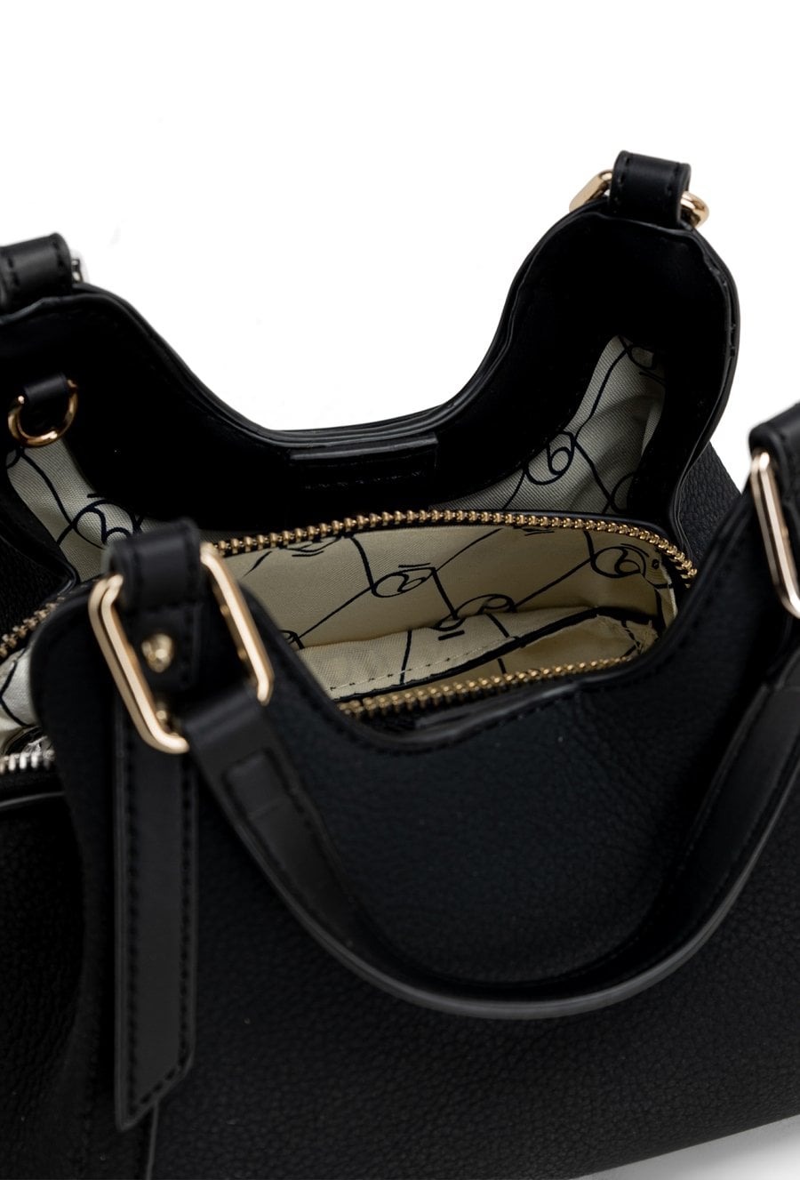 Mała torebka damska o wymiarach 23 × 14 × 10 cm. Model trzykomorowy z jasnymi, logowanymi podszewkami oraz dodatkowymi kieszonkami. Jedna komora zapinana na suwak, dwie pozostałe na napę. Torebka zawieszona na rączkach, w zestawie regulowany pasek. Torbę należy przechowywać w dołączonym woreczku.