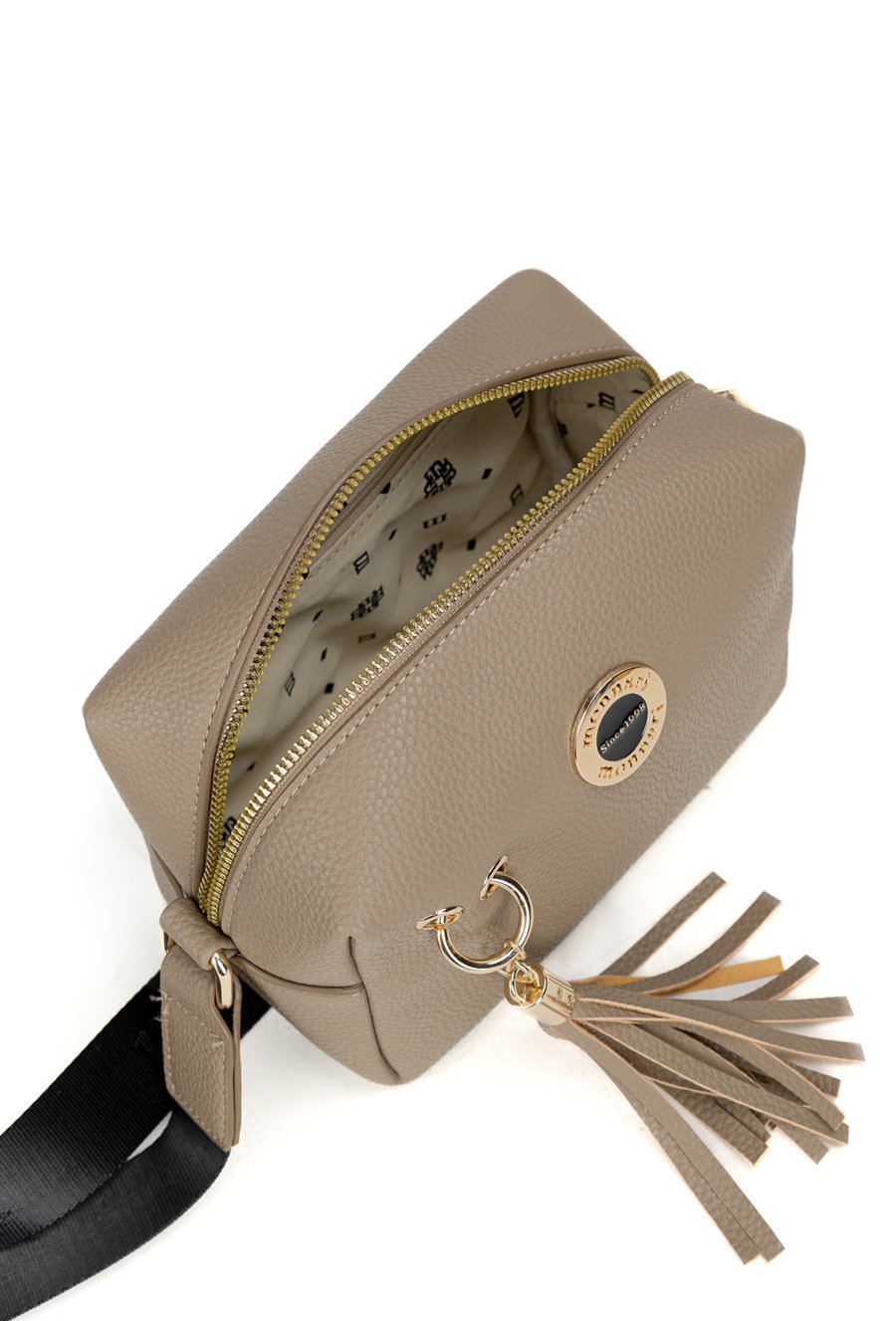 Mała torebka damska o wyjątkowym charakterze, ozdobiona aplikacją w formie efektownych frędzli. Jednokomorowe wnętrze wykończone jasną, logowaną podszewką zostało uzupełnione o praktyczne kieszonki na drobiazgi. Model zapinany od góry na suwak, zawieszony na regulowanym pasku. Torebkę należy przechowywać w dołączonym woreczku. Wymiary: 19 cm x 14,5 cm x 11 cm.