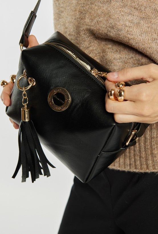 Mała torebka damska o wyjątkowym charakterze, ozdobiona aplikacją w formie efektownych frędzli. Jednokomorowe wnętrze wykończone jasną, logowaną podszewką zostało uzupełnione o praktyczne kieszonki na drobiazgi. Model zapinany od góry na suwak, zawieszony na regulowanym pasku. Torebkę należy przechowywać w dołączonym woreczku. Wymiary: 19 cm x 14,5 cm x 11 cm.
