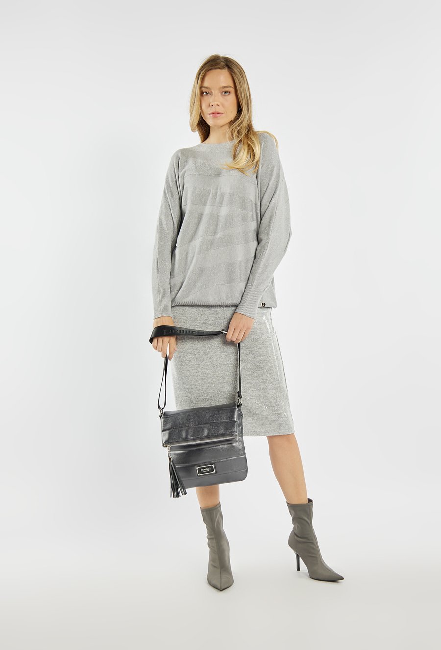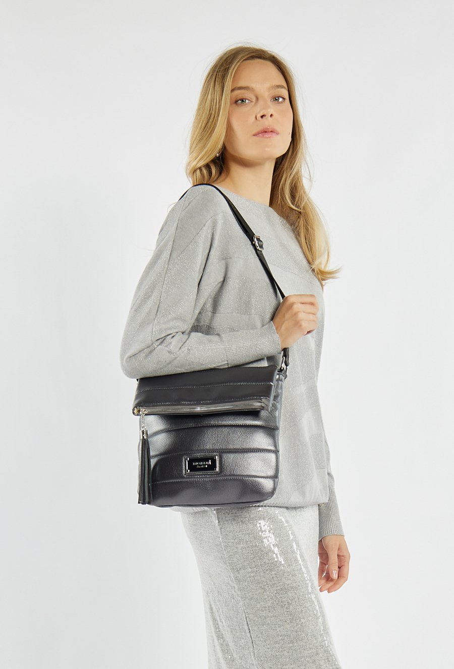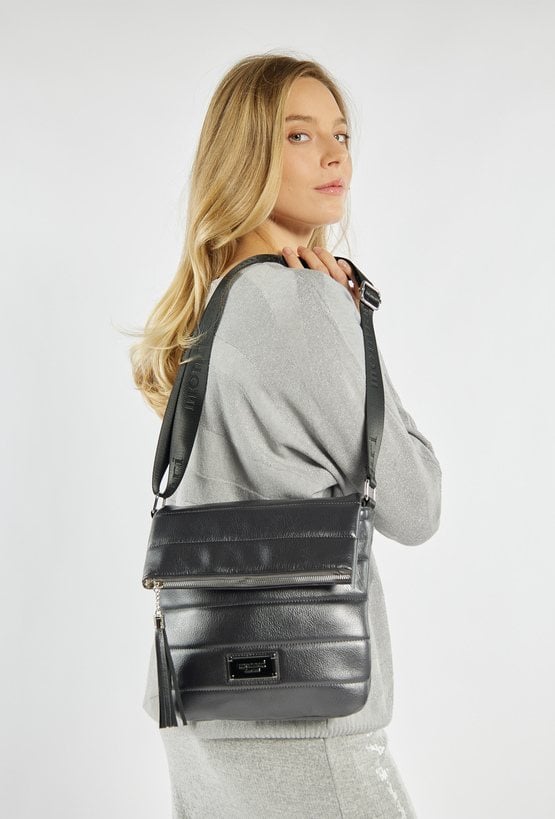 Pikowana torebka damska o wymiarach 28 × 26 × 3 cm. Jednokomorowy model z jasną, logowaną podszewką oraz dodatkowymi kieszonkami na drobiazgi. Klapa pełni funkcję dodatkowej kieszonki zapinanej na suwak, ozdobionej stylowymi frędzlami. Torbę należy przechowywać w dołączonym woreczku.