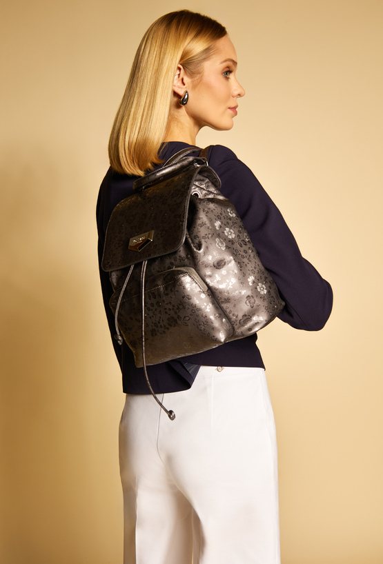 Plecak damski z delikatnym, kwiatowym wzorem, który nadaje mu subtelnego i kobiecego charakteru. Plecak jednokomorowy, z jasną, logowaną podszewką oraz dodatkowymi kieszonkami na drobiazgi, zapewniającymi wygodną organizację. Model zapinany na klapę z napą oraz ściągacz. Dodatkowym atutem jest praktyczna kieszonka z przodu, idealna na najpotrzebniejsze drobiazgi. Torbę należy przechowywać w załączonym woreczku. Wymiary: 28 cm x 40 cm x 20 cm.