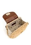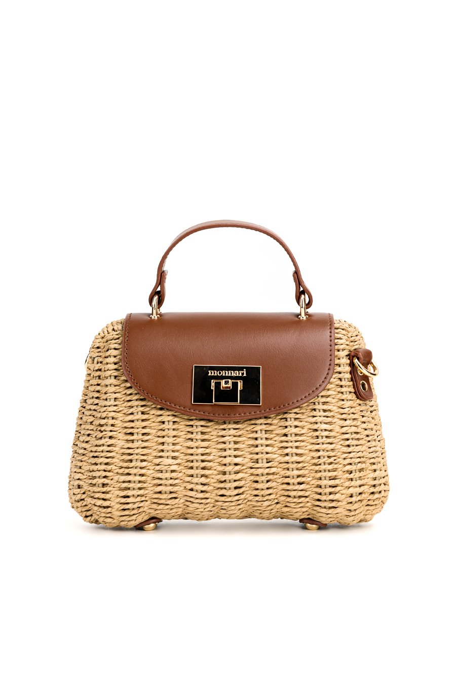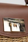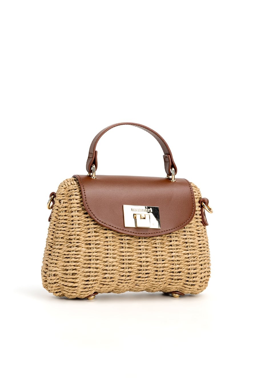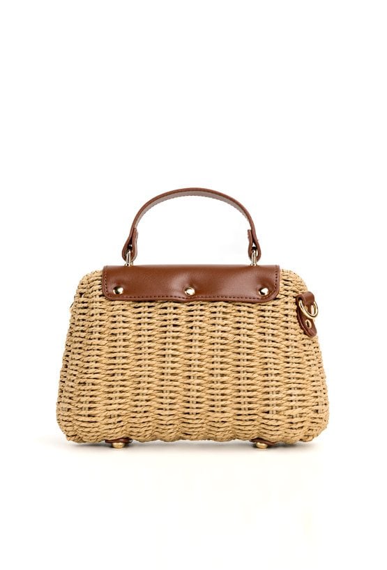 Pleciona torba damska o wymiarach 23 × 17 × 9 cm. Jednokomorowy model z jasną, logowaną podszewką oraz dodatkową kieszonką w środku. Torebka zawieszona na rączce, zapinana na klapę. W zestawie regulowany, odpinany pasek. Torbę należy przechowywać w dołączonym woreczku.