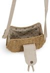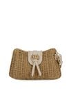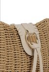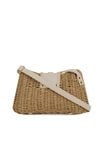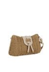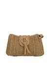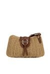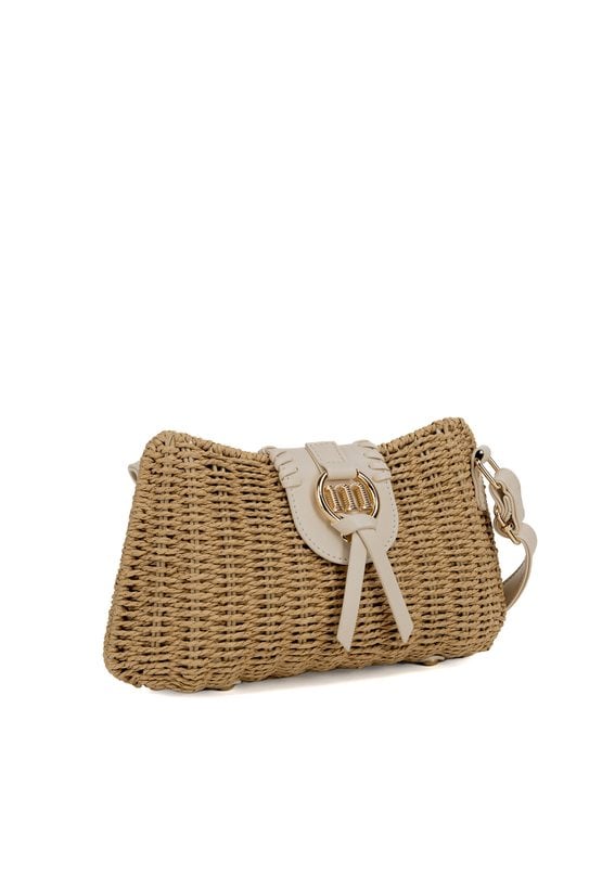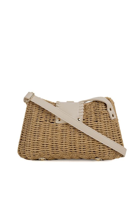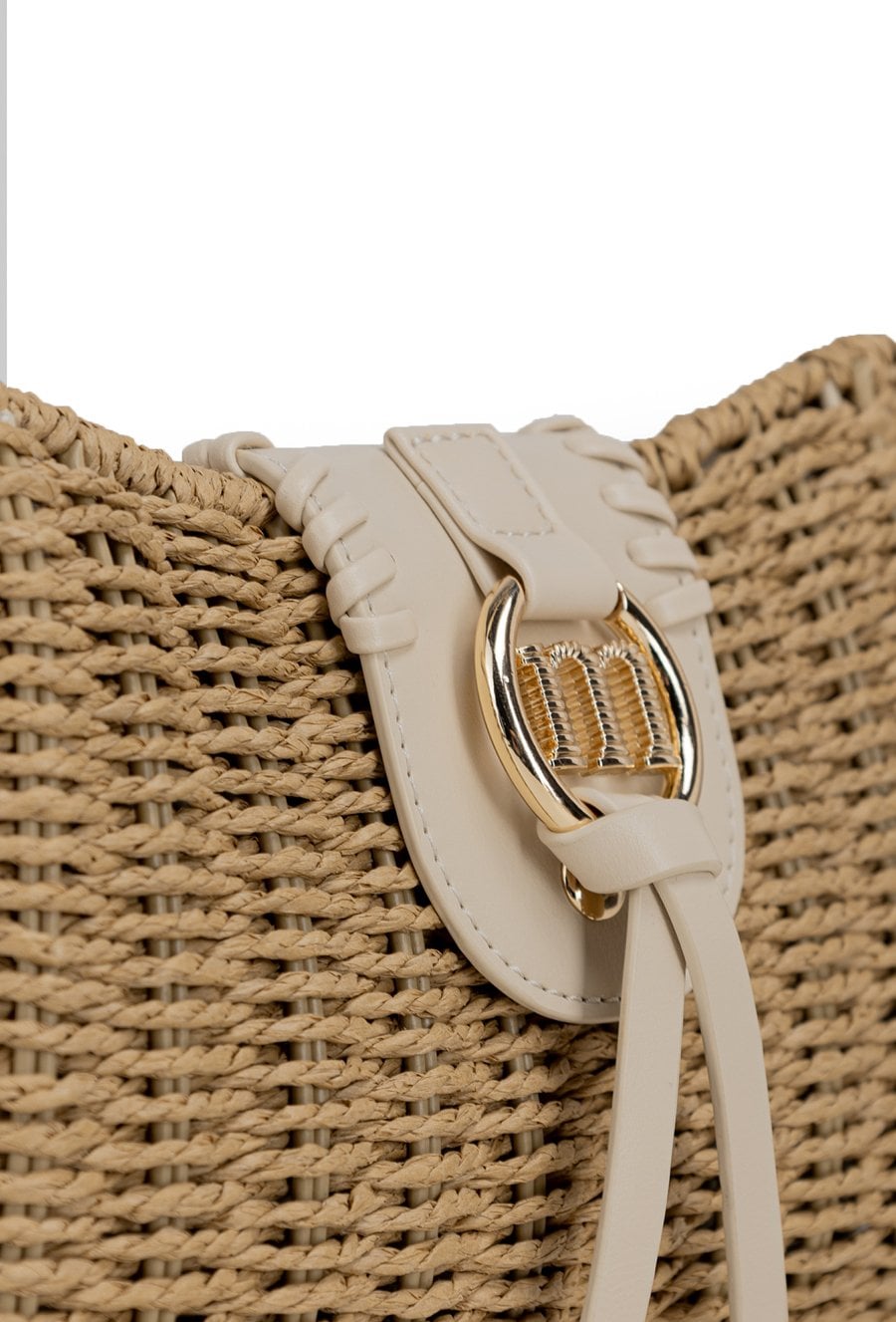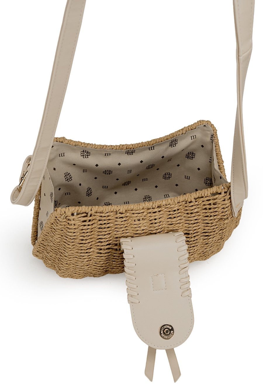 Torba damska z plecionką o wymiarach 31 × 16,5 × 9,5 cm. Jednokomorowy model z jasną, logowaną podszewką oraz dodatkową kieszonką w środku. Torebka zawieszona na pasku, zapinana na małą klapę z napą.