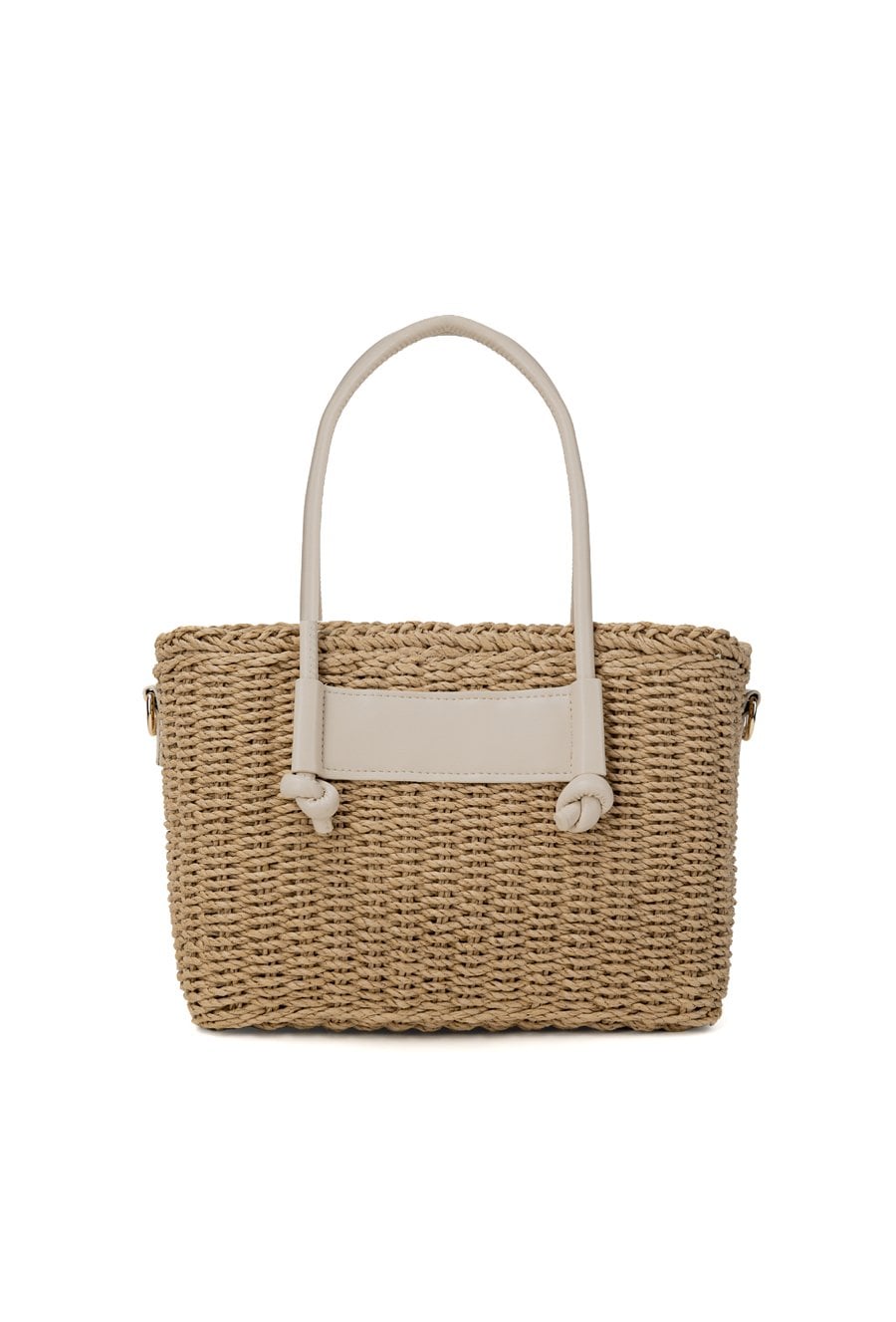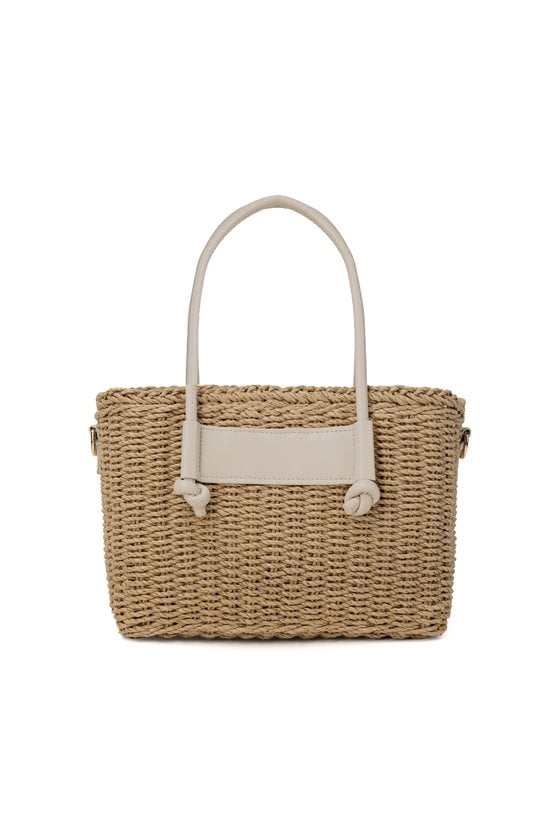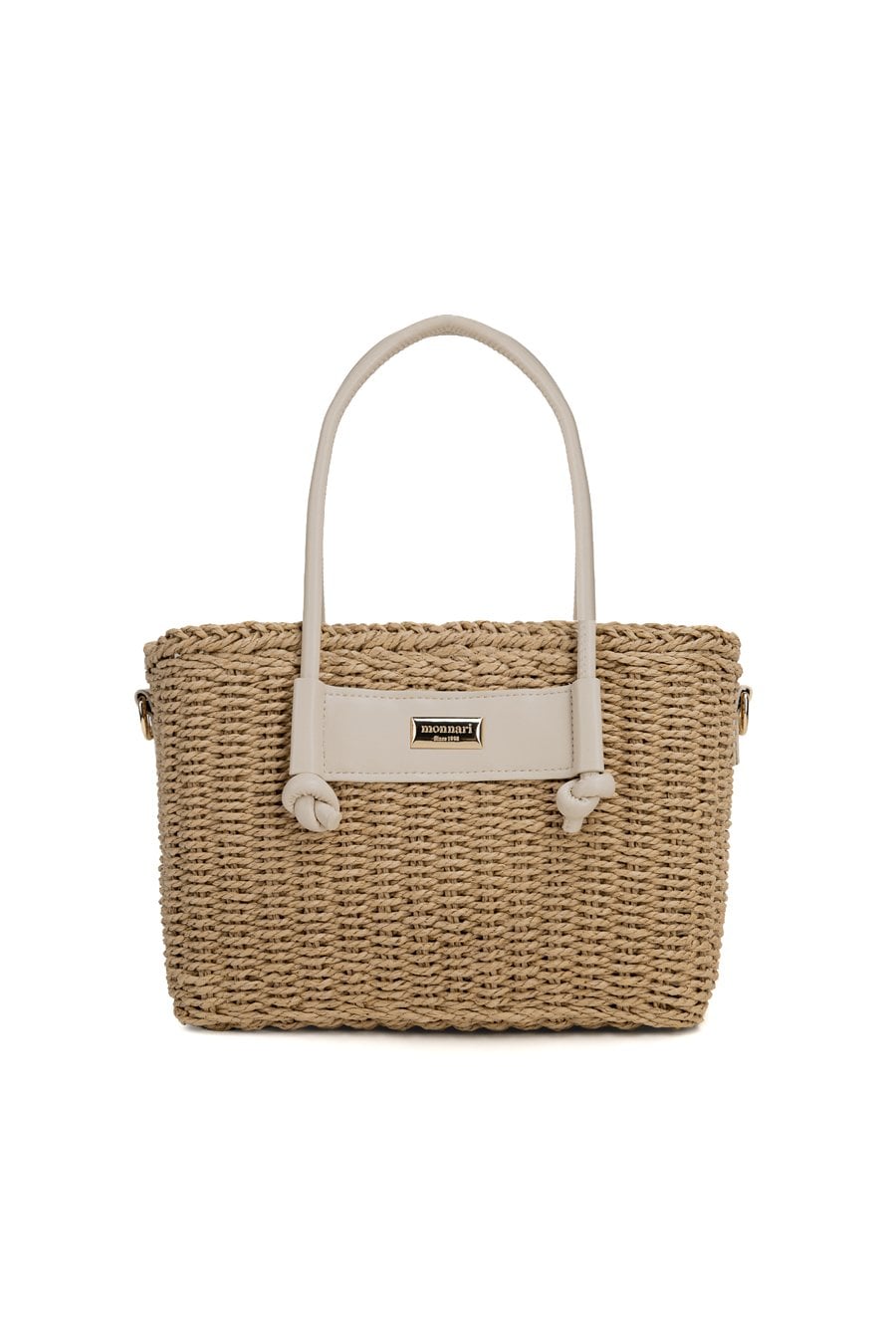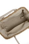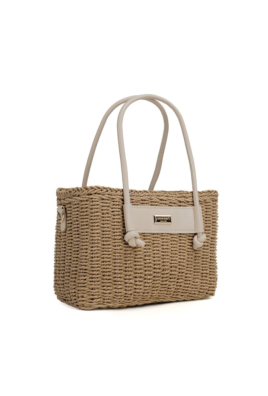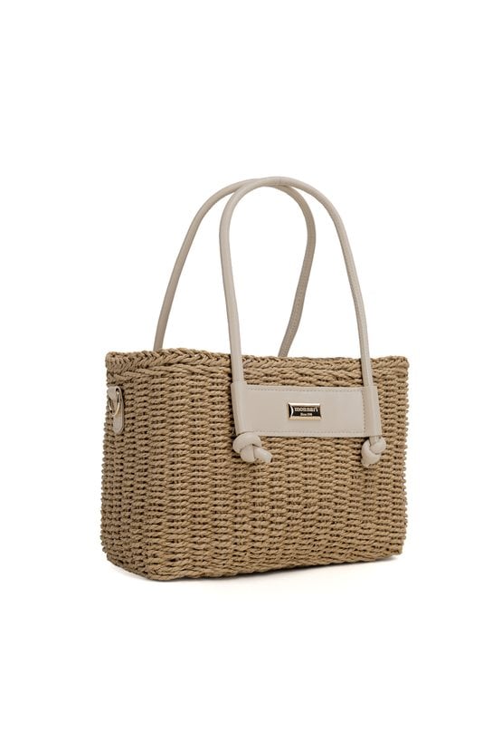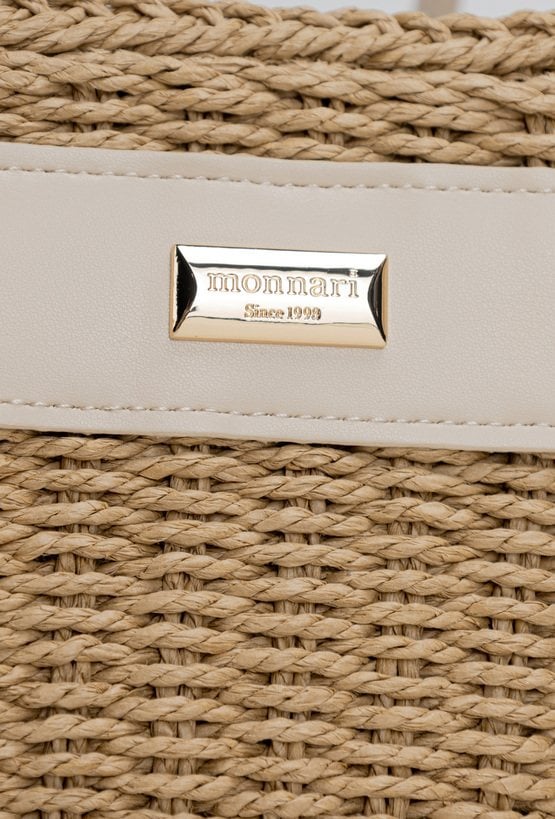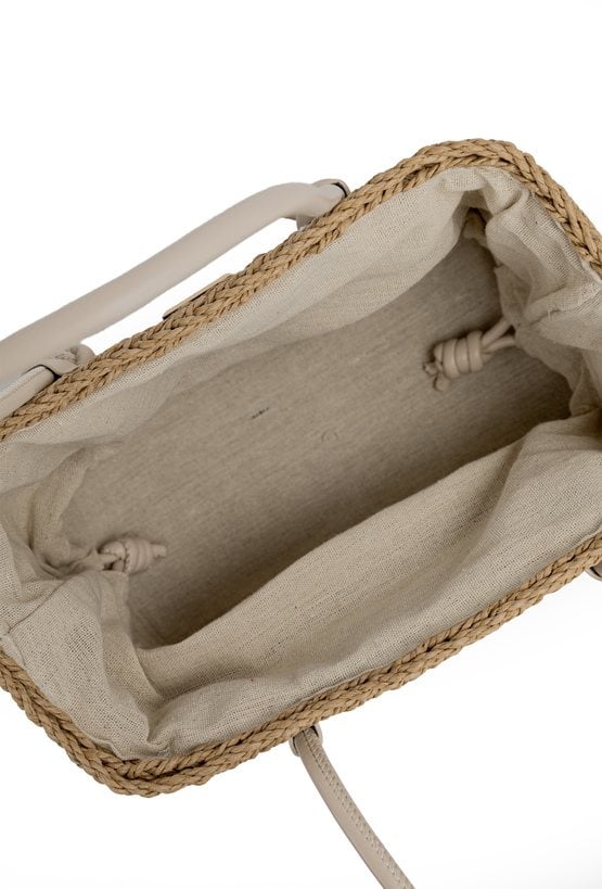 Pleciony koszyk damski o wymiarach 26 × 17 × 13 cm. Jednokomorowy model z jasną podszewką oraz dodatkową kieszonką na drobiazgi. Koszyk zawieszony na rączkach, zapinany na ściągacz. W zestawie regulowany pasek. Torbę należy przechowywać w dołączonym woreczku.