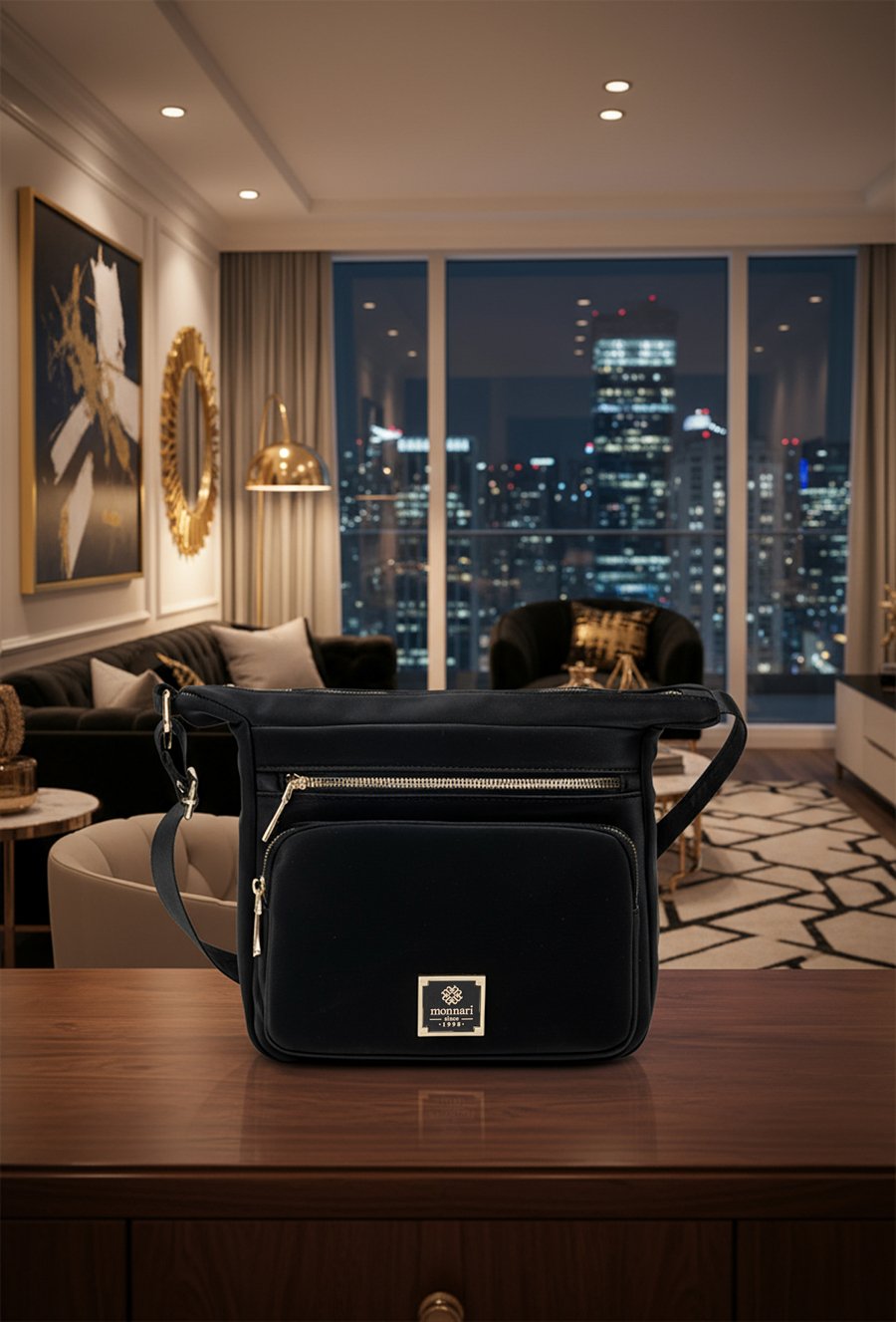 Praktyczna torba damska zawieszona na regulowanym pasku, Torba jednokomorowa o jasnej logowanej podszewce. Dodatkowym atutem są funkcjonalne kieszonki – dwie umieszczone z przodu oraz jedna z tyłu – które ułatwiają organizację najpotrzebniejszych drobiazgów i zapewniają szybki dostęp do nich. Torebkę należy przechowywać w dołączonym woreczku. Wymiary torby: 25 cm x 26 cm x 10 cm.