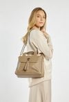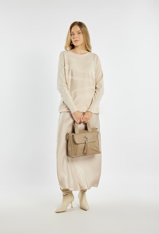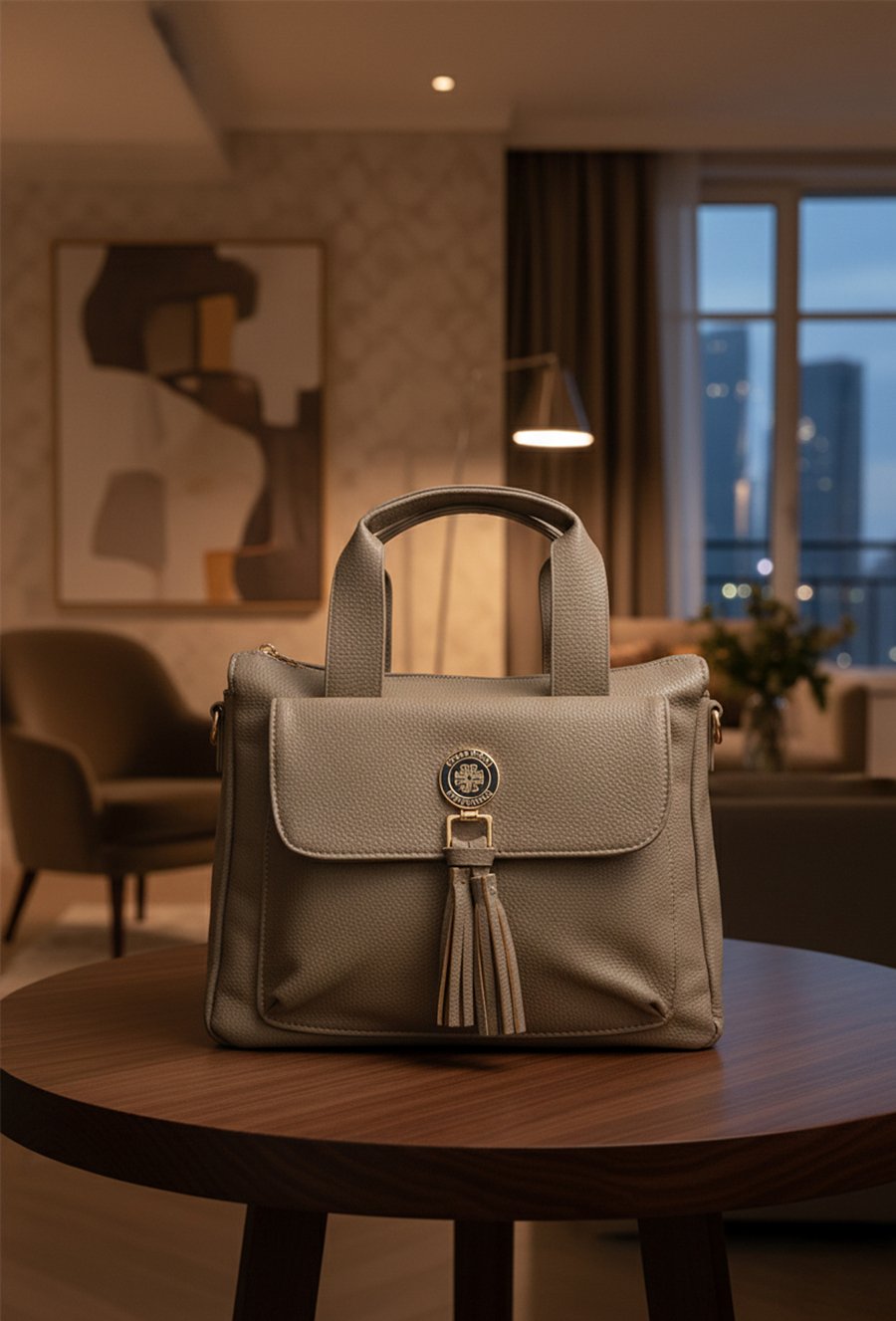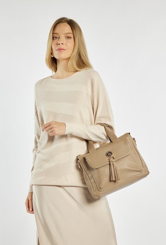 Stylowa torebka o wymiarach: 30 x 22 x 12. Klasyczne rączki uzupełniono o dodatkowy, regulowany pasek, który pozwala wygodnie nosić ją także na ramieniu. Jednokomorowe wnętrze z jasną, logowaną podszewką wzbogacono o praktyczne kieszonki, ułatwiające organizację drobiazgów. Całość dopełnia subtelny detal – frędzel umieszczony przy logo, nadający torebce wyjątkowego charakteru i lekkości. Torbę należy przechowywać w dołączonym woreczku.