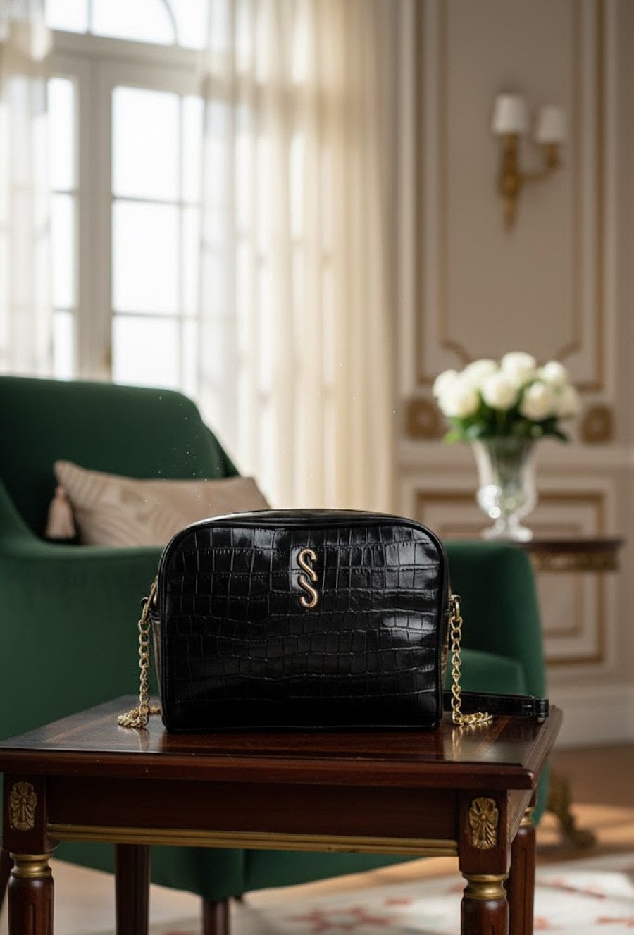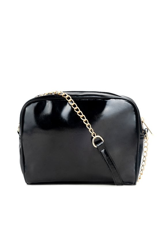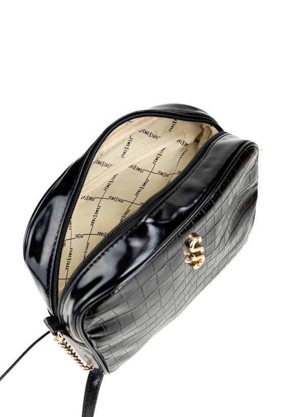 Torba damska typu crossbody o wymiarach 23 × 17,5 × 7 cm, zawieszona na regulowanym pasku z ozdobnym elementem łańcuszka, jednokomorowa, z jasnym, logowanym wnętrzem oraz kieszonkami na drobiazgi.Torbę należy przechowywać w załączonym woreczku.
