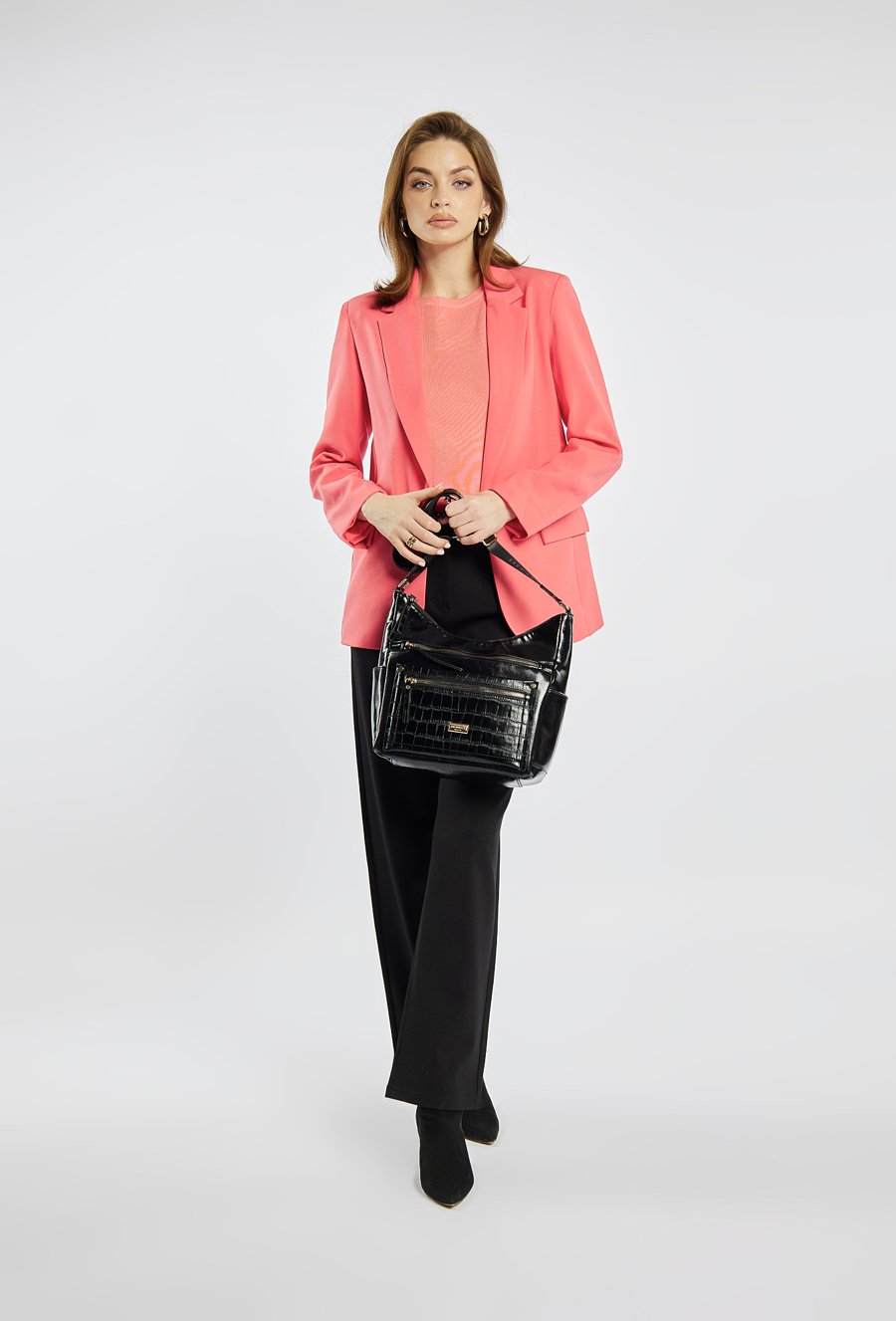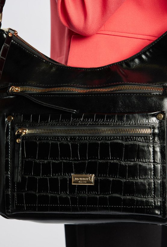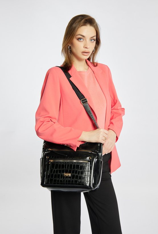 Damska torba o wymiarach 33 cm x 24 cm x 11,5 cm, jednokomorowa, z elegancką, jasną logowaną podszewką. Wnętrze wyposażone w dodatkowe kieszonki na drobiazgi, a z przodu znajdują się kolejne funkcjonalne kieszenie. Torba zawieszona na regulowanym pasku, a boczne kieszonki zwiększają jej praktyczność.