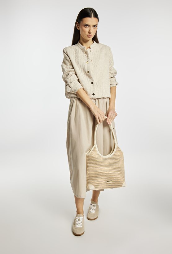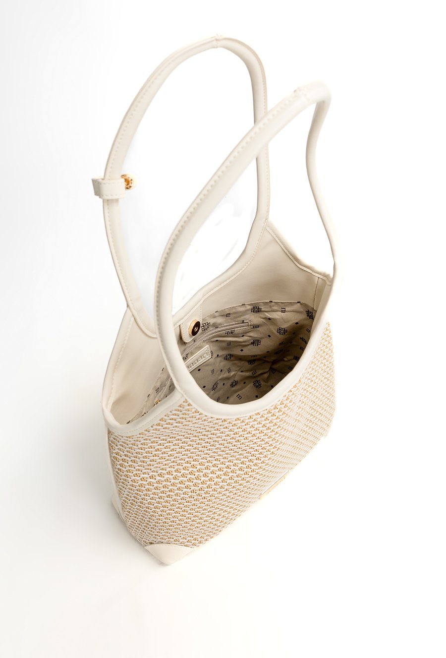 Torba damska typu koszyk o wymiarach 33 cm x 26 cm x 10 cm to stylowy i funkcjonalny dodatek na co dzień. Torba jest jednokomorowa, posiada jasną, logowaną podszewkę z dodatkowymi kieszonkami, dłuższe rączki z możliwością spięcia ze sobą oraz zapięcie na napę. Torbę należy przechowywać w dołączonym woreczku.