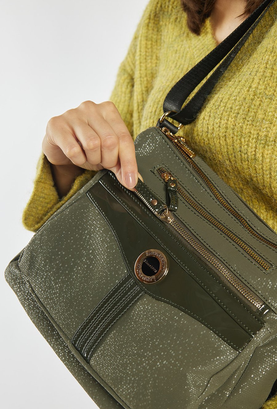 Damska torba na co dzień o wymiarach 32 × 26 × 8 cm to praktyczny i stylowy model, który doskonale sprawdzi się w codziennym użytkowaniu. Torba posiada dwie oddzielne komory, wykończone jasną podszewką z dodatkowymi kieszonkami na drobiazgi, co ułatwia utrzymanie porządku. Całość zapinana jest na suwak, zapewniając bezpieczeństwo zawartości. Z przodu znajdują się dwie funkcjonalne kieszenie z zapięciem, idealne na najpotrzebniejsze rzeczy. Model zawieszony jest na regulowanym pasku. Torbę należy przechowywać w załączonym woreczku.
