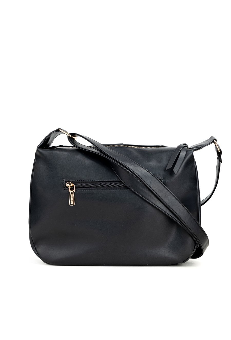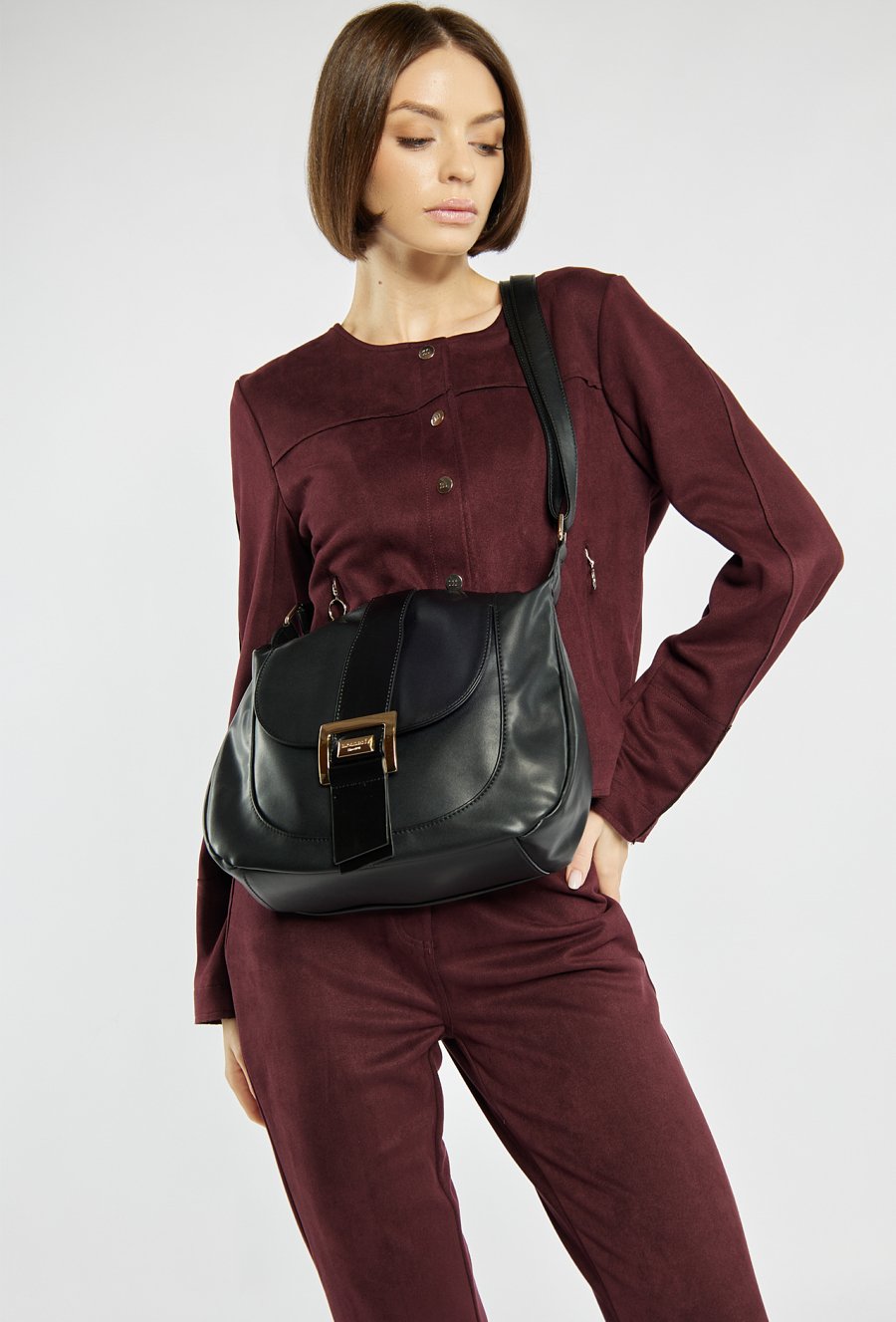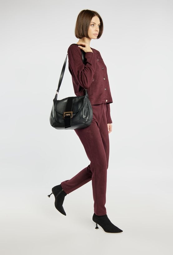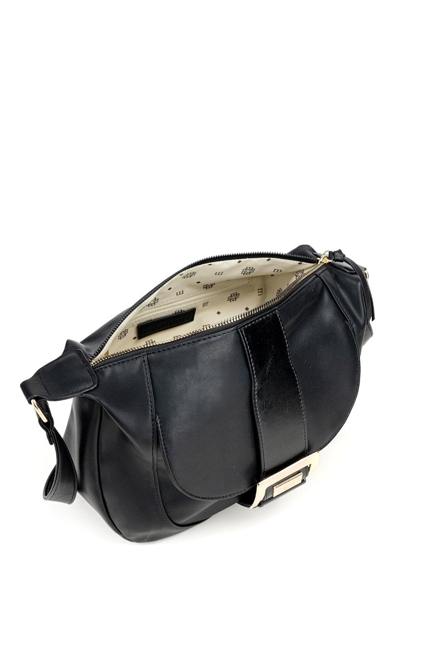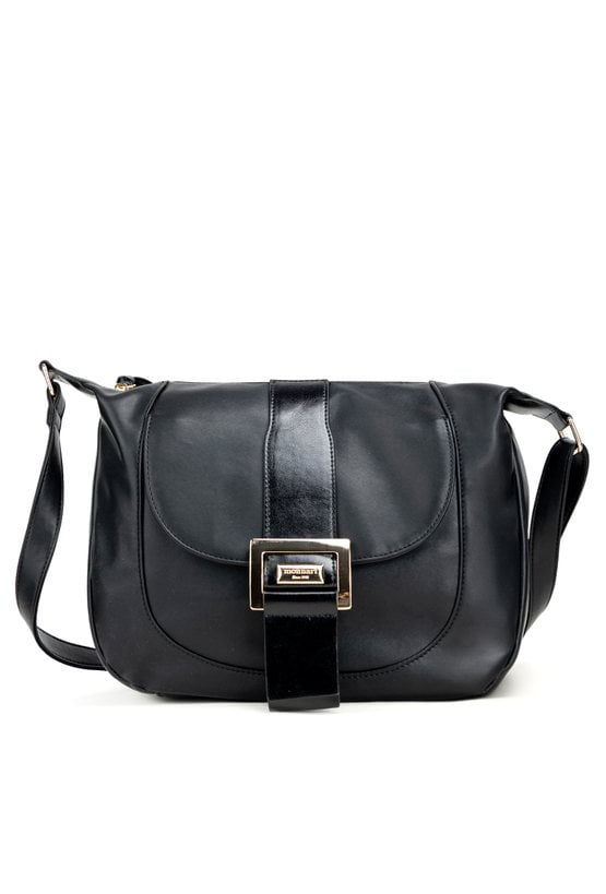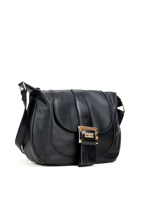 Torba damska o wymiarach 35 cm x 25 cm x 8 cm, idealna na co dzień. Model jednokomorowy, z jasną, logowaną podszewką oraz dodatkowymi kieszonkami na drobiazgi. Torba zawieszona na regulowanym pasku, co zapewnia wygodę noszenia. Jej atutem jest przednia kieszonka zapinana na klapę z ozdobną klamrą. Torebkę należy przechowywać w dołączonym woreczku.
