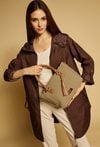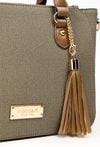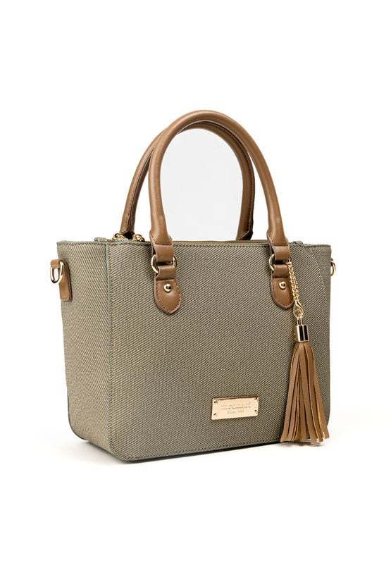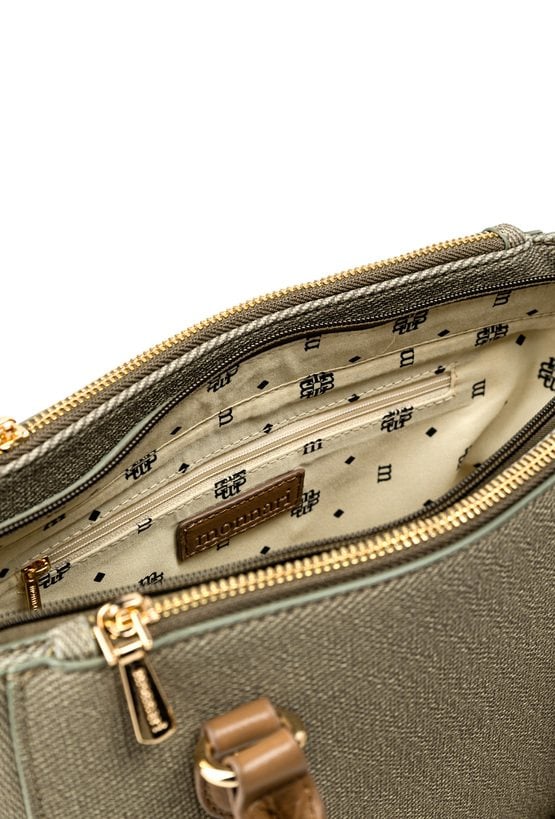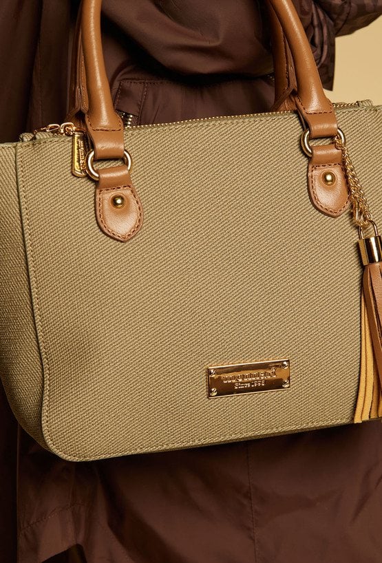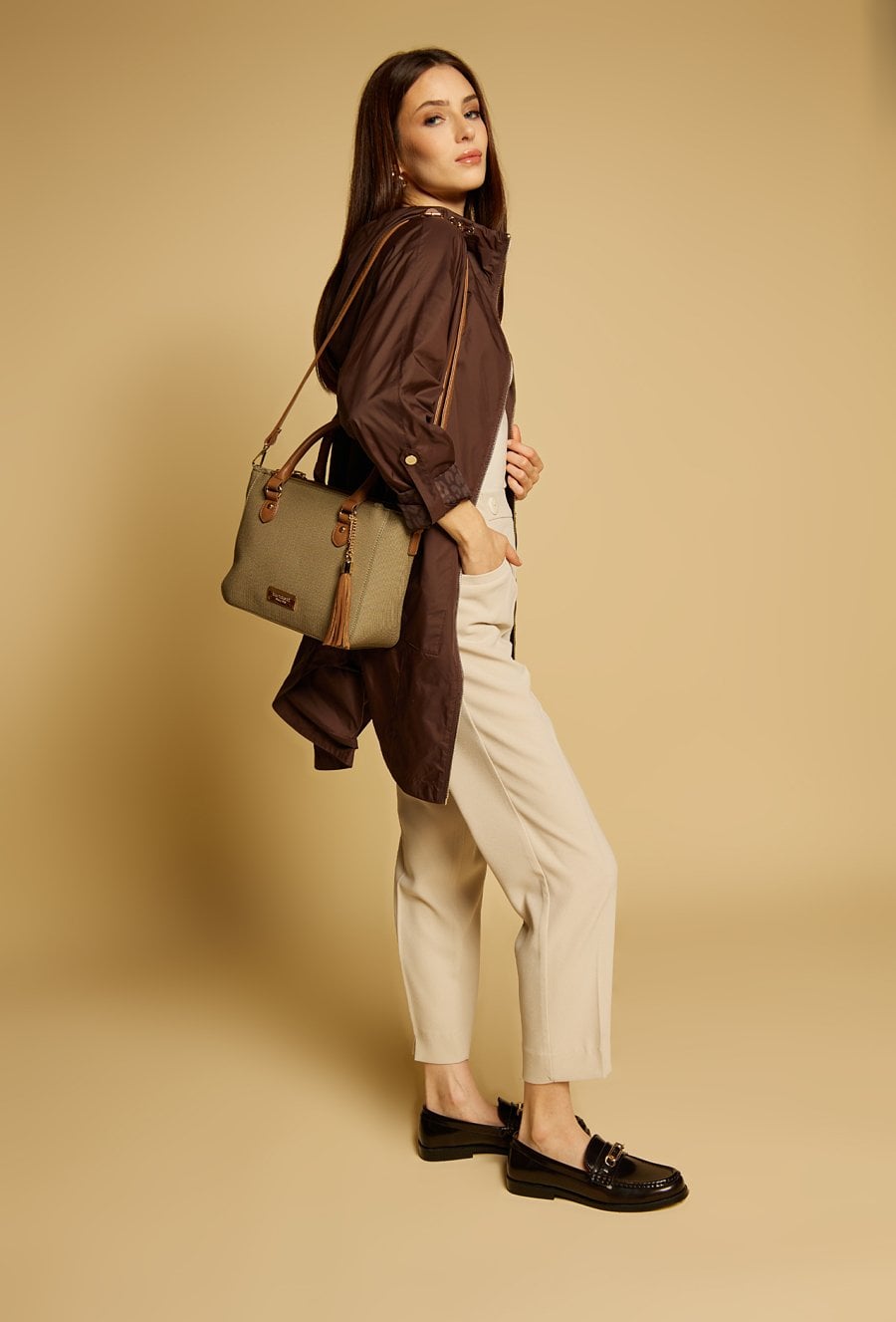 Torba damska z efektownymi frędzlami, które nadają jej modnego, swobodnego charakteru. Torba z jedną główną komorą oraz dwiema pojemnymi kieszonkami zapinanymi na suwaki, zapewniającymi wygodną organizację. Wnętrze torby jest jasne i logowane, co dodaje elegancji. Zawieszona na rączkach, a w zestawie znajduje się regulowany pasek. Torbę należy przechowywać w dołączonym woreczku. Wymiary: 31 cm x 20,5 cm x 10 cm.