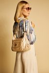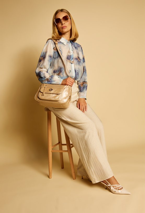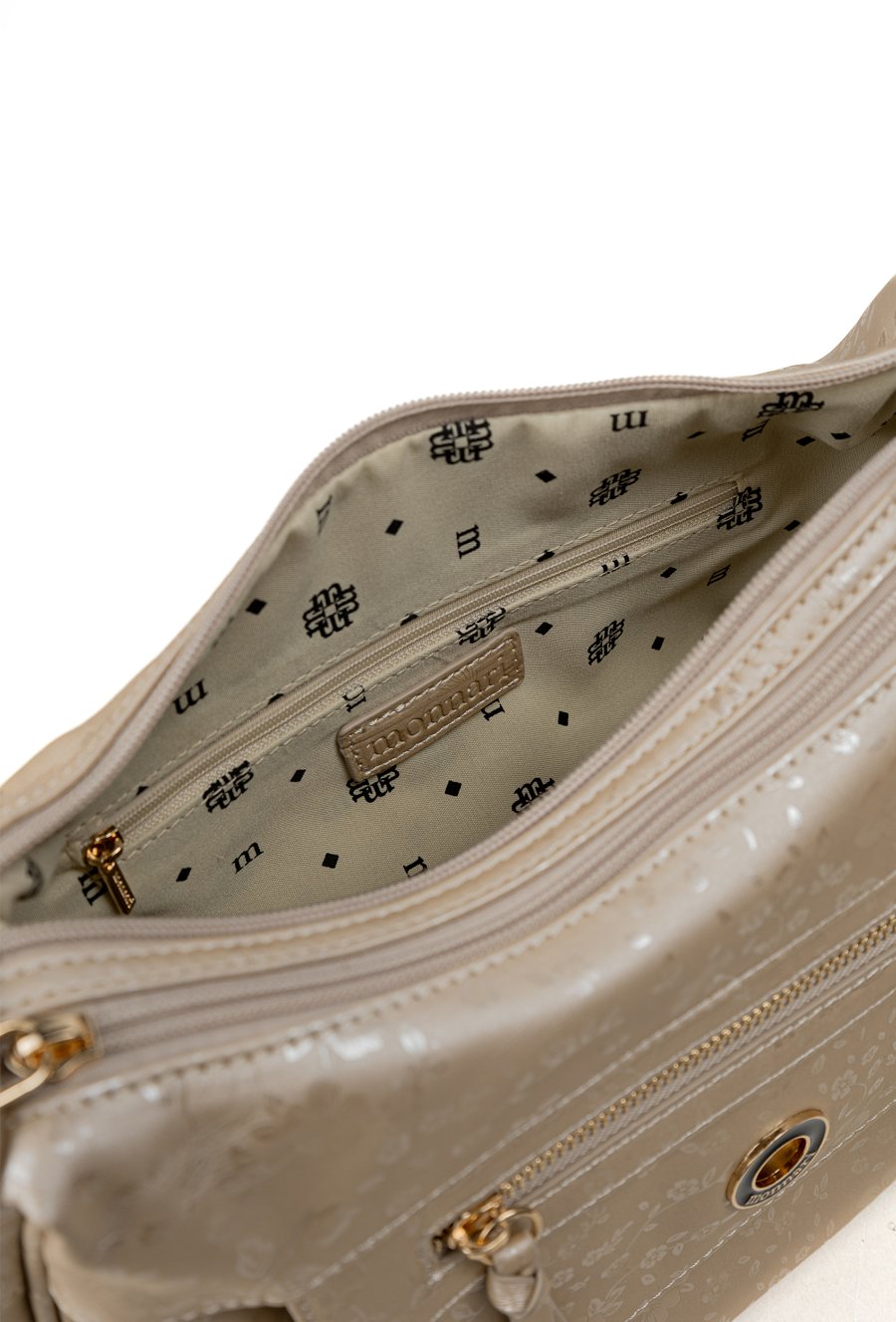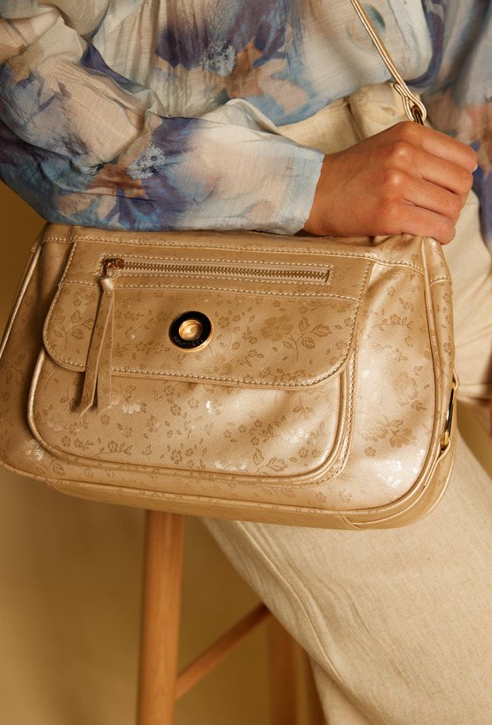 Torba damska dwukomorowa z delikatnym kwiatowym motywem, który dodaje jej subtelnego uroku. Wnętrze torby jest jasne i logowane, wyposażone w dodatkowe kieszonki na drobiazgi. Torba zawieszona na regulowanym pasku, idealnie sprawdzi się na co dzień, łącząc styl z funkcjonalnością. Wymiary: 33 cm x 19,5 cm x 9 cm.