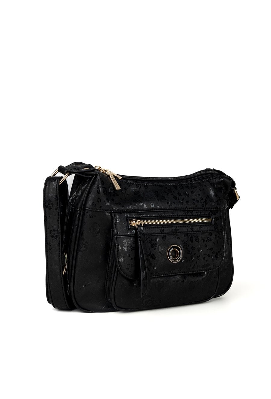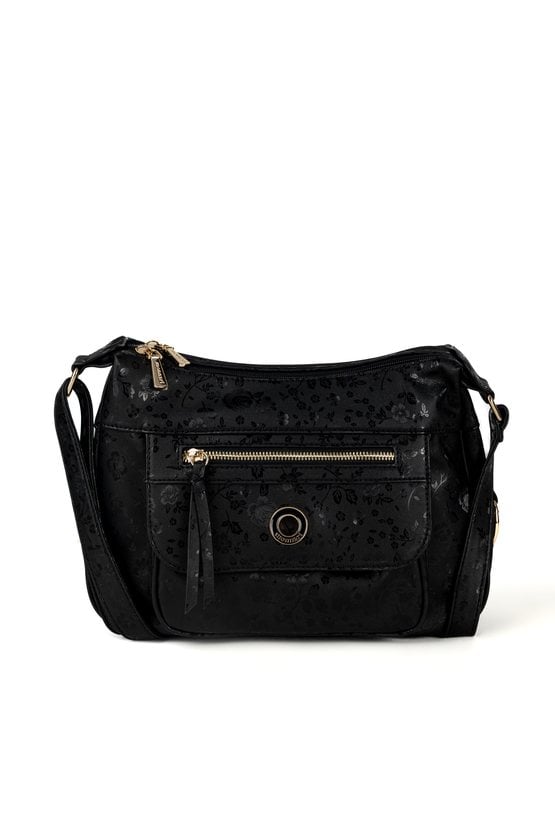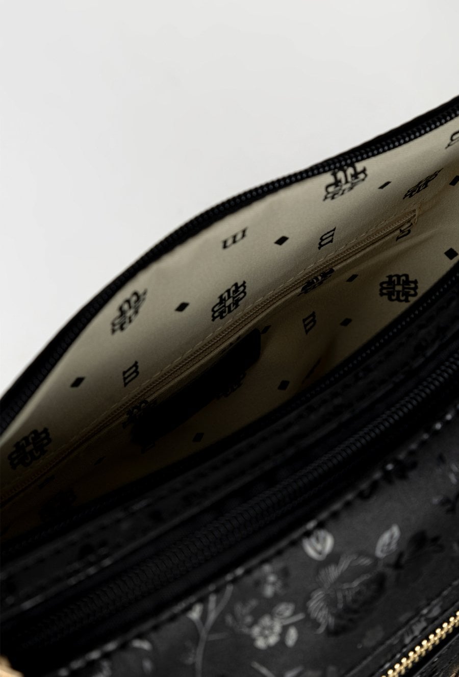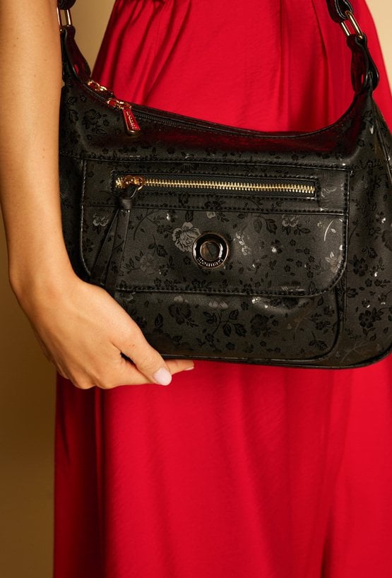 Torba damska dwukomorowa z delikatnym kwiatowym motywem, który dodaje jej subtelnego uroku. Wnętrze torby jest jasne i logowane, wyposażone w dodatkowe kieszonki na drobiazgi. Torba zawieszona na regulowanym pasku, idealnie sprawdzi się na co dzień, łącząc styl z funkcjonalnością. Wymiary: 33 cm x 19,5 cm x 9 cm.