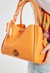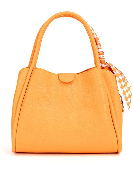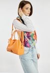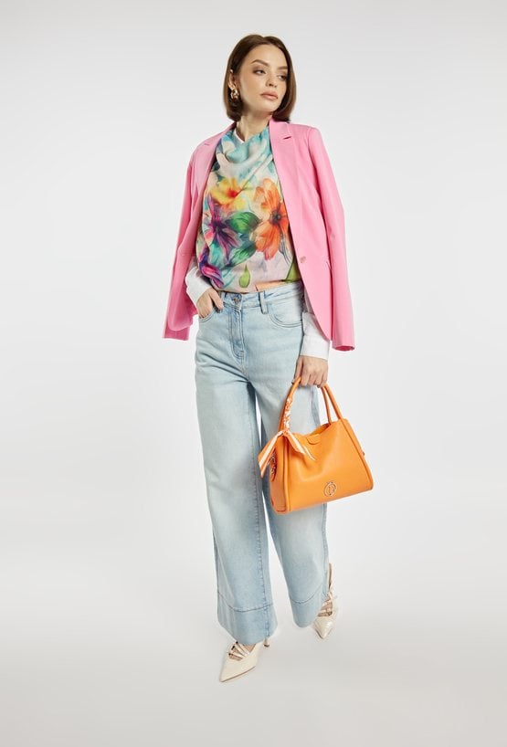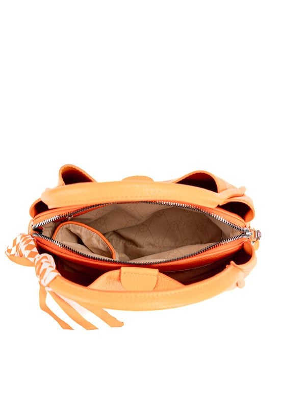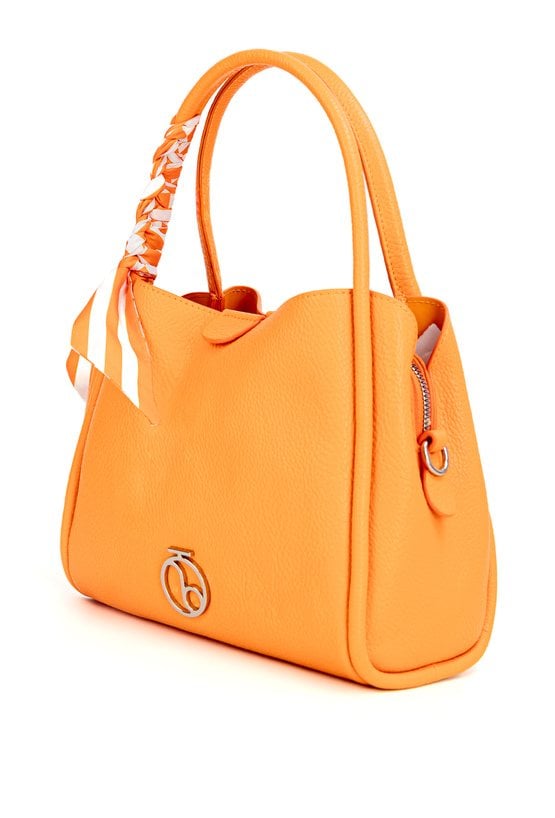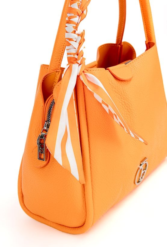 Damska torba o wymiarach 24 × 20 × 13 cm. Model trzykomorowy- jedna komora zapinana na suwak oraz dwie na napy. Torba zawieszona na rączkach, a w zestawie znajduje się regulowany pasek. Całość uzupełnia ozdobna chusta przy rączce, która dodaje torbie stylowego charakteru. Torbę należy przechowywać w dołączonym woreczku.