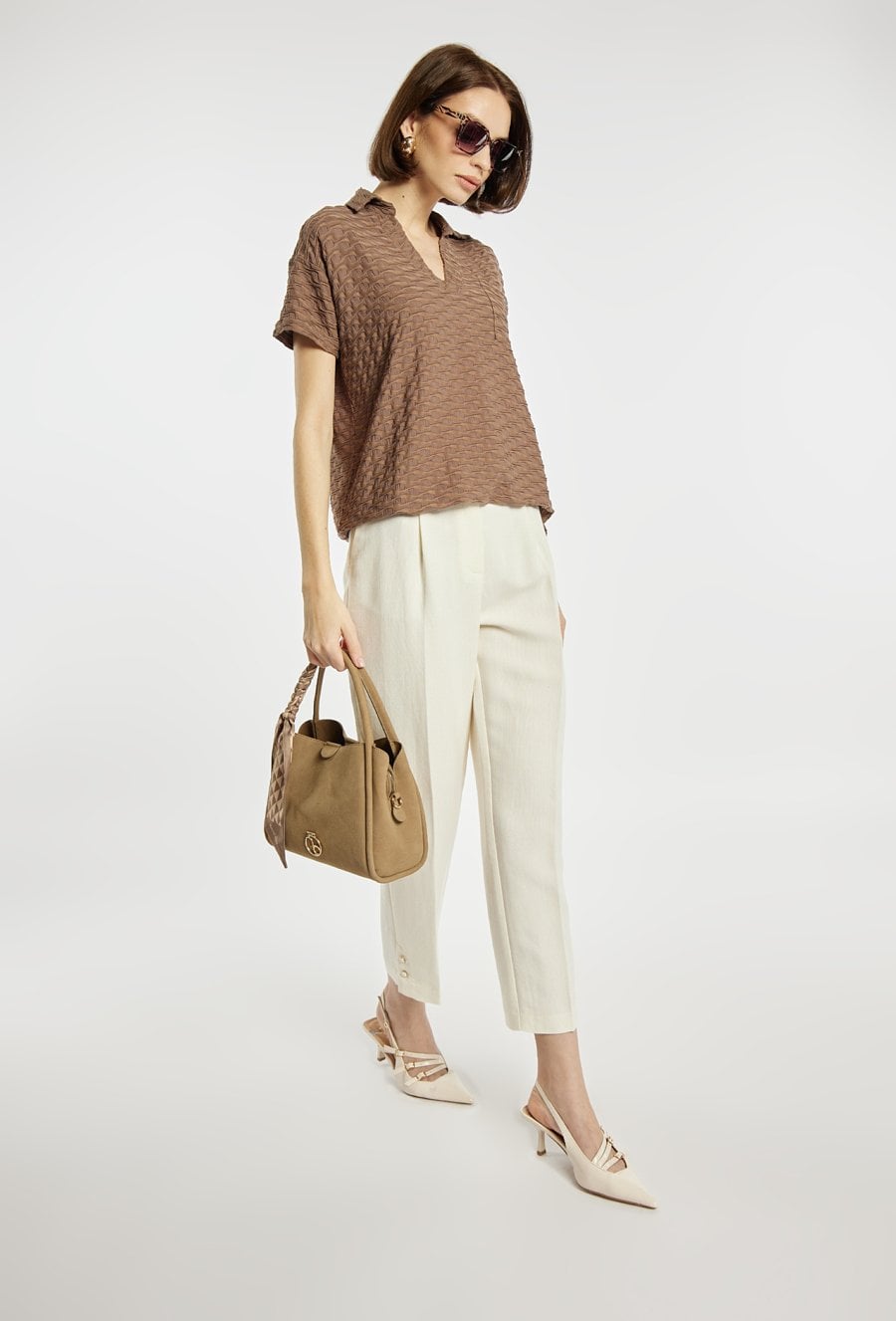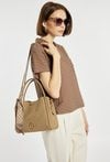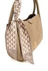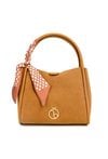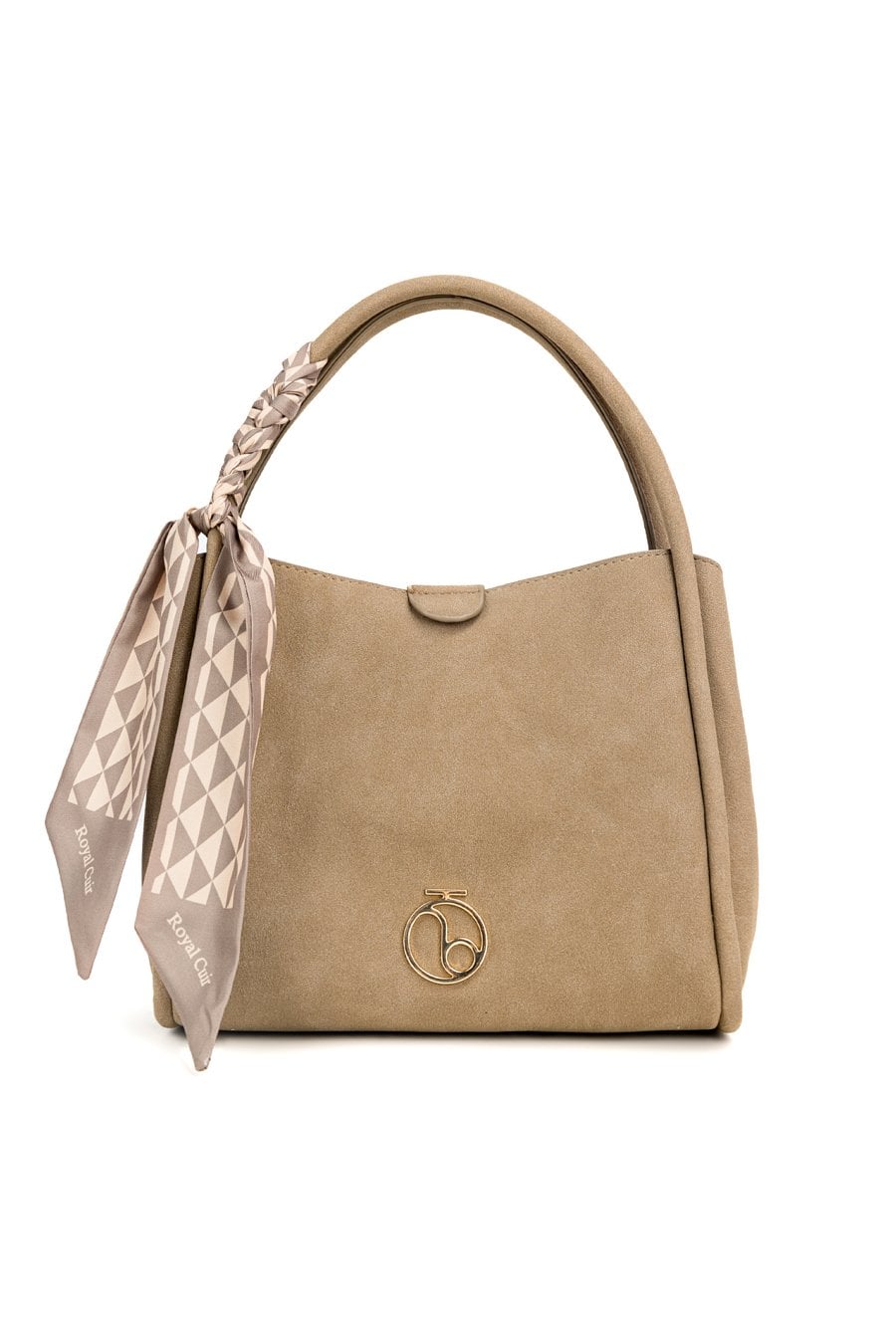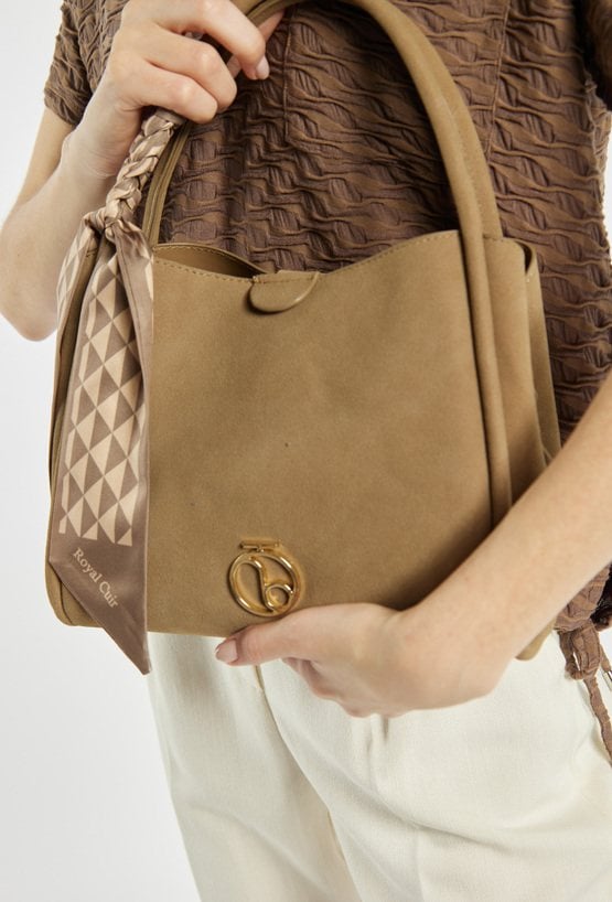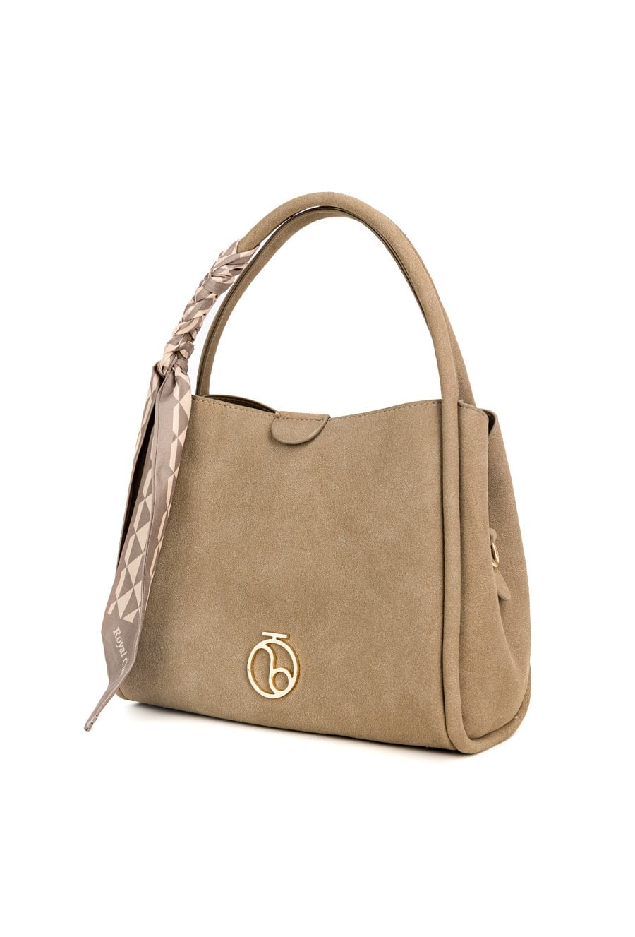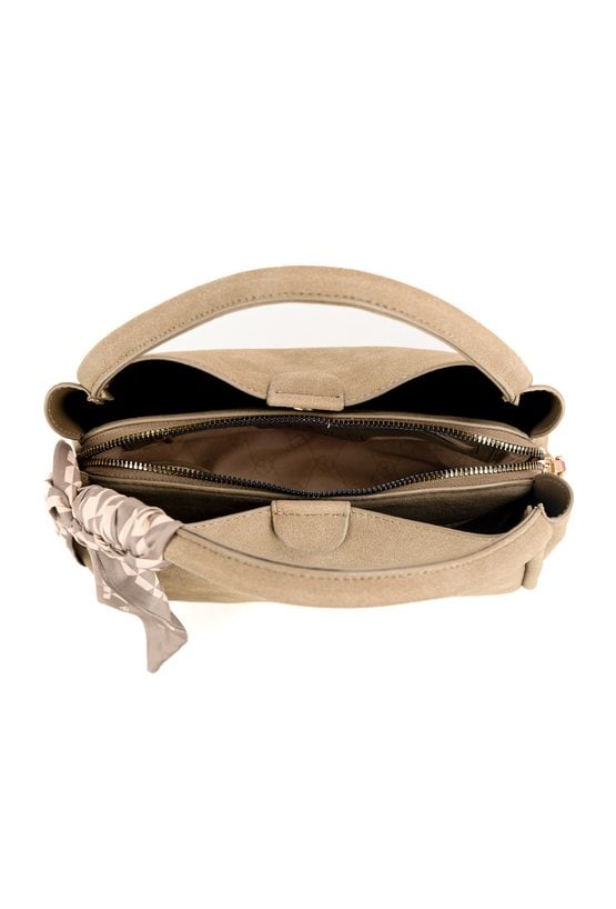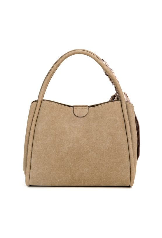 Damska torba o wymiarach 24 × 20 × 13 cm. Model trzykomorowy- jedna komora zapinana na suwak oraz dwie na napy. Torba zawieszona na rączkach, a w zestawie znajduje się regulowany pasek. Całość uzupełnia ozdobna chusta przy rączce, która dodaje torbie stylowego charakteru. Torbę należy przechowywać w dołączonym woreczku.