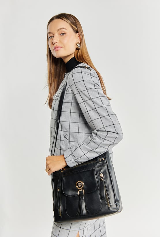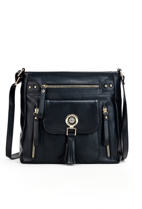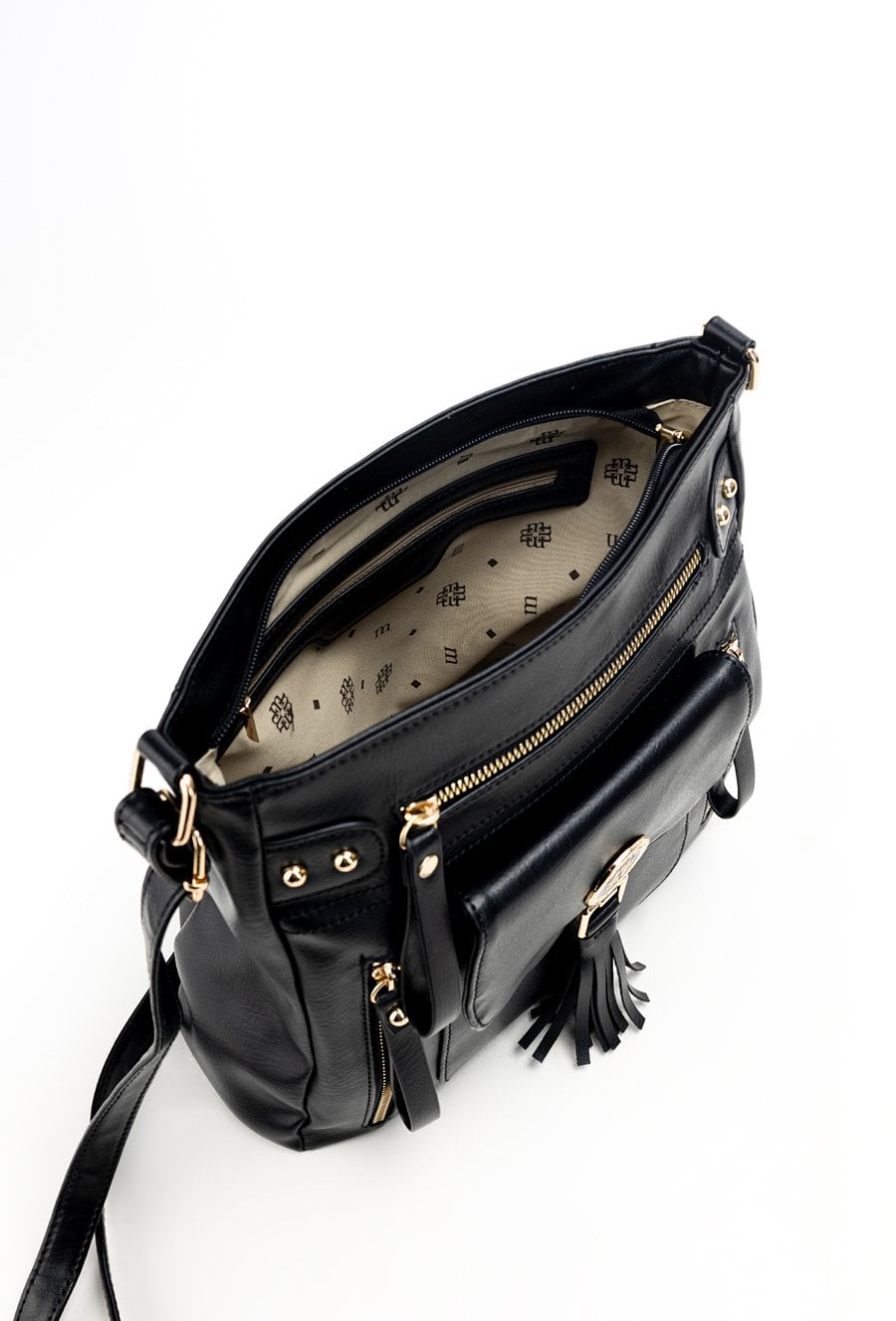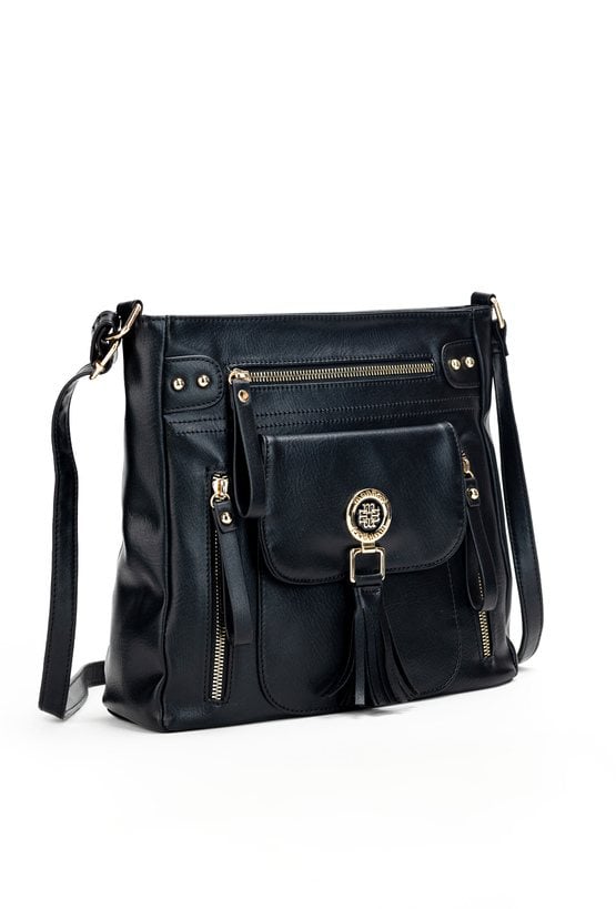 Torba damska typu crossbody z paskiem. Torba jednokomorowa o jasnym logowanym wnętrzu z kieszonkami na drobiazgi. Dodatkowo zarówno z przodu jak i z tyłu znajdują się kieszenie. Atutem torby jest kieszonka z przodu z klapą, na której znajduje się biżuteryjne logo marki Monnari z frędzlami. Torbę należy przechowywać w załączonym woreczku. Wymiary: 30 cm x 27,5 cm x 7,5 cm.