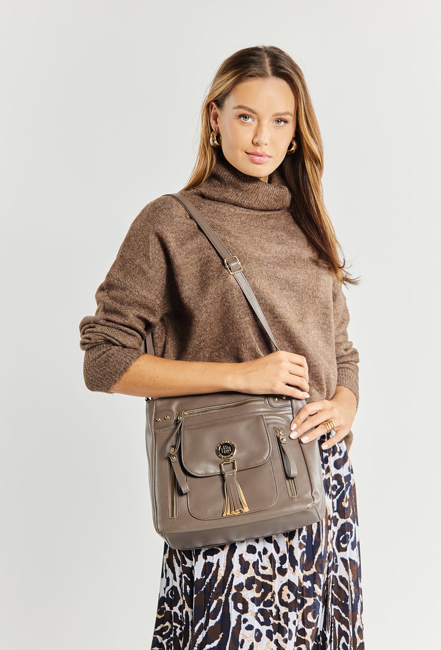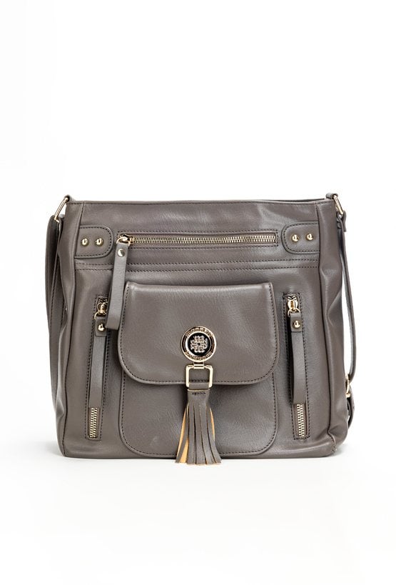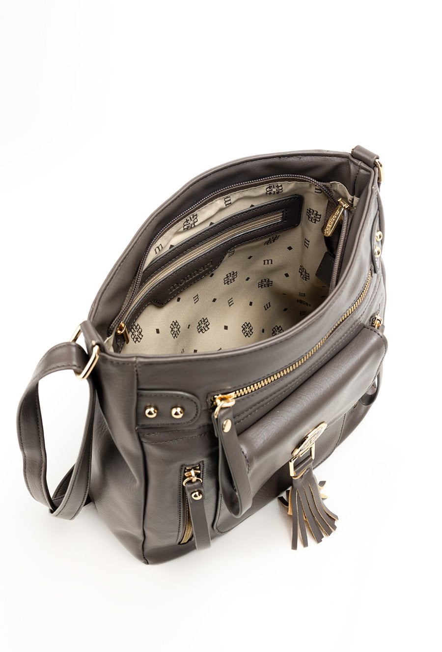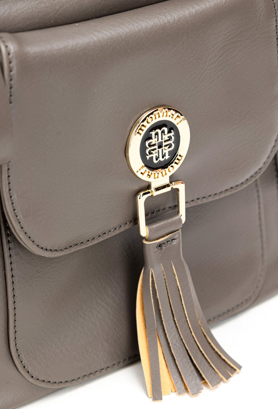Torba damska typu crossbody z paskiem. Torba jednokomorowa o jasnym logowanym wnętrzu z kieszonkami na drobiazgi. Dodatkowo zarówno z przodu jak i z tyłu znajdują się kieszenie. Atutem torby jest kieszonka z przodu z klapą, na której znajduje się biżuteryjne logo marki Monnari z frędzlami. Torbę należy przechowywać w załączonym woreczku. Wymiary: 30 cm x 27,5 cm x 7,5 cm.