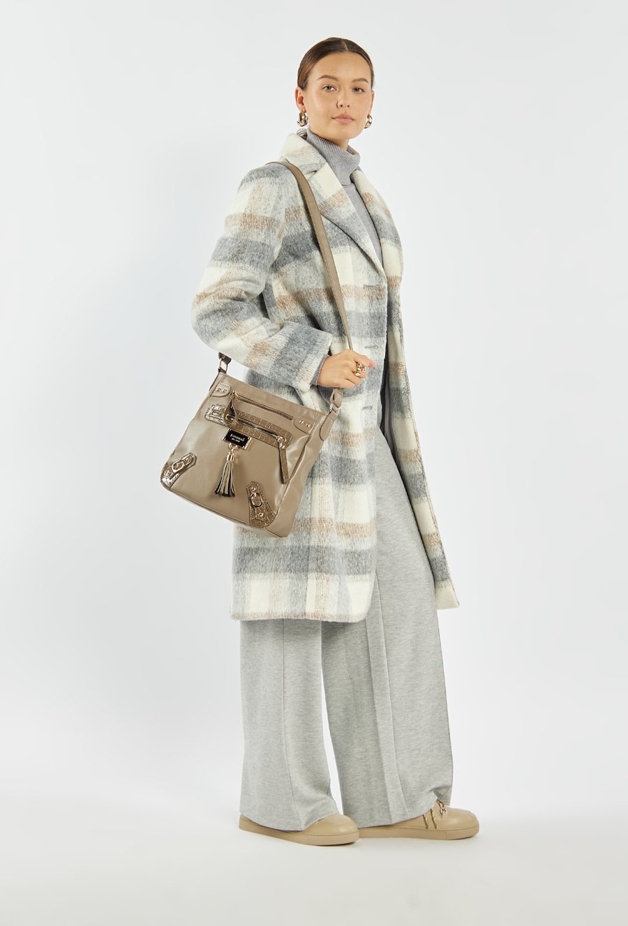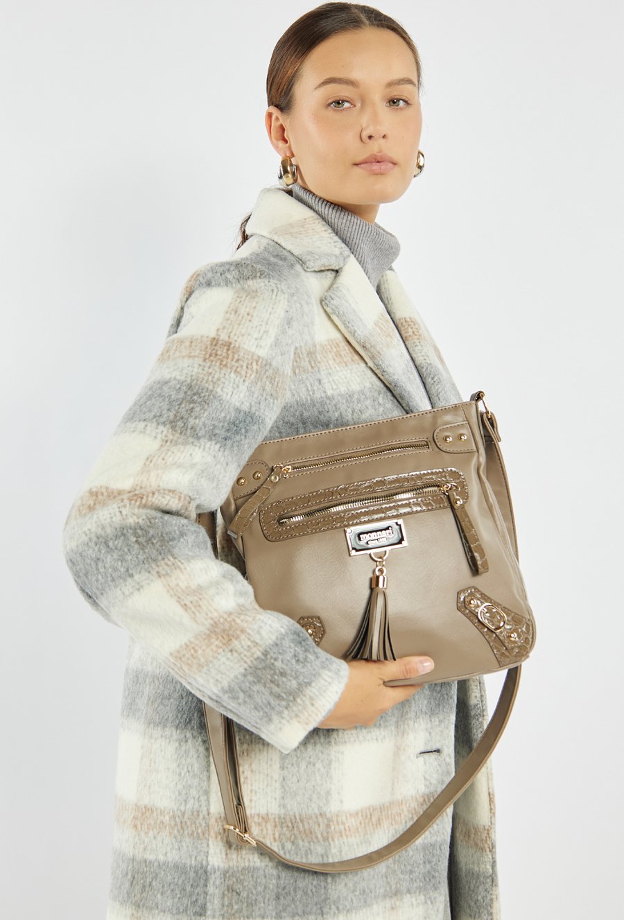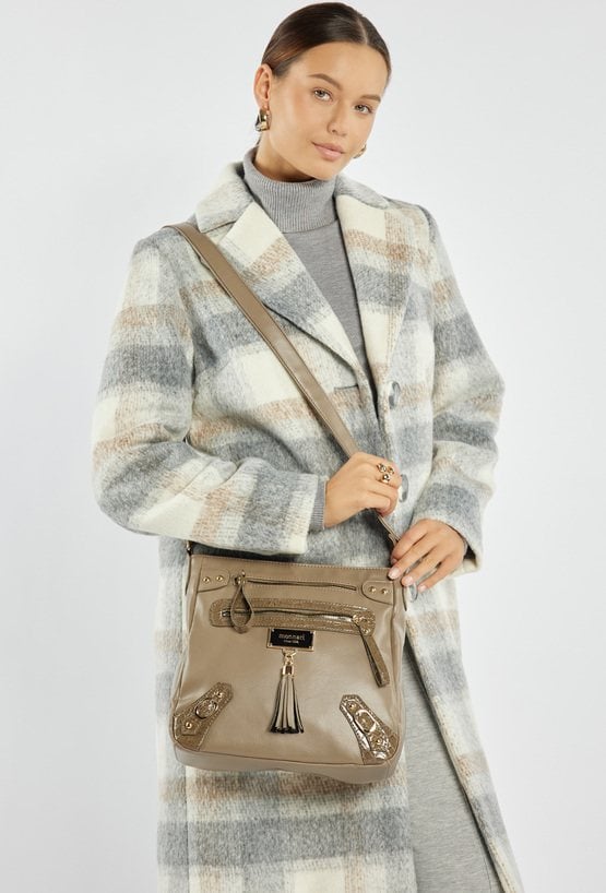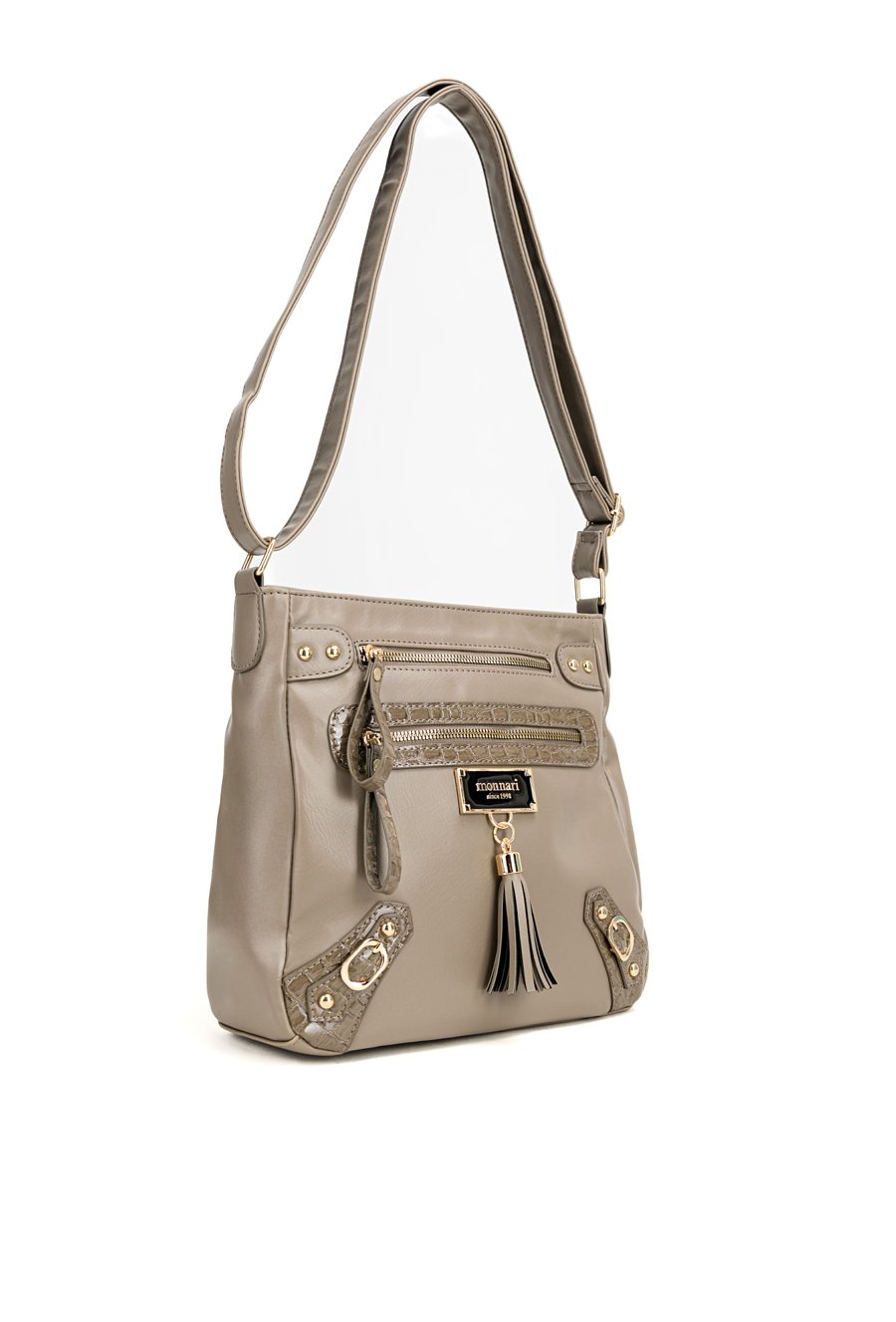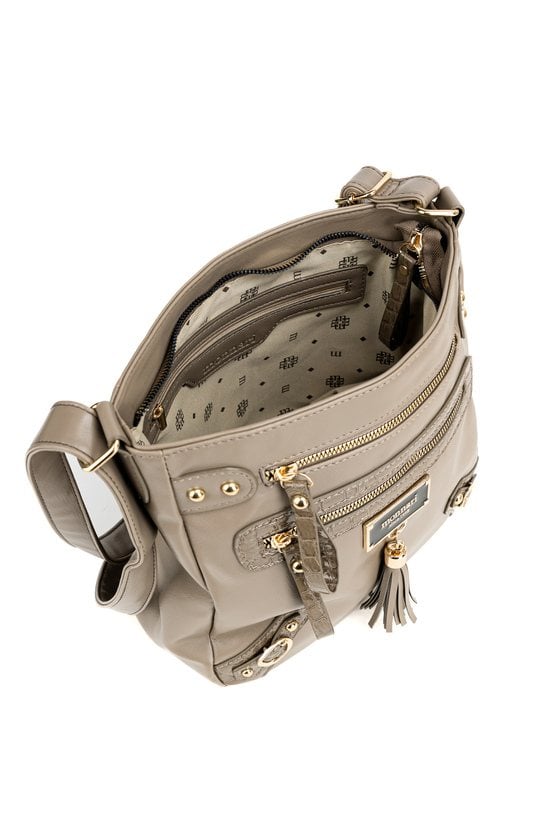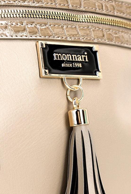 Torba damska crossbody, idealna na co dzień. Jednokomorowy model został wykończony jasną, logowaną podszewką oraz praktycznymi kieszonkami wewnętrznymi. Torba zawieszona jest na regulowanym pasku, co pozwala dopasować długość do indywidualnych preferencji. Uwagę przyciąga ozdobny detal- frędzle przytwierdzone do logo marki Monnari z przodu, dodające całości modnego, kobiecego charakteru. Należy przechowywać w załączonym woreczku. Wymiary: 28 cm x 27,5 cm x 8 cm.