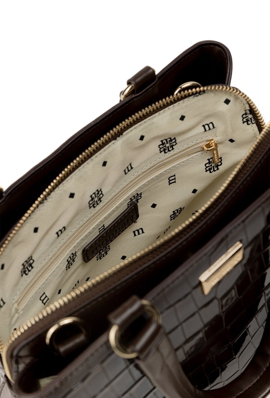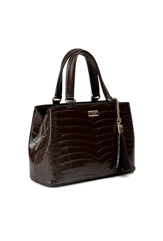 Torba damska z delikatnym wzorem i ozdobnymi frędzlami, które nadają jej subtelnego, kobiecego charakteru. Model trzykomorowy, z jasnymi, logowanymi podszewkami oraz dodatkowymi kieszonkami na drobiazgi. Jedna z komór jest zapinana na suwak, a dwie pozostałe na napy, co zapewnia wygodę i funkcjonalność. Torba zawieszona na rączkach, a w zestawie znajduje się regulowany pasek. Torbę należy przechowywać w dołączonym woreczku. Wymiary: 31 cm x 19 cm x 11 cm.