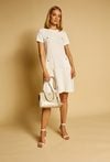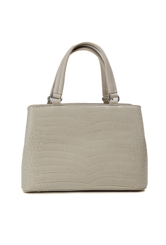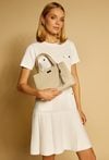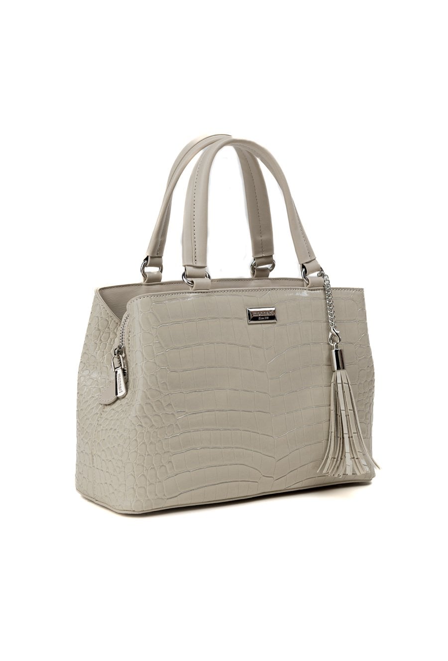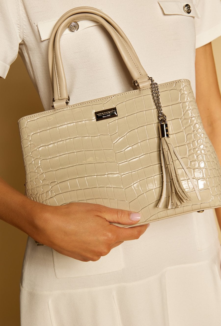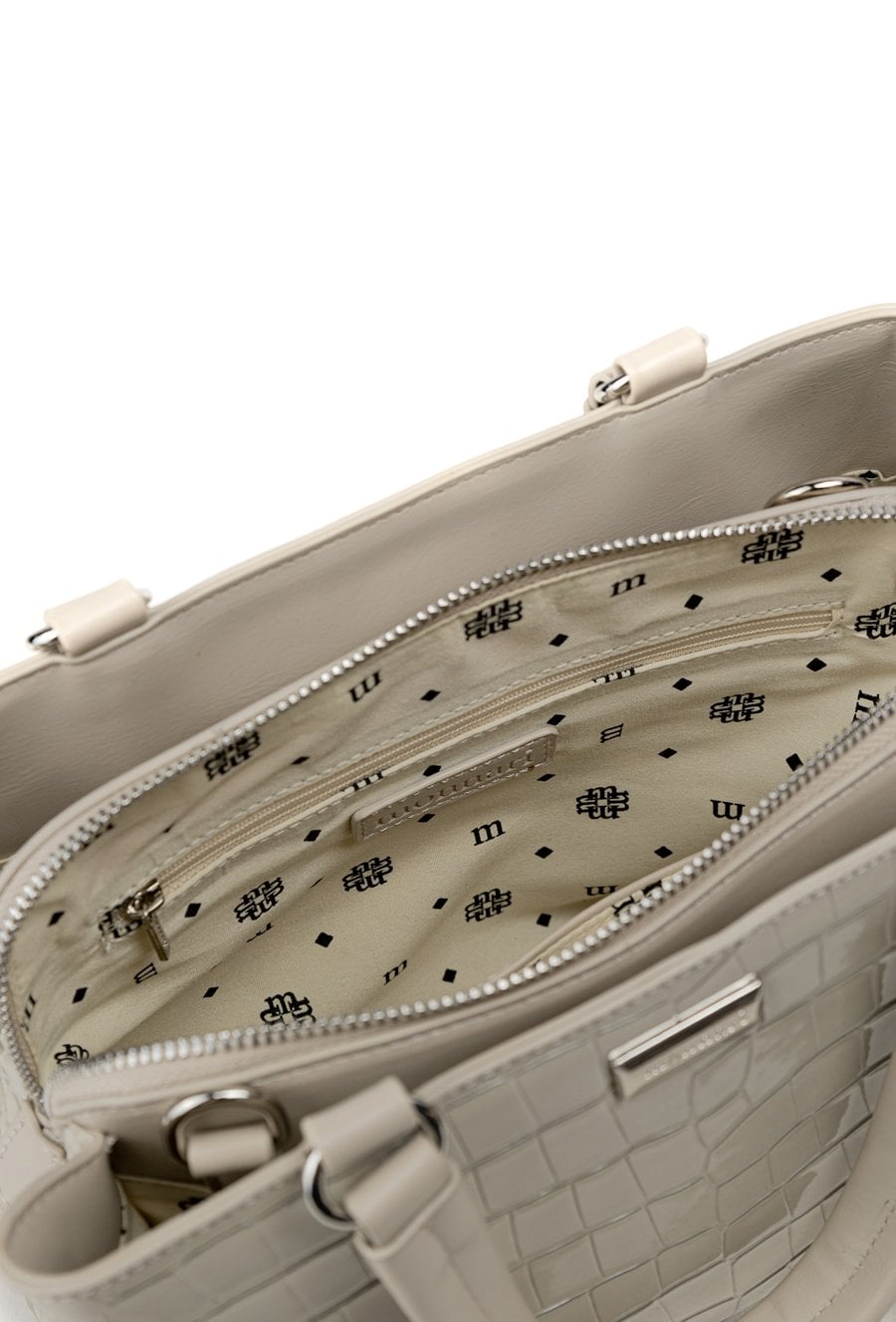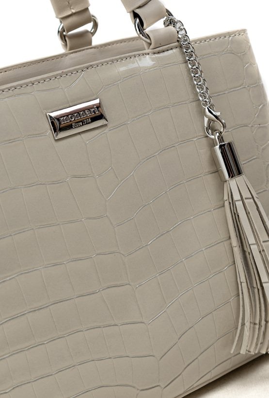 Torba damska z delikatnym wzorem i ozdobnymi frędzlami, które nadają jej subtelnego, kobiecego charakteru. Model trzykomorowy, z jasnymi, logowanymi podszewkami oraz dodatkowymi kieszonkami na drobiazgi. Jedna z komór jest zapinana na suwak, a dwie pozostałe na napy, co zapewnia wygodę i funkcjonalność. Torba zawieszona na rączkach, a w zestawie znajduje się regulowany pasek. Torbę należy przechowywać w dołączonym woreczku. Wymiary: 31 cm x 19 cm x 11 cm.