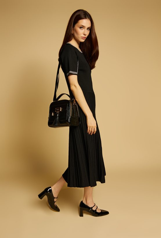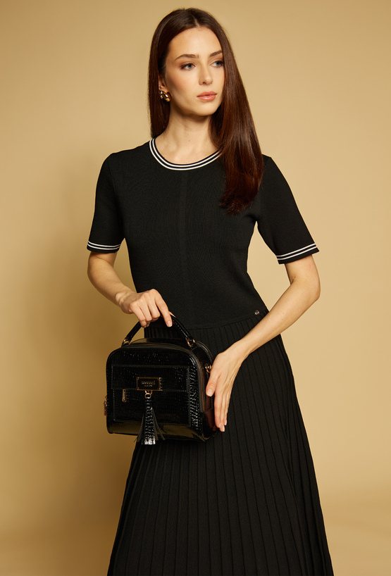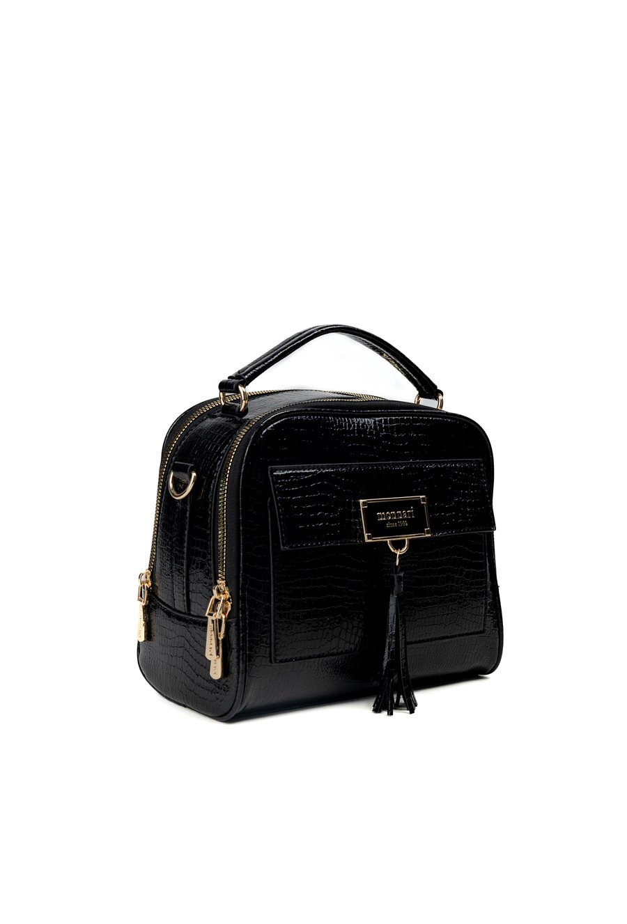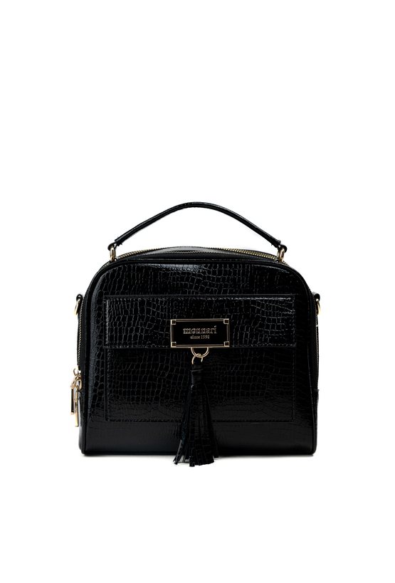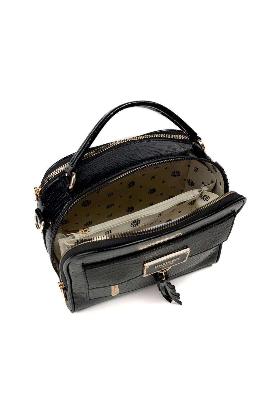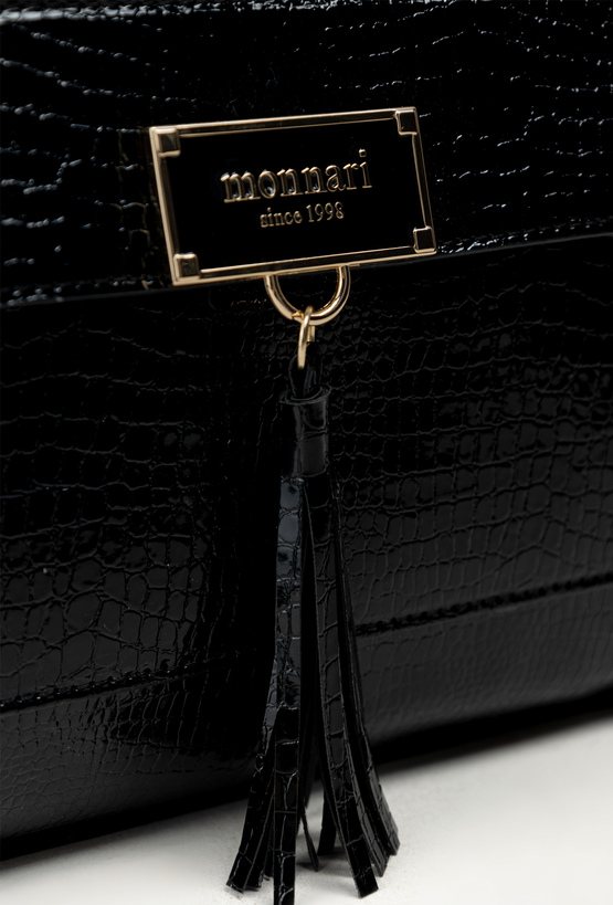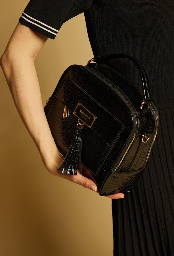 Torba damska z delikatnym wzorem. Torba dwukomorowa, z jasnymi, logowanymi podszewkami oraz dodatkowymi kieszonkami na drobiazgi. Torbę zdobią z przodu frędzle, które nadają jej lekkości i stylowego charakteru. Zawieszona na rączce, a w zestawie znajduje się regulowany pasek. Torbę należy przechowywać w załączonym woreczku.