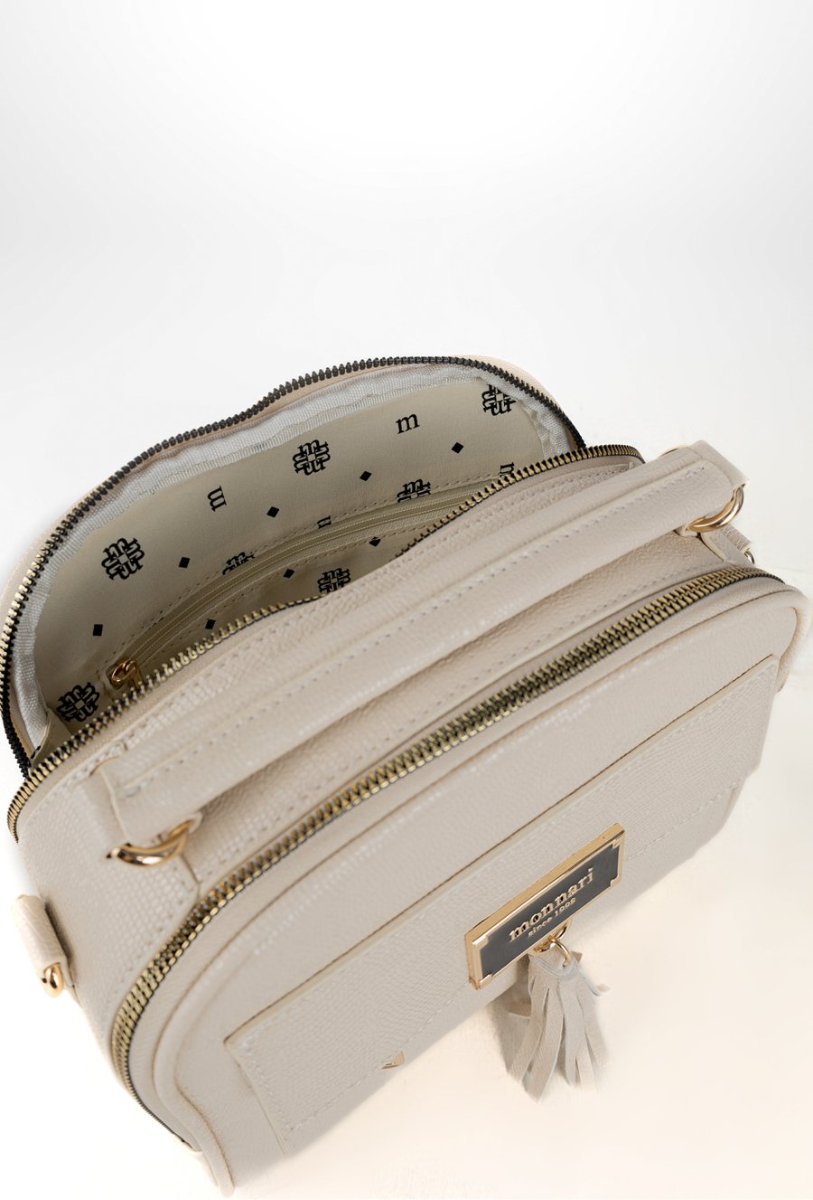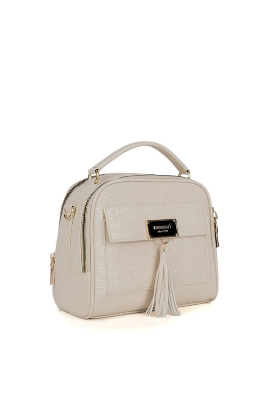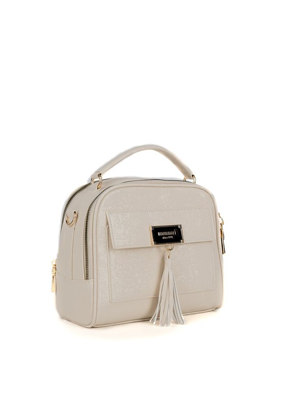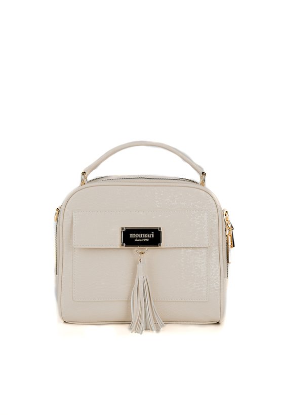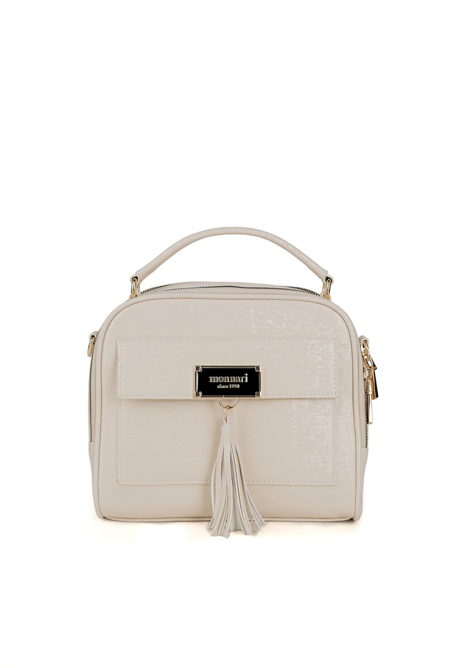 Torba damska z delikatnym wzorem. Torba dwukomorowa, z jasnymi, logowanymi podszewkami oraz dodatkowymi kieszonkami na drobiazgi. Torbę zdobią z przodu frędzle, które nadają jej lekkości i stylowego charakteru. Zawieszona na rączce, a w zestawie znajduje się regulowany pasek. Torbę należy przechowywać w załączonym woreczku. Wymiary: 22 cm x 21 cm x 10 cm