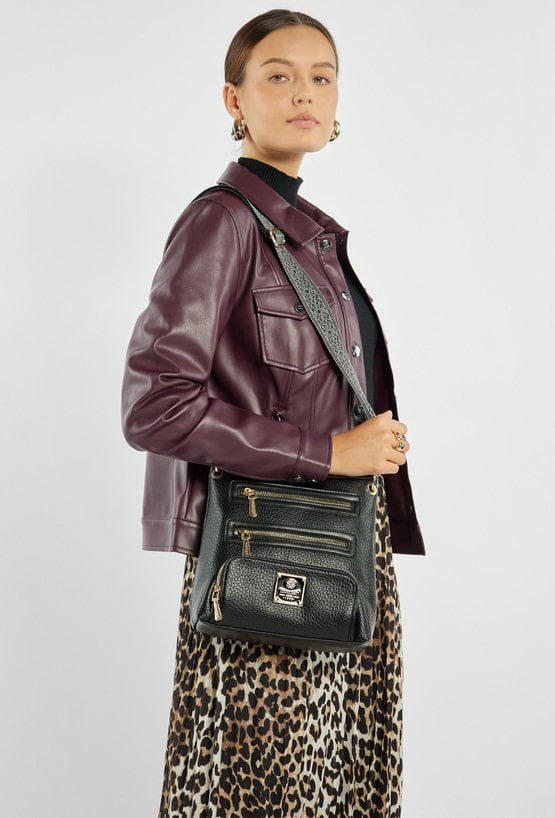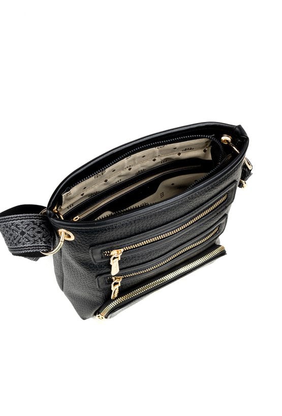 Damska torba typu crossbody to połączenie praktyczności i stylu w nowoczesnym wydaniu. Jednokomorowe wnętrze wykończone zostało jasną, logowaną podszewką oraz uzupełnione o dodatkowe kieszonki na drobiazgi, które pomagają w zachowaniu porządku. Z przodu znajdują się aż trzy funkcjonalne kieszenie, idealne na przedmioty, do których chcesz mieć szybki dostęp. Całość zawieszona jest na efektownym, wzorzystym pasku z możliwością regulacji. Torbę należy przechowywać w załączonym woreczku. Wymiary torby: 24 cm x 25 cm x 10 cm.