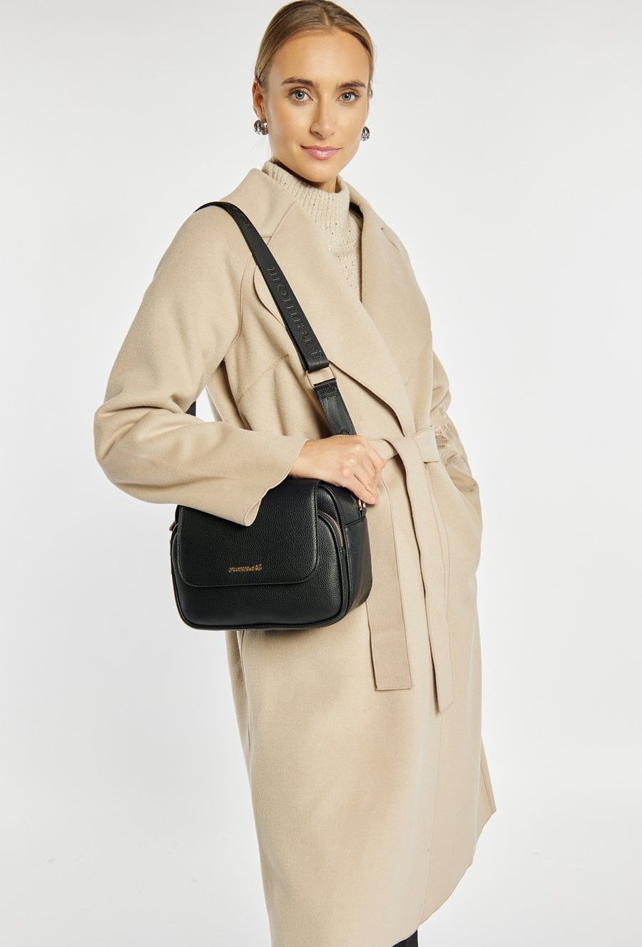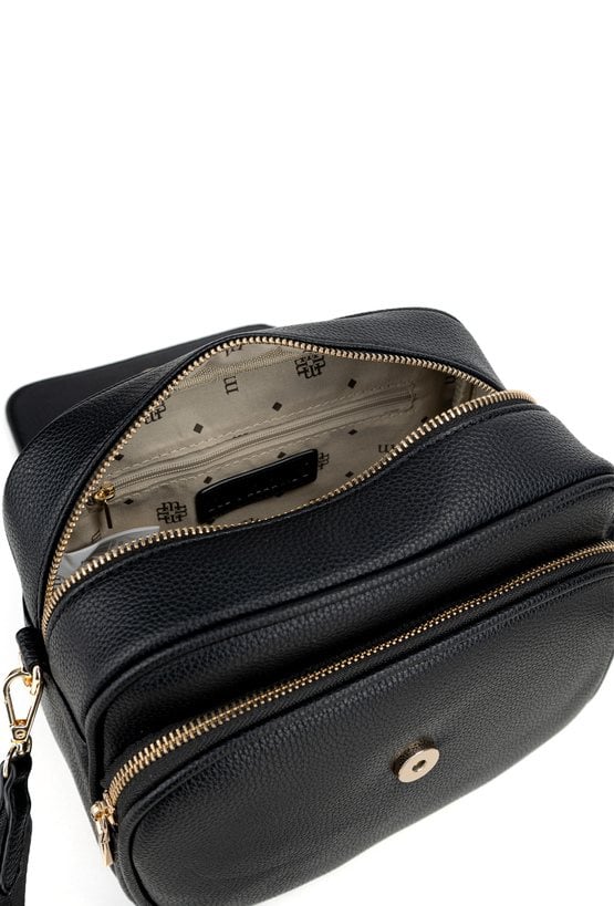 Torba damska z klapą. Jednokomorowy model z jasną, logowaną podszewką oraz praktycznymi kieszonkami na drobiazgi. Zapięcie na suwak dodatkowo zwiększa bezpieczeństwo przechowywanych rzeczy. Regulowany pasek z możliwością odpięcia pozwala dopasować sposób noszenia do własnych potrzeb. Torbę należy przechowywać w dołączonym woreczku Wymiary: 22 cm x 19 cm x 13 cm.