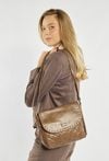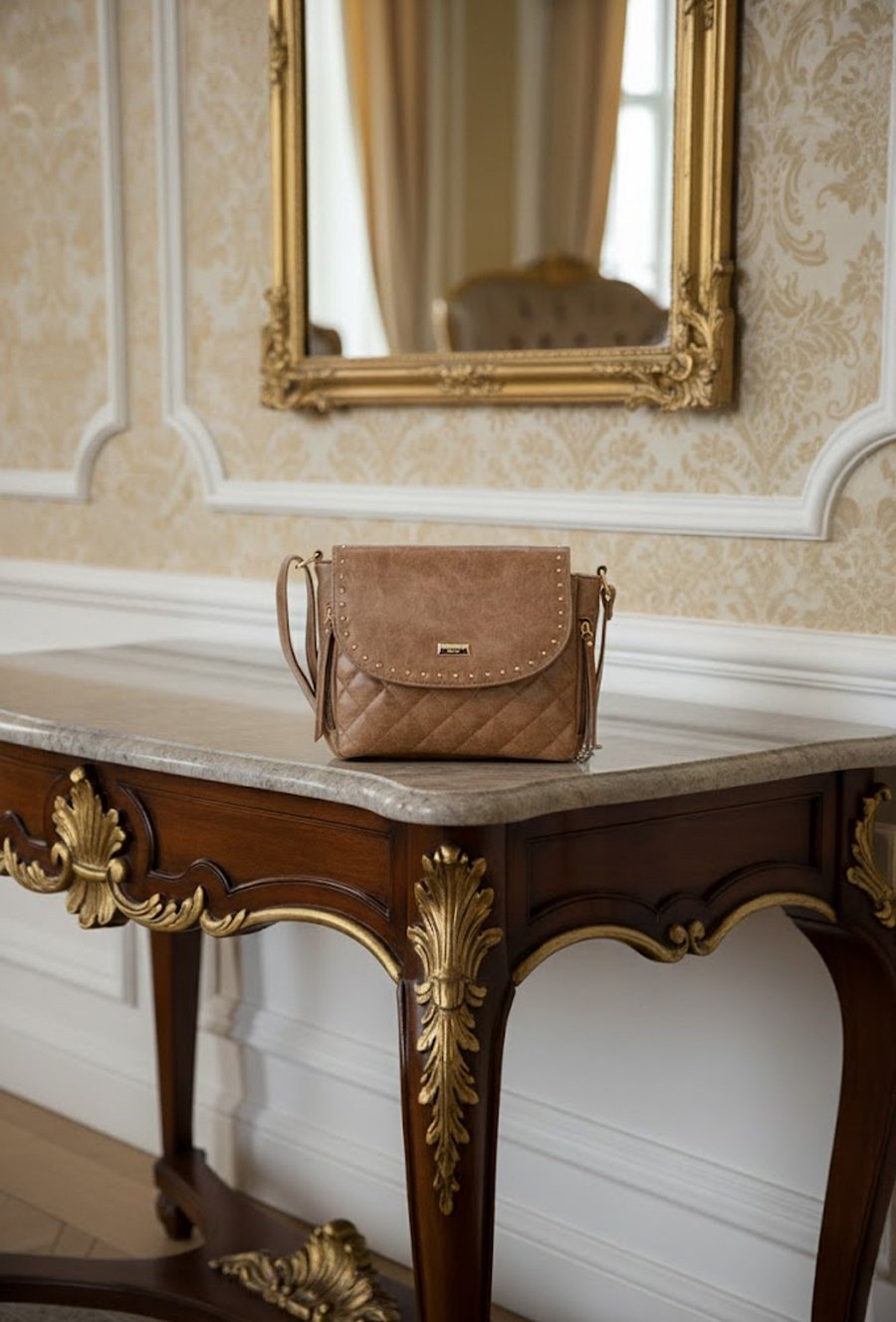 Torba damska z klapą, zawieszona na pasku. Jednokomorowy model z jasną, logowaną podszewką oraz dodatkowymi kieszonkami na drobiazgi. Klapę zdobią subtelne ćwieki, a pikowany przód nadaje całości stylowego charakteru. Torbę należy przechowywać w dołączonym woreczku. Wymiary: 29 cm x 23 cm x 9 cm.
