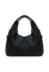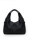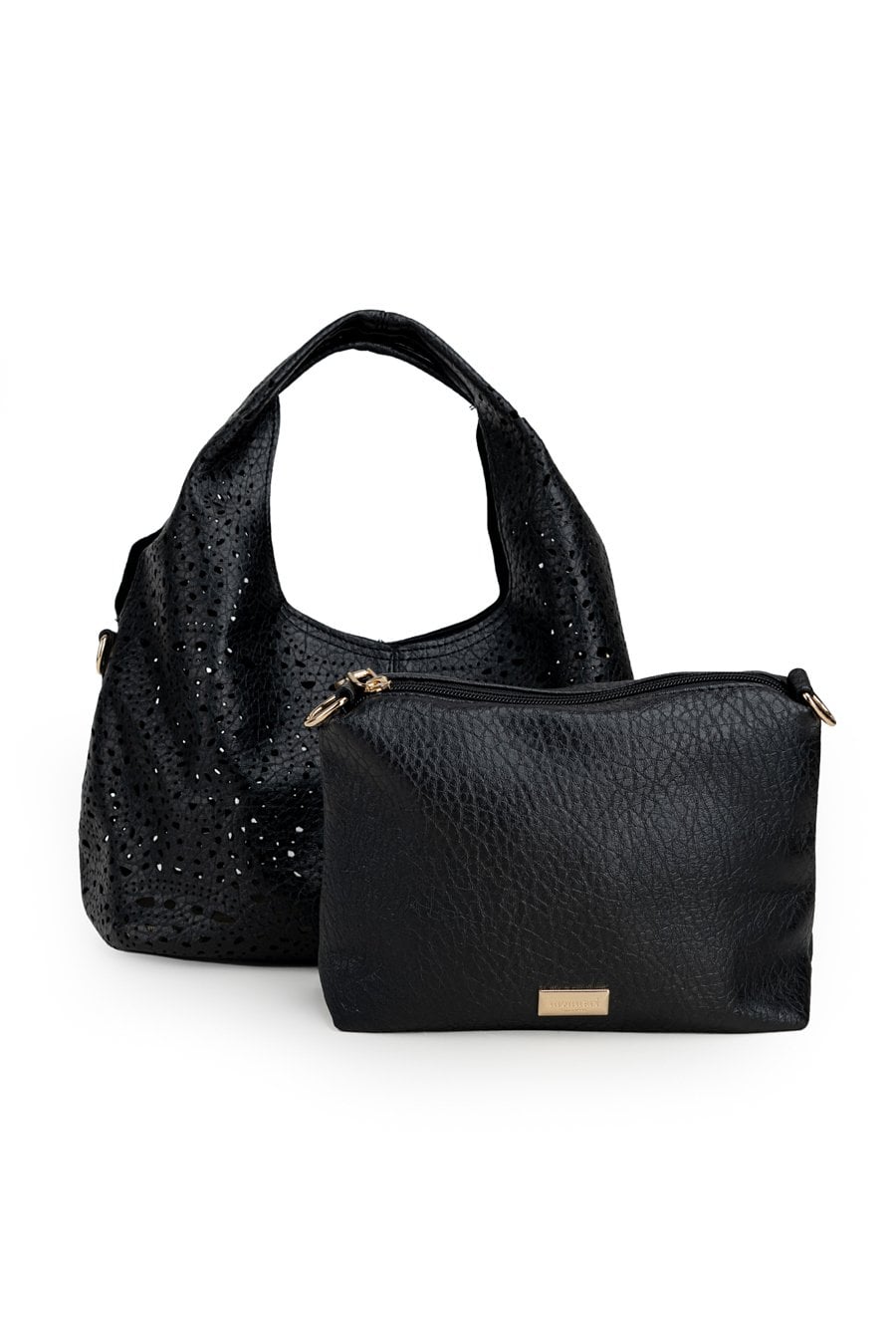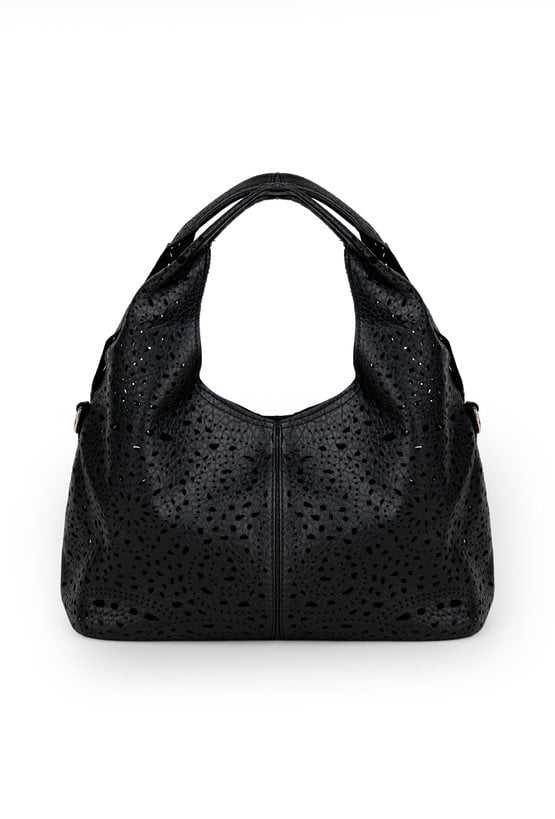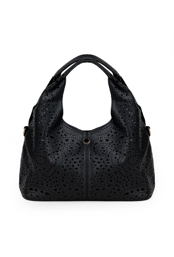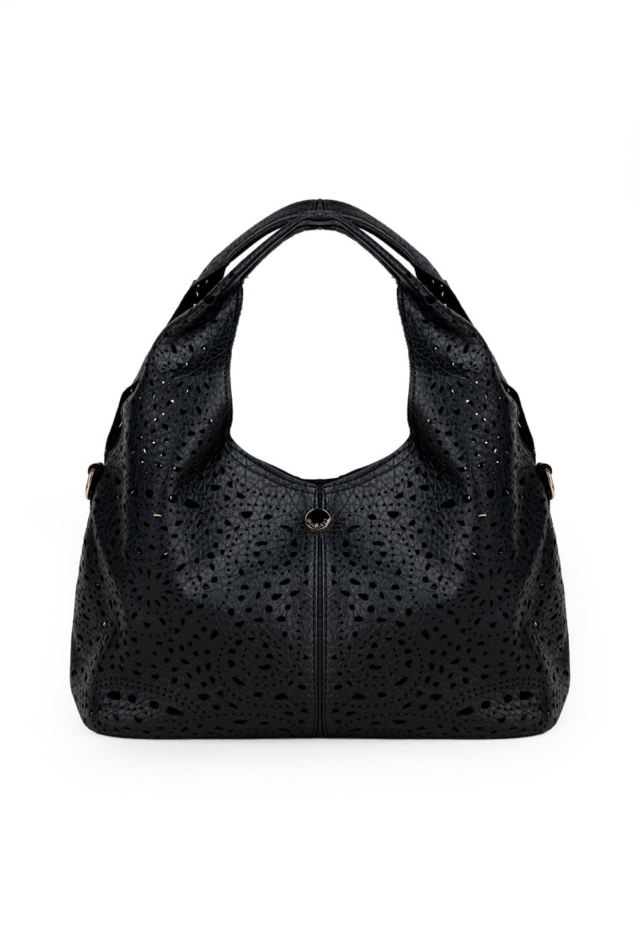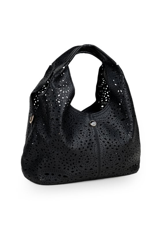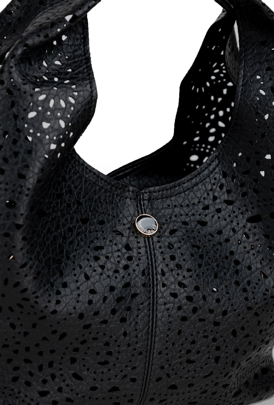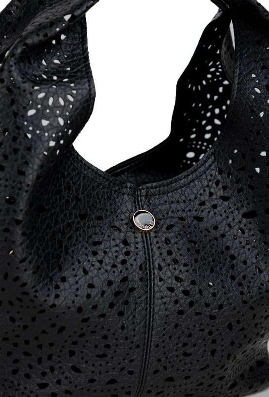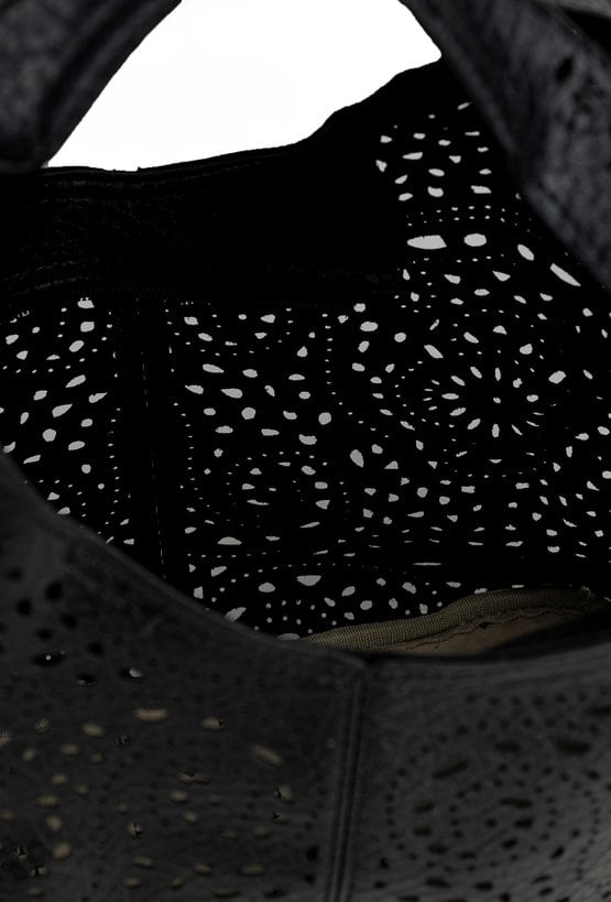 Ażurowa torba damska idealna na co dzień. Jednokomorowy model zapinany na suwak, zawieszony na rączkach. W zestawie regulowany, odpinany pasek oraz dodatkowa mała torebka w środku, do której również można przypiąć pasek i nosić ją jako crossbody. Torbę należy przechowywać w dołączonym woreczku. Wymiary: 32 cm x 17,5 cm x 12 cm