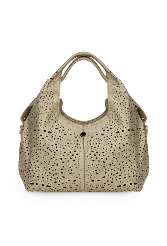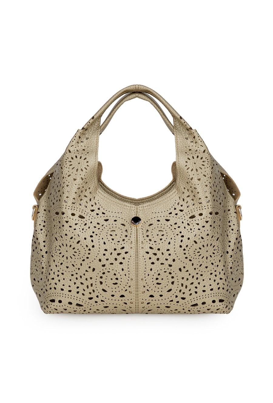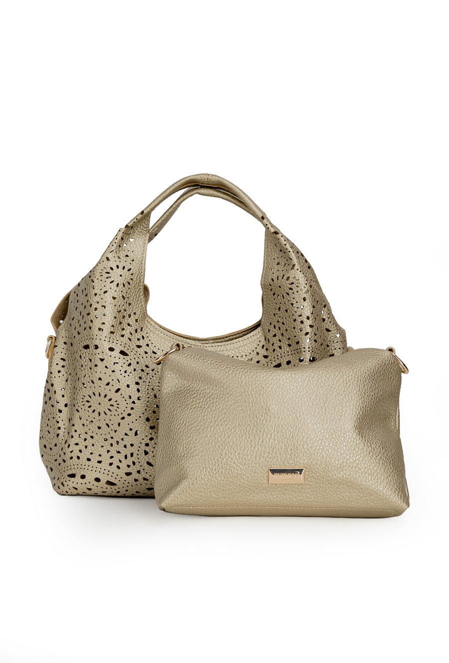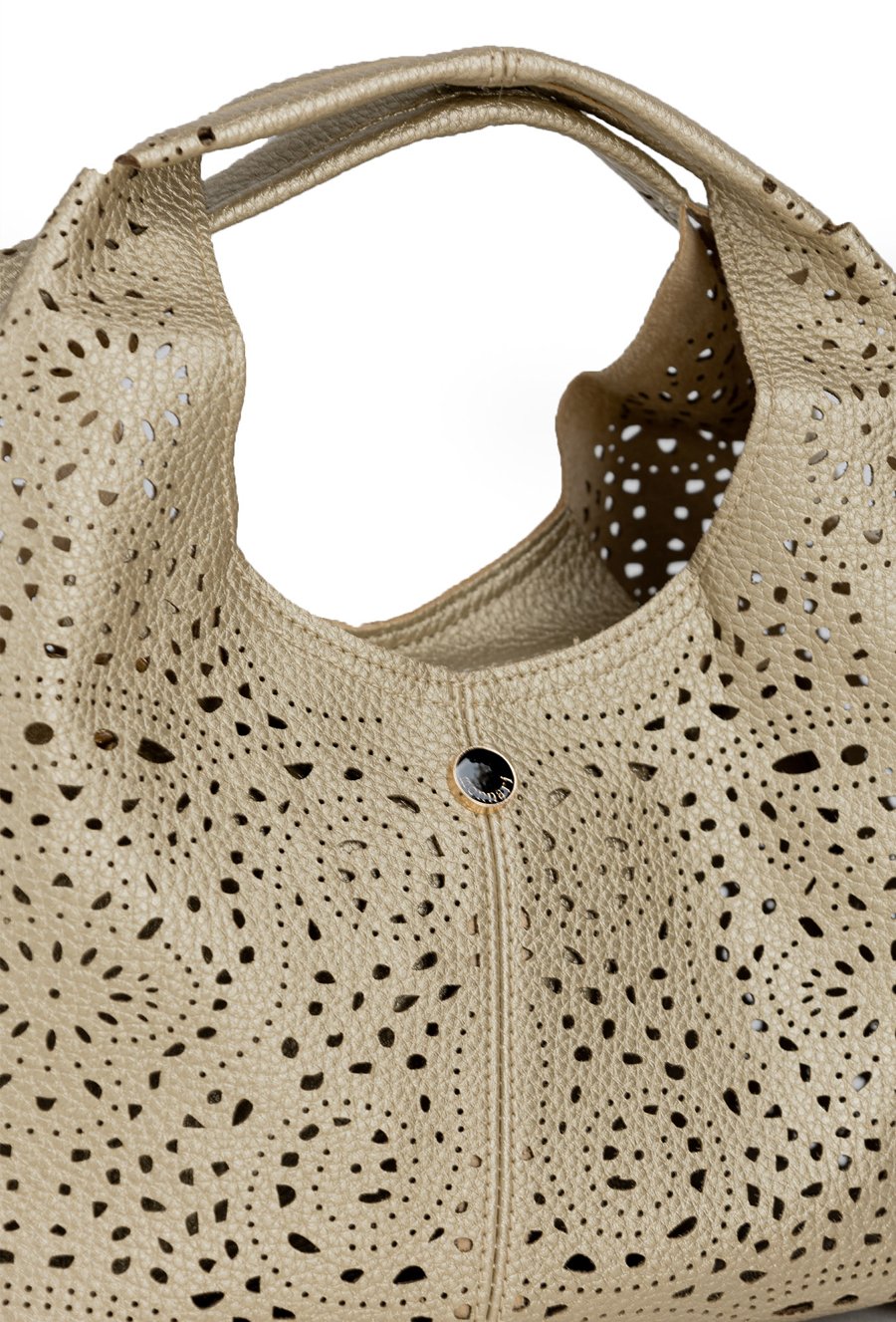 Ażurowa torba damska idealna na co dzień. Jednokomorowy model zapinany na suwak, zawieszony na rączkach. W zestawie regulowany, odpinany pasek oraz dodatkowa mała torebka w środku, do której również można przypiąć pasek i nosić ją jako crossbody. Torbę należy przechowywać w dołączonym woreczku. Wymiary: 32 cm x 17,5 cm x 12 cm