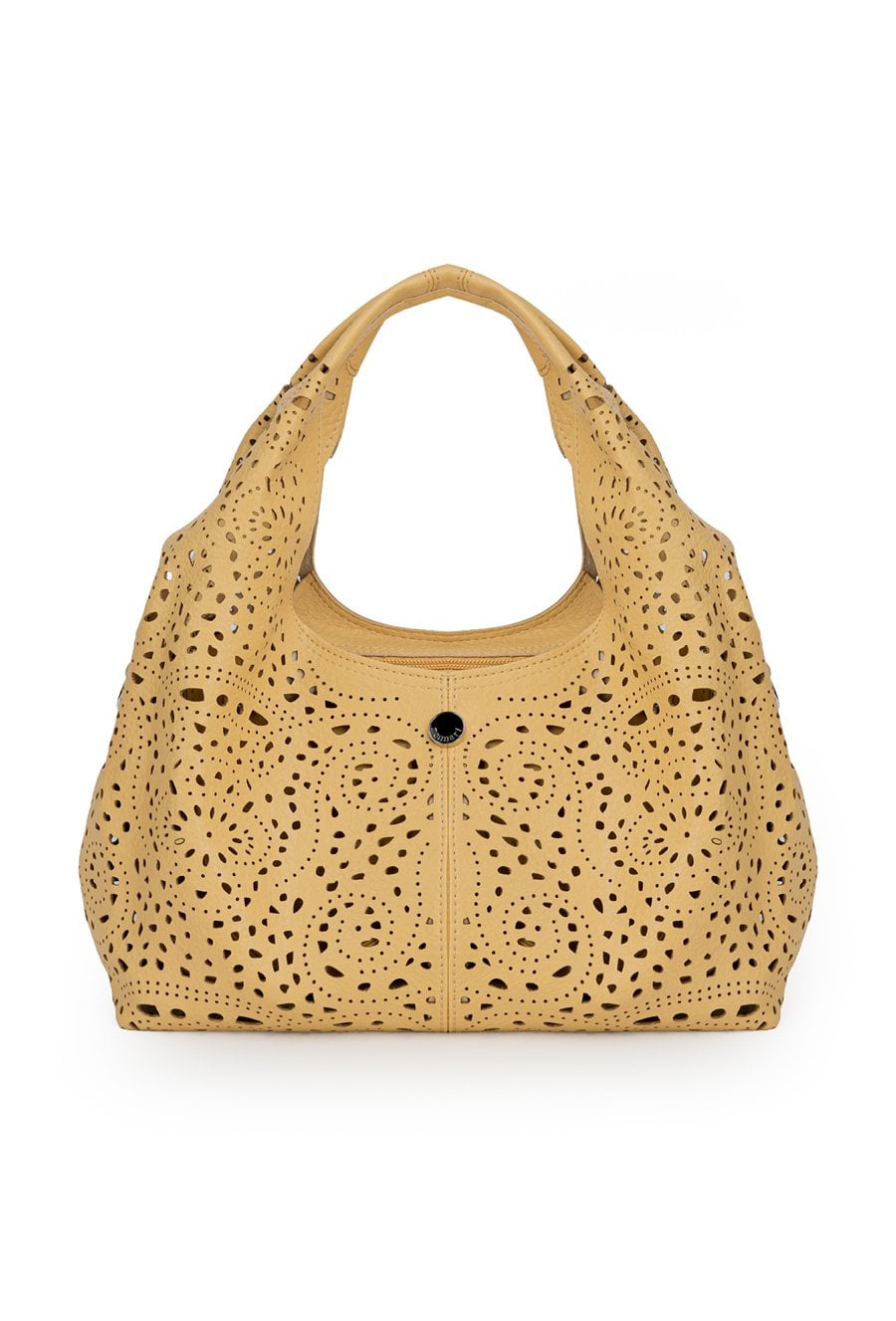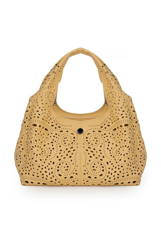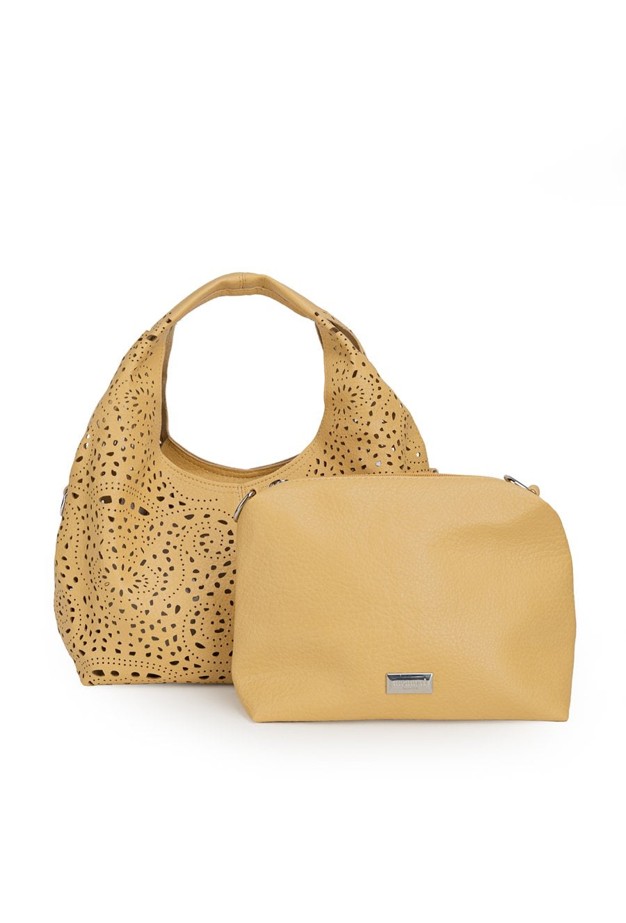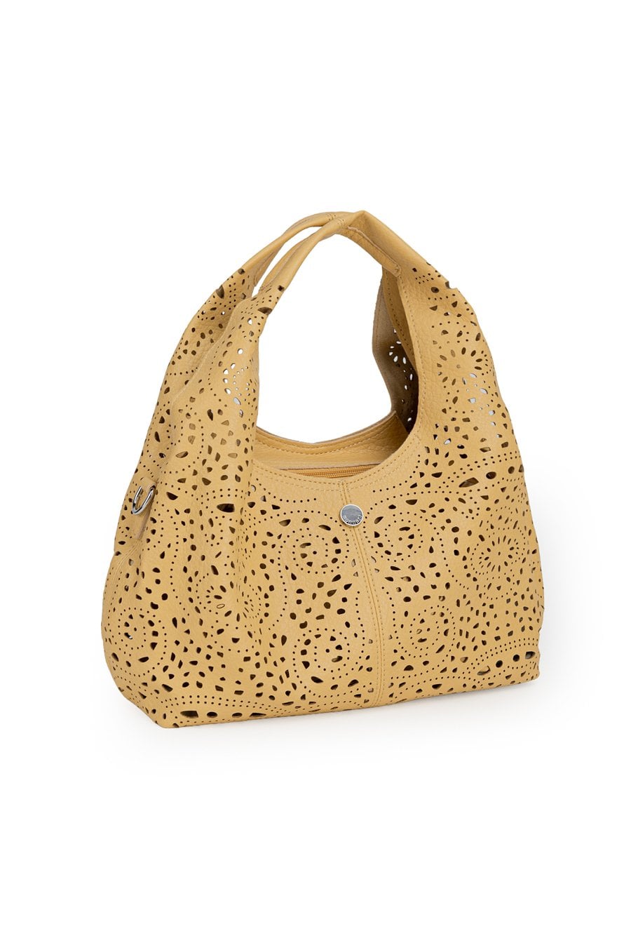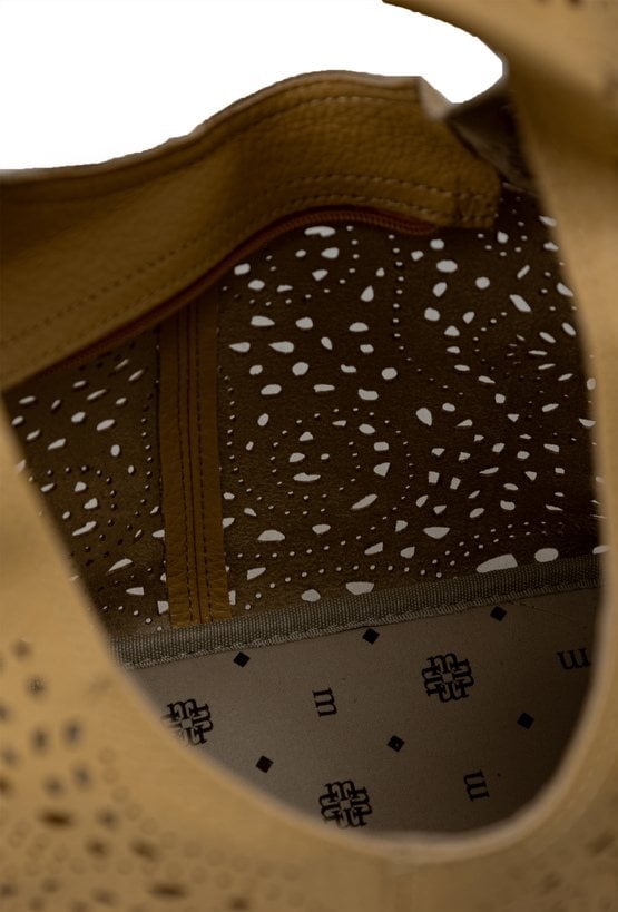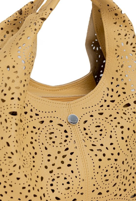 Ażurowa torba damska idealna na co dzień. Jednokomorowy model zapinany na suwak, zawieszony na rączkach. W zestawie regulowany, odpinany pasek oraz dodatkowa mała torebka w środku, do której również można przypiąć pasek i nosić ją jako crossbody. Torbę należy przechowywać w dołączonym woreczku. Wymiary: 32 cm x 17,5 cm x 12 cm
