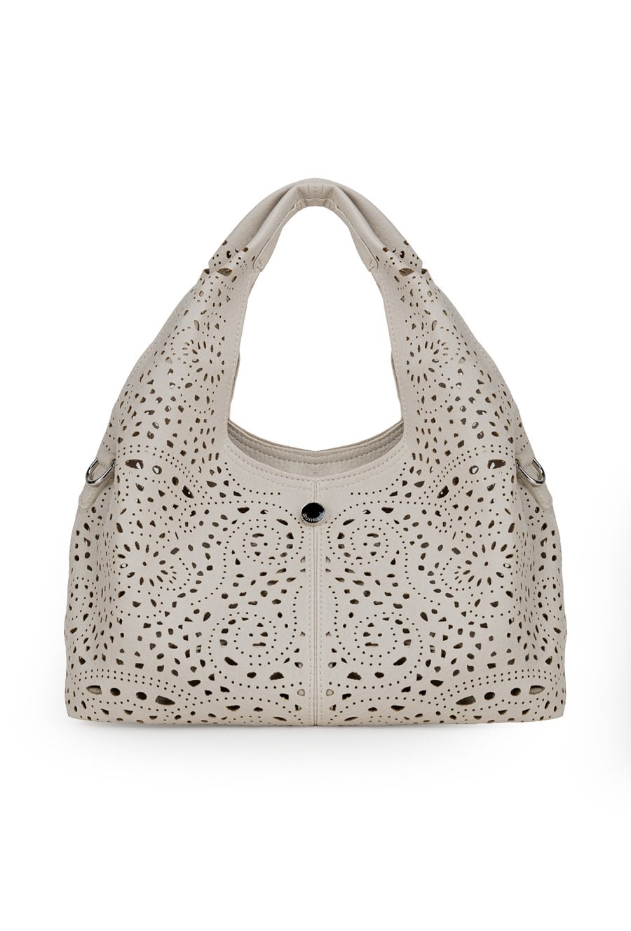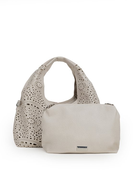 Ażurowa torba damska idealna na co dzień. Jednokomorowy model zapinany na suwak, zawieszony na rączkach. W zestawie regulowany, odpinany pasek oraz dodatkowa mała torebka w środku, do której również można przypiąć pasek i nosić ją jako crossbody. Torbę należy przechowywać w dołączonym woreczku. Wymiary: 32 cm x 17,5 cm x 12 cm