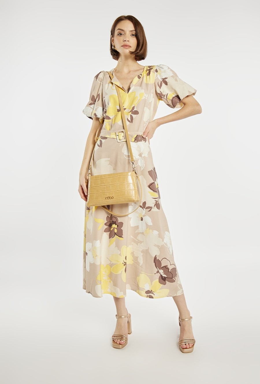 Damska torba z ciekawym wzorem, idealna na co dzień. Jednokomorowe wnętrze z jasną, logowaną podszewką wyposażono w dodatkowe kieszonki na drobiazgi. Torba zawieszona na rączce oraz regulowanym pasku- oba elementy można odpiąć. Wymiary torby: 27 cm x 15,5 cm x 6 cm.