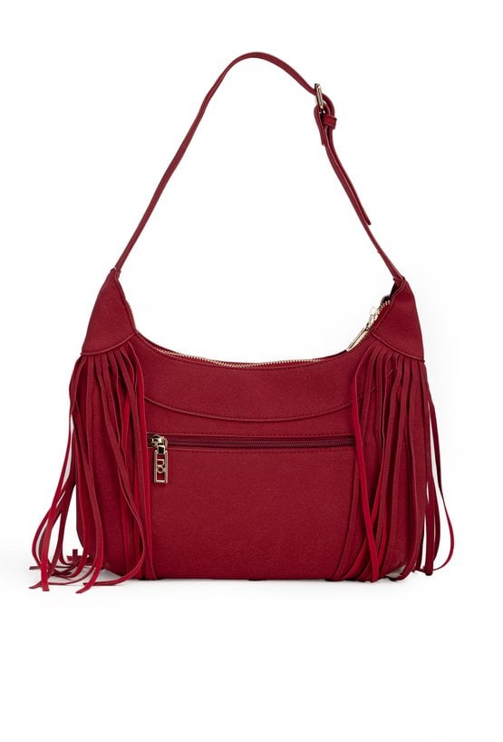 Torba damska z frędzlami, idealna na co dzień. Jednokomorowy model z jasną, logowaną podszewką oraz dodatkowymi kieszonkami na drobiazgi. Torebka zawieszona na regulowanej rączce. Frędzle nadają jej ciekawego charakteru. Torbę należy przechowywać w dołączonym woreczku. Wymiary: 32 cm x 19 cm x 5 cm
