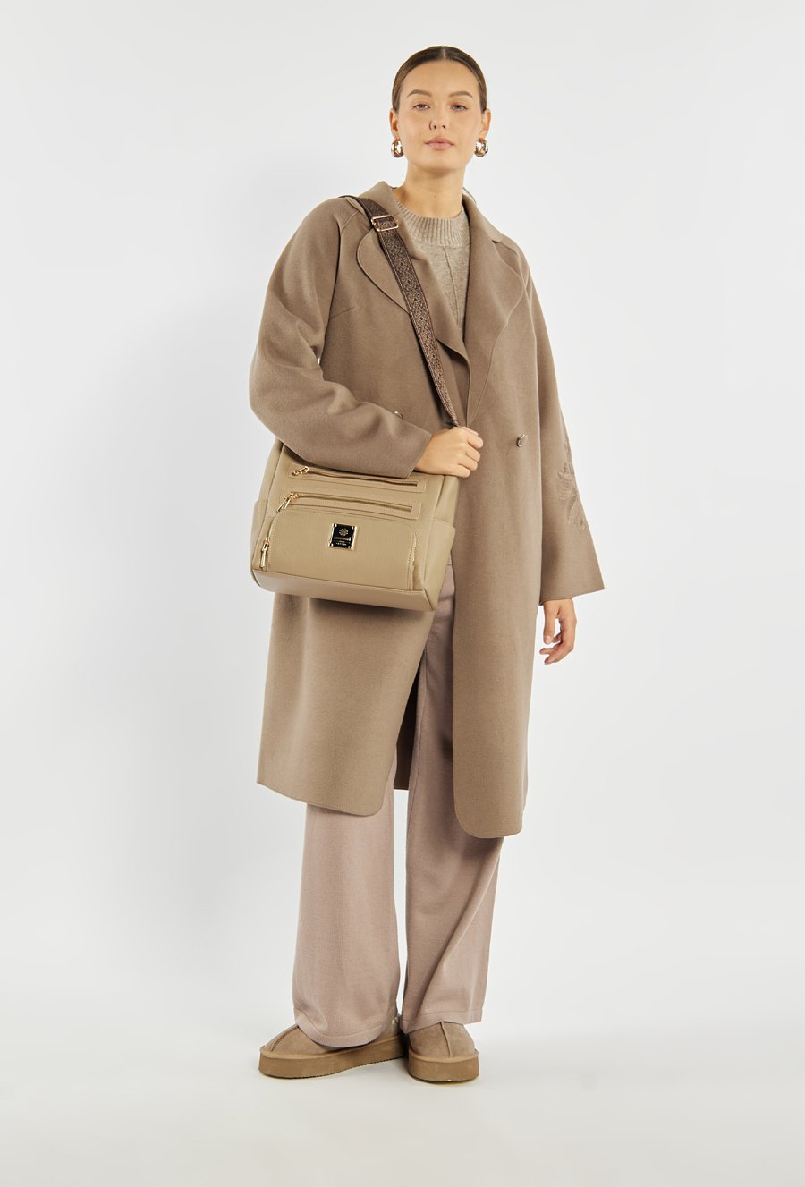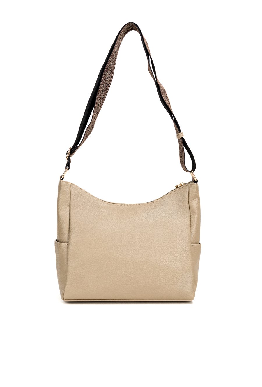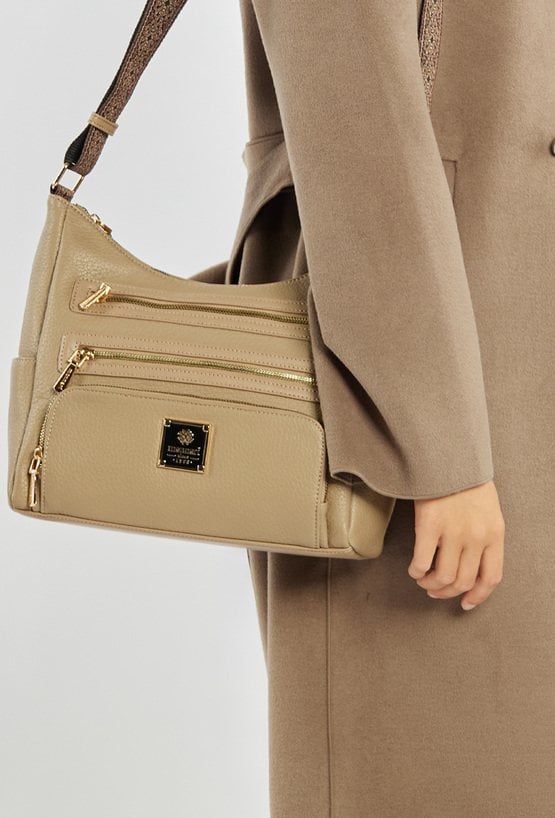 Damska torba z kieszonkami, idealna na co dzień, łączy wygodę użytkowania z ponadczasowym stylem. Jednokomorowe wnętrze zostało wykończone jasną, logowaną podszewką i uzupełnione o praktyczne kieszonki na drobiazgi, które pomagają w codziennej organizacji. Model zawieszony jest na szerokim, materiałowym pasku z możliwością regulacji, co pozwala na komfortowe dopasowanie do sylwetki i preferowanego sposobu noszenia. Torbę należy przechowywać w załączonym woreczku. Wymiary torby: 34 cm x 23 cm x 13 cm.